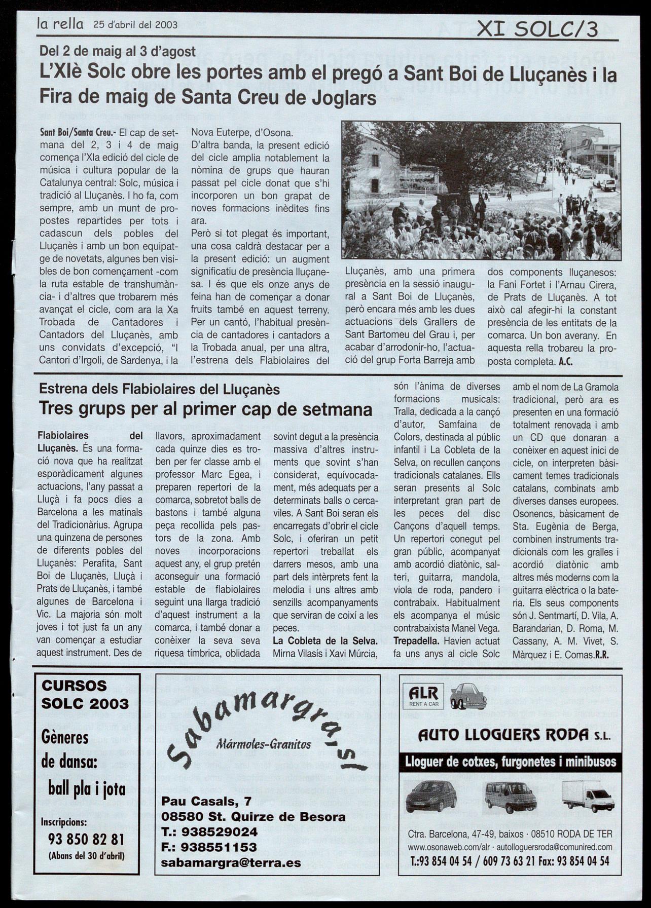 Sant Boi de Uucanès.- Solc-2003. Pregó inaugural de I'll è cicle Solc, música tradició al Lluçanès, a càrrec de Ramon Montanyà, advocat primer alcalde de I'època democràtica de la ciutat de Vic. A les 9 del vespre, a l'església parroquial. Seguidament, actuació dels "Flabiolaires del Lluçanès" i de "la Cobleta de la Selva".