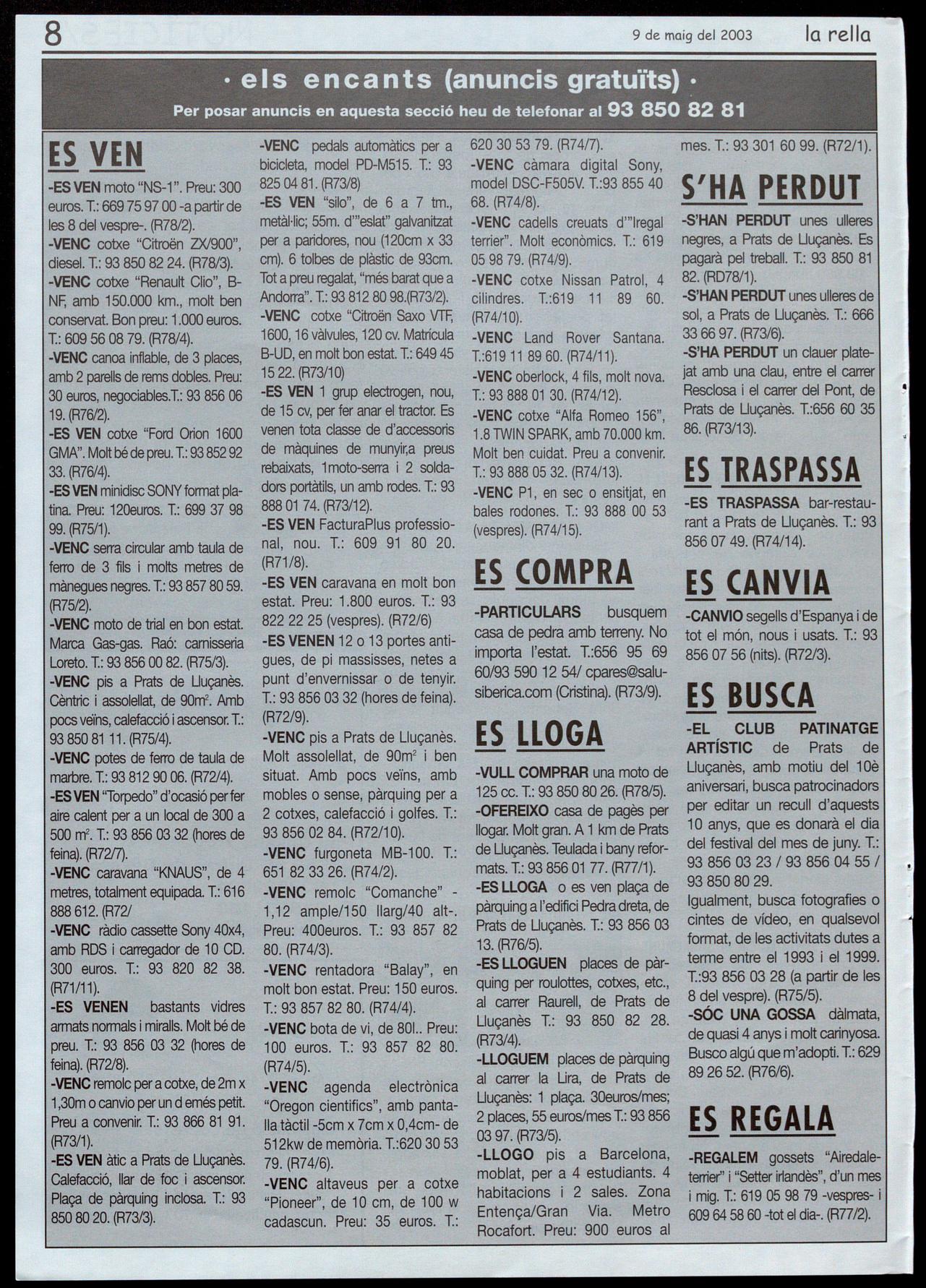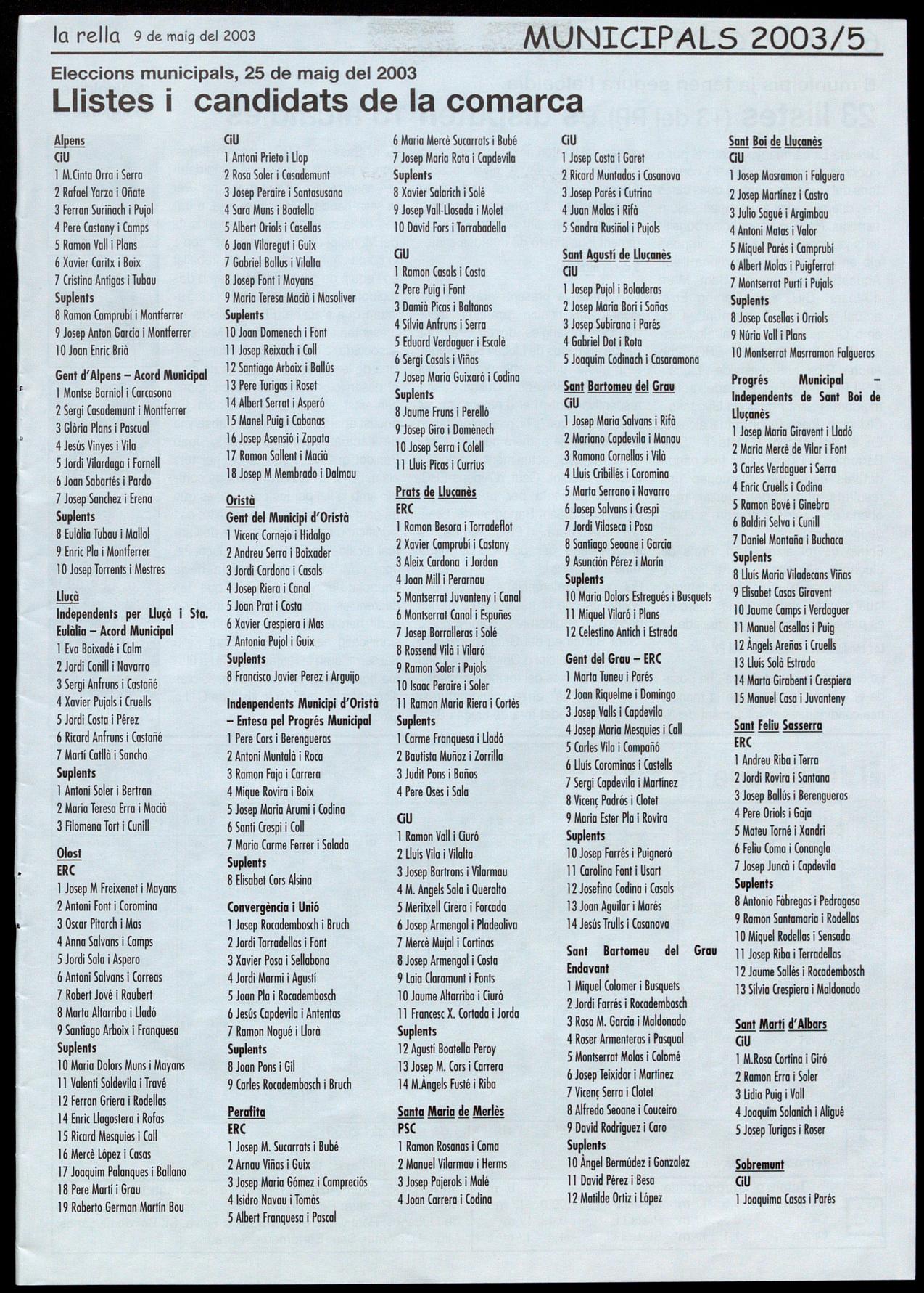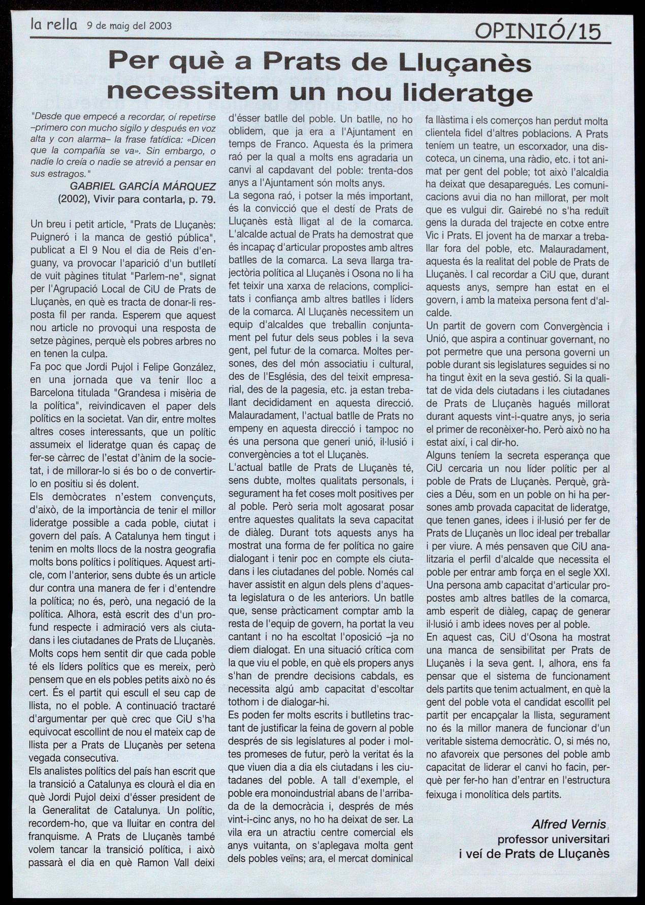 d'ésser batlle del poble. Un batlle, no ho oblidem, que ja era a l'Ajuntament en temps de Franco. Aquesta és la primera raó per la qual a molts ens agradaria un canvi al capdavant del poble: trenta-dos anys a l'Ajuntament són molts anys. La segona raó, potser la més important, és la convicció que el destí de Prats de Lluçanès està lligat al de la comarca. L'alcalde actual de Prats ha demostrat que és incapaç d'articular propostes amb altres batlles de la comarca. La seva llarga trajectòria política al Lluçanès Osona no li ha fet teixir una xarxa de relacions, complicitats i confiança amb altres batlles líders de la comarca. AI Lluçanès necessitem un equip d'alcaldes que treballin conjuntament pel futur dels seus pobles i la seva gent, pel futur de la comarca. Moltes persones, des del món associatiu i cultural, des de l'Església, des del teixit empresarial, des de la pagesia, etc. ja estan treballant decididament en aquesta direcció. Malauradament, l'actual batlle de Prats no empenyen aquesta direcció tampoc no és una persona que generi unió, il-lusió i convergències a tot el Lluçanès. L'actual batlle de Prats de Lluçanès té, sens dubte, moltes qualitats personals, i segurament ha fet coses molt positives per al poble. Però seria molt agosarat posar entre aquestes qualitats la seva capacitat de diàleg. Durant tots aquests anys ha mostrat una forma de fer política no gaire dialogant i tenir poc en compte els ciutadans les ciutadanes del poble. Només cal haver assistit en algun dels plens d'aquesta legislatura o de les anteriors. Un batlle que, sense pràcticament comptar amb la resta de l'equip de govern, ha portat la veu cantant no ha escoltat l'oposició -ja no diem dialogat. En una situació crítica com la que viu el poble, en què els propers anys s'han de prendre decisions cabdals, es necessita algú amb capacitat d'escoltar tothom de dialogar-hi. Es poden fer molts escrits butlletins tractant de justificar la feina de govern al poble després de sis legislatures al poder moltes promeses de futur, però la veritat és la que viuen dia a dia els ciutadans les ciutadanes del poble. A tall d'exemple, el poble era monoindustrial abans de l'arribada de la democràcia i, després de més vint-i-cinc anys, no ho ha deixat de ser. La vila era un atractiu centre comercial els anys vuitanta, on s'aplegava molta gent dels pobles veïns; ara, el mercat dominical