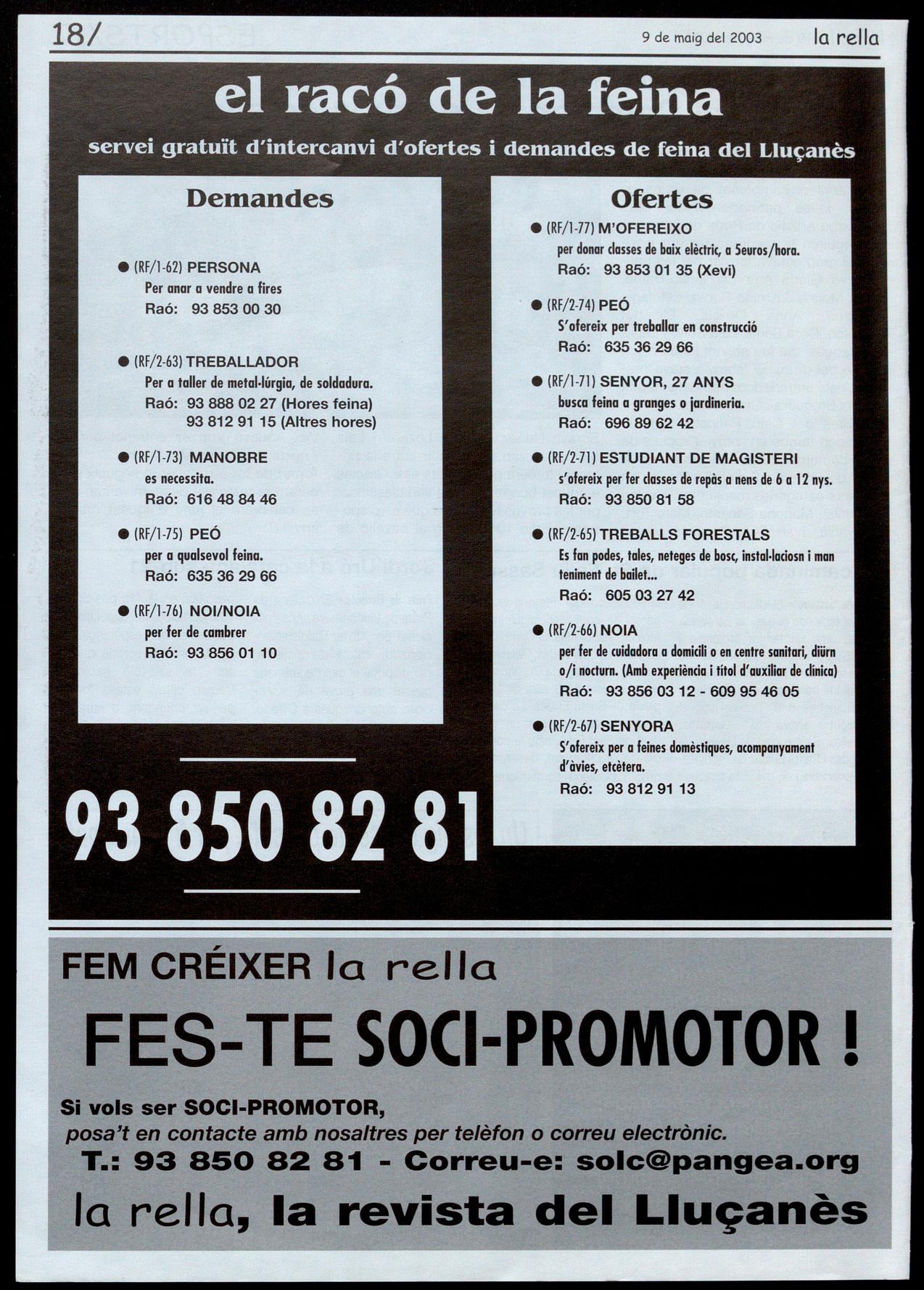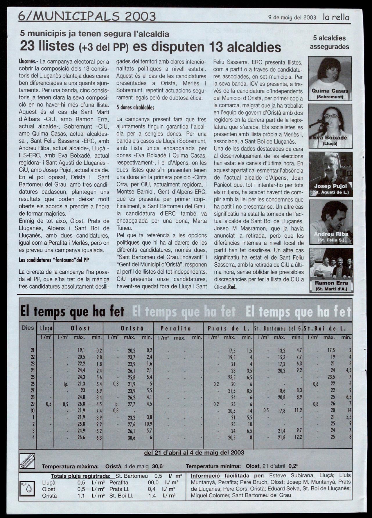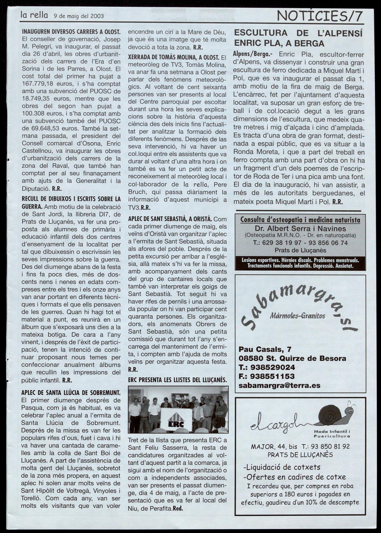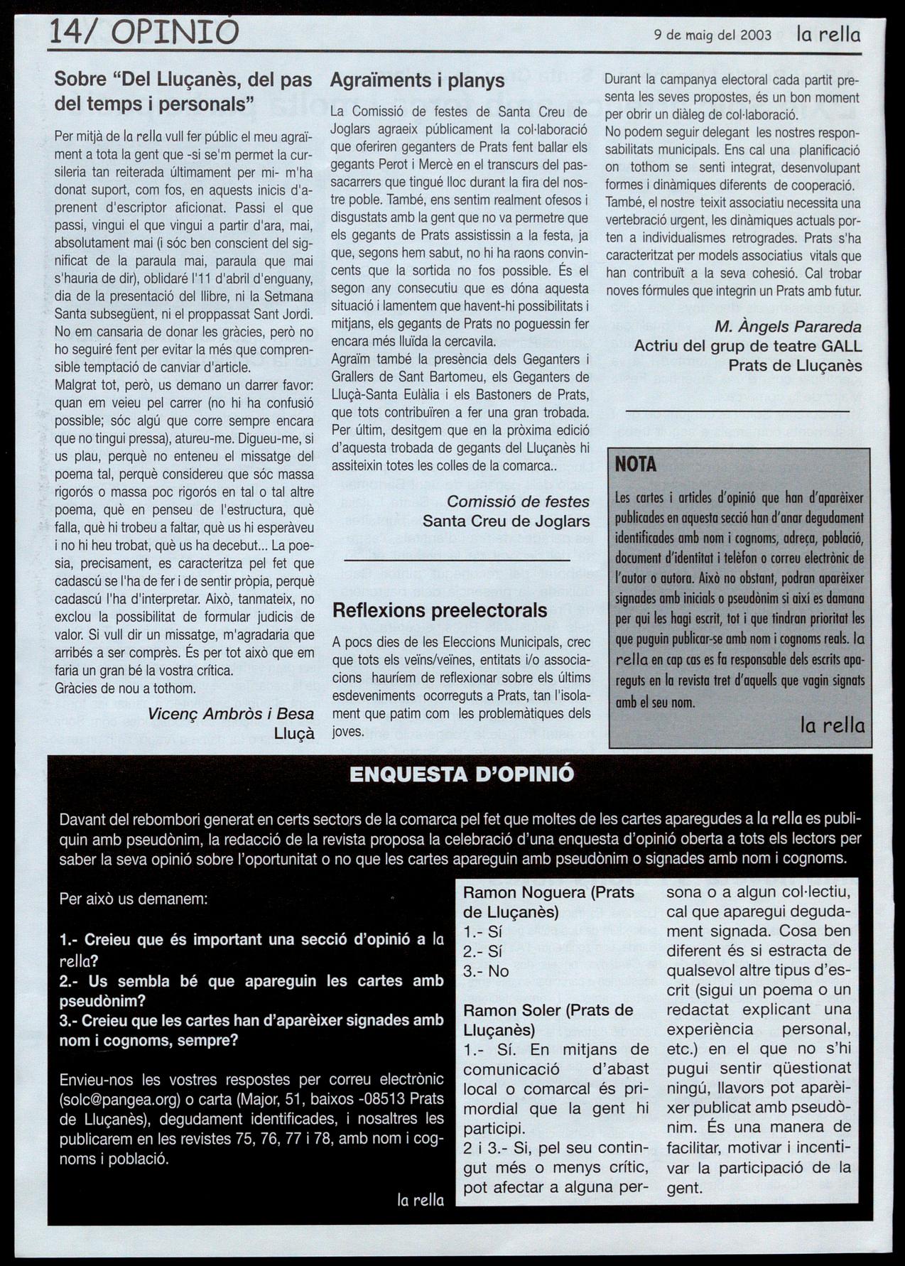 d'ésser batlle del poble. Un batlle, no ho oblidem, que ja era a l'Ajuntament en temps de Franco. Aquesta és la primera raó per la qual a molts ens agradaria un canvi al capdavant del poble: trenta-dos anys a l'Ajuntament són molts anys. La segona raó, potser la més important, és la convicció que el destí de Prats de Lluçanès està lligat al de la comarca. L'alcalde actual de Prats ha demostrat que és incapaç d'articular propostes amb altres batlles de la comarca. La seva llarga trajectòria política al Lluçanès Osona no li ha fet teixir una xarxa de relacions, complicitats i confiança amb altres batlles líders de la comarca. AI Lluçanès necessitem un equip d'alcaldes que treballin conjuntament pel futur dels seus pobles i la seva gent, pel futur de la comarca. Moltes persones, des del món associatiu i cultural, des de l'Església, des del teixit empresarial, des de la pagesia, etc. ja estan treballant decididament en aquesta direcció. Malauradament, l'actual batlle de Prats no empenyen aquesta direcció tampoc no és una persona que generi unió, il-lusió i convergències a tot el Lluçanès. L'actual batlle de Prats de Lluçanès té, sens dubte, moltes qualitats personals, i segurament ha fet coses molt positives per al poble. Però seria molt agosarat posar entre aquestes qualitats la seva capacitat de diàleg. Durant tots aquests anys ha mostrat una forma de fer política no gaire dialogant i tenir poc en compte els ciutadans les ciutadanes del poble. Només cal haver assistit en algun dels plens d'aquesta legislatura o de les anteriors. Un batlle que, sense pràcticament comptar amb la resta de l'equip de govern, ha portat la veu cantant no ha escoltat l'oposició -ja no diem dialogat. En una situació crítica com la que viu el poble, en què els propers anys s'han de prendre decisions cabdals, es necessita algú amb capacitat d'escoltar tothom de dialogar-hi. Es poden fer molts escrits butlletins tractant de justificar la feina de govern al poble després de sis legislatures al poder moltes promeses de futur, però la veritat és la que viuen dia a dia els ciutadans les ciutadanes del poble. A tall d'exemple, el poble era monoindustrial abans de l'arribada de la democràcia i, després de més vint-i-cinc anys, no ho ha deixat de ser. La vila era un atractiu centre comercial els anys vuitanta, on s'aplegava molta gent dels pobles veïns; ara, el mercat dominical