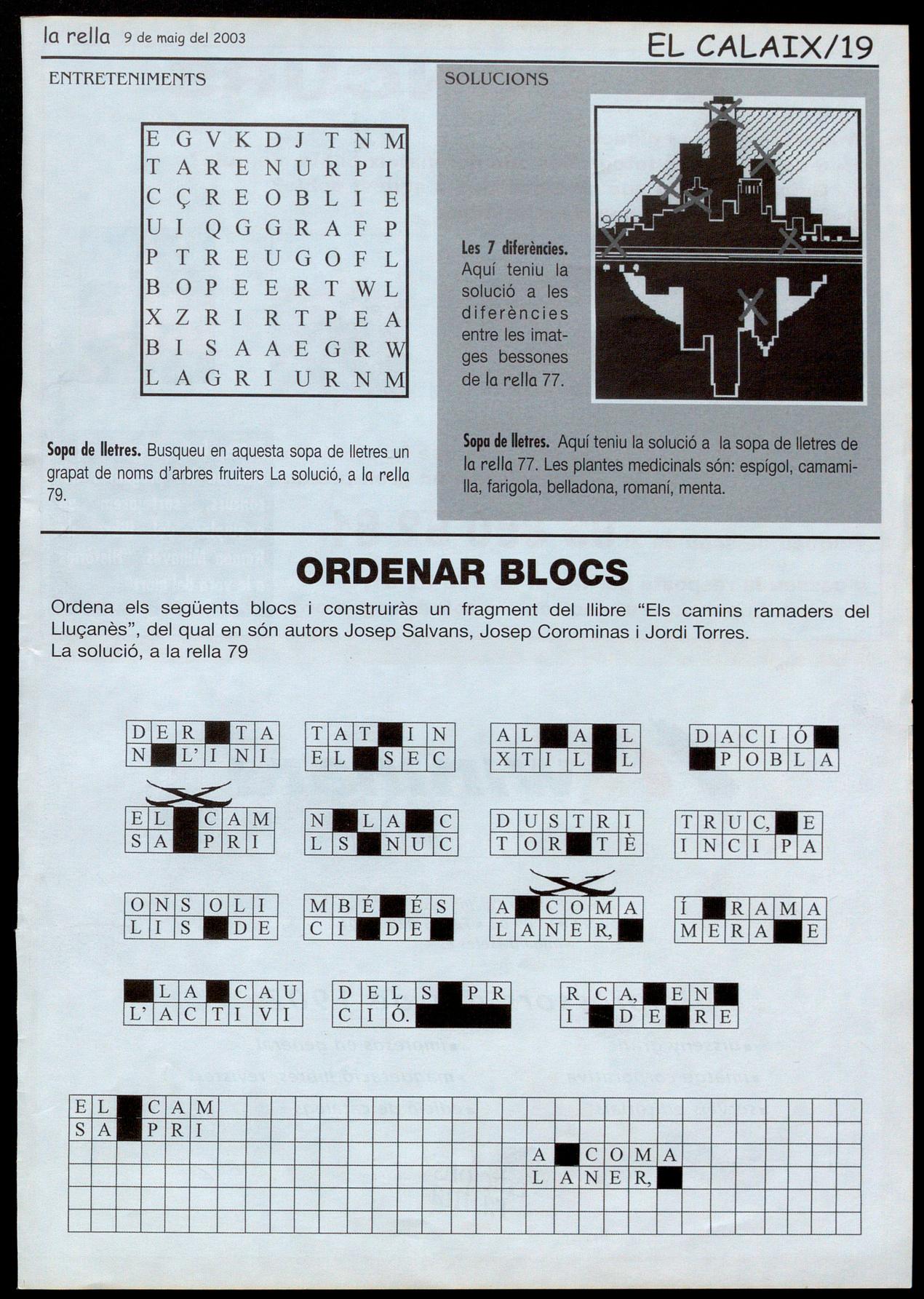 Ordena els següents blocs i construiràs un fragment del llibre "Els camins ramaders del Lluçanès", del qual en són autors Josep Salvans, Josep Corominas i Jordi Torres. La solució, a la rella 79
