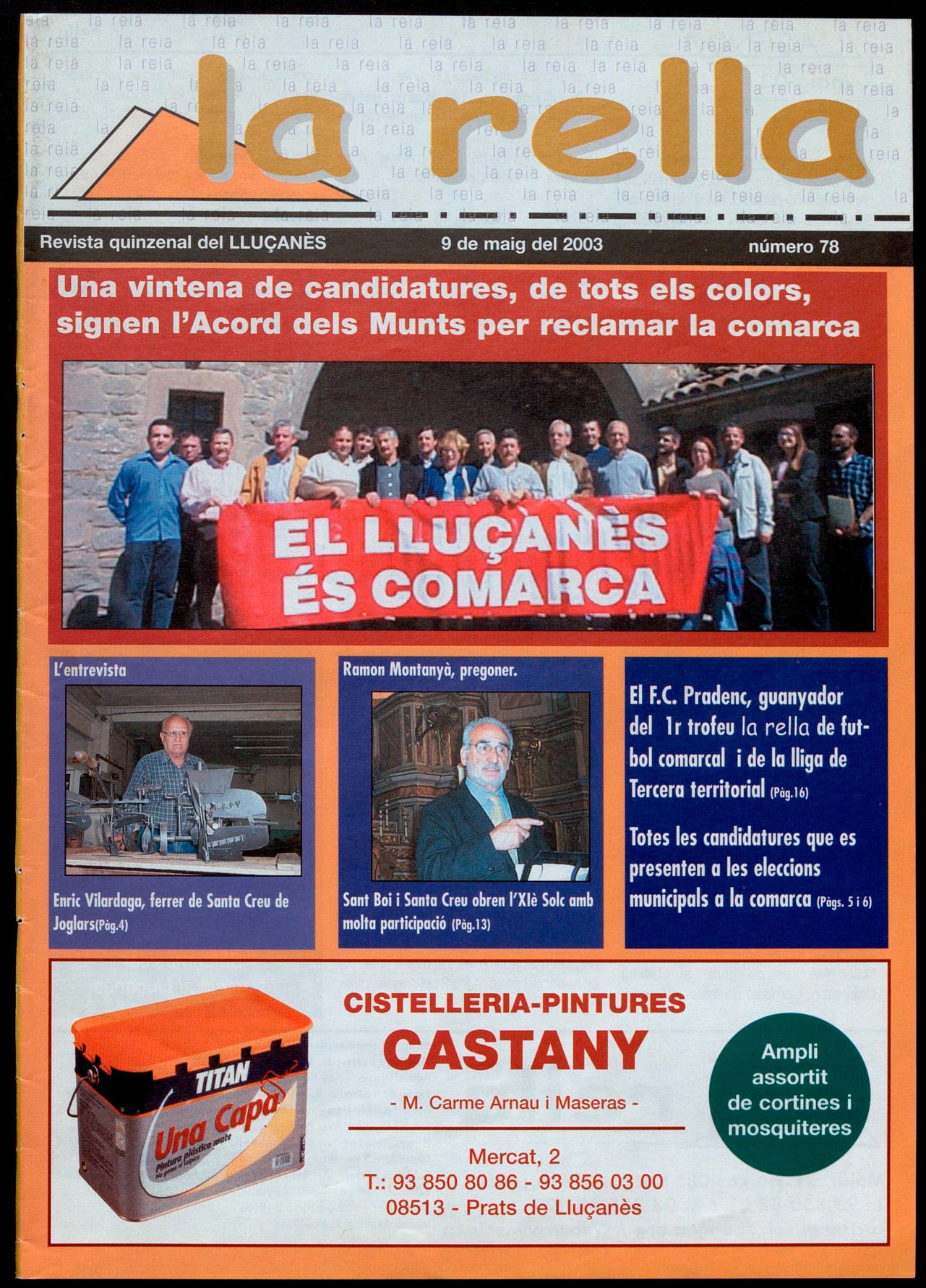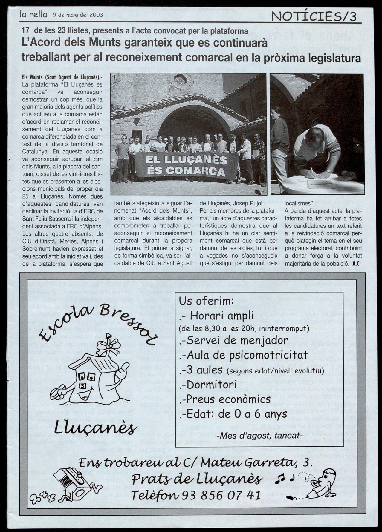 Els Munts (Sant Agustí de Lluçanès).La plataforma "El Lluçanès és comarca" va aconseguir demostrar, un cop més, que la gran majoria dels agents polítics que actuen a la comarca estan d'acord en reclamar el reconeixement del Lluçanès com a comarca diferenciada en el context de la divisió territorial de Catalunya, En aquesta ocasió va aconseguir agrupar, al cim dels Munts, a la placeta del santuari, disset de les vint-i-tres llistes que es presenten a les eleccions municipals del proper dia 25 al Lluçanès. Només dues d'aquestes candidatures van declinar la invitació, la d'ERC de Sant Feliu Sasserra la independent associada a ERC d'Alpens. Les altres quatre absents, de CiU d'Oristà, Merlès, Alpens Sobremunt havien expressat el seu acord amb la iniciativa i, des de la plataforma, s'espera que