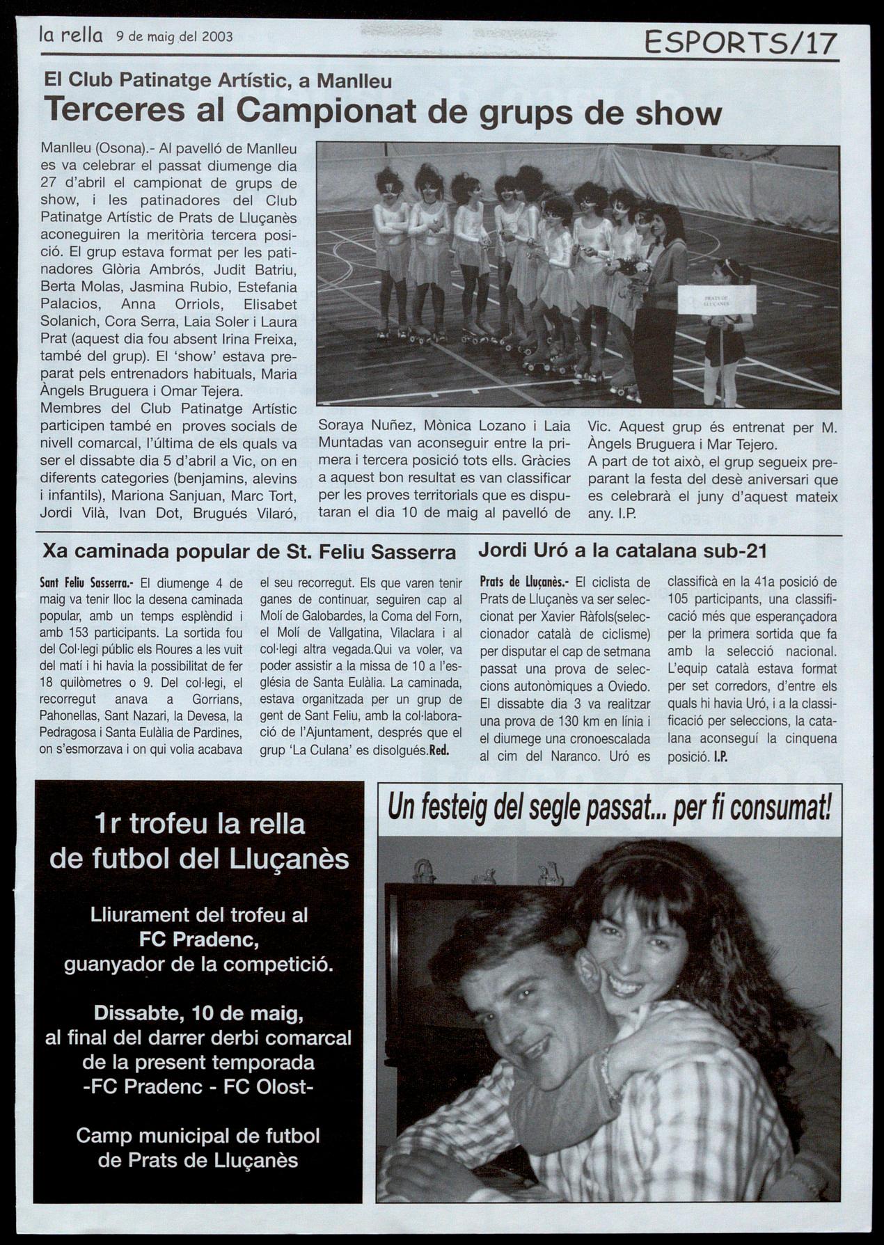 Manlleu (Osona).- AI pavelló de Manlleu es va celebrar el passat diumenge dia 27 d'abril el campionat de grups de shaw, i les patinadores del Club Patinatge Artístic de Prats de Lluçanès aconeguiren la meritòria tercera posició. El grup estava format per les patinadores Glòria Ambrós, Judit Batriu, Berta Molas, Jasmina Rubio, Estefania Palacios, Anna Orriols, Elisabet Solanich, Cora Serra, Laia Soler Laura Prat (aquest dia fou absent Irina Freixa, també del grup). El 'shaw' estava preparat pels entrenadors habituals, Maria Àngels Bruguera Omar Tejera.