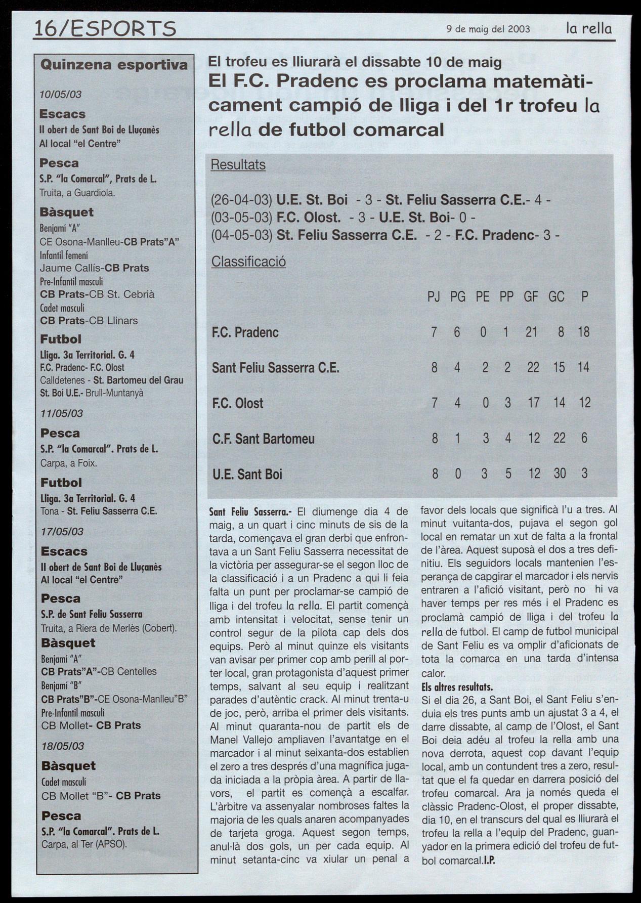 (26-04-03) U.E. St. Boi - 3 - St. Feliu Sasserra C.E.- 4(03-05-03) F.C. Olost. - 3 - U.E. St. Boi- O(04-05-03) St. Feliu Sasserra C.E. - 2 - F.C. Pradenc- 3 -