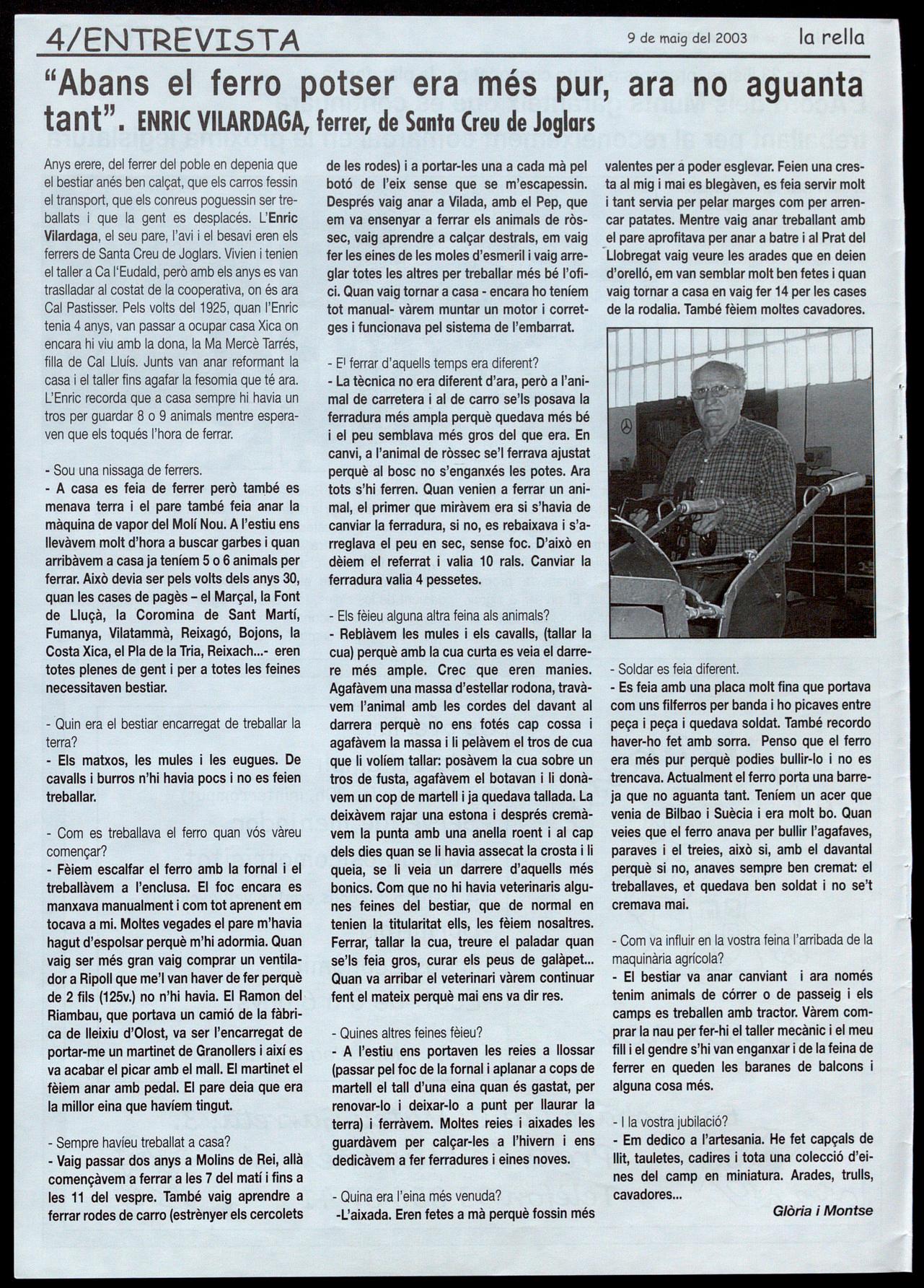 Anys erere, del ferrer del poble en depenia que el bestiar anés ben calçat, que els carros fessin el transport, que els conreus poguessin ser treballats i que la gent es desplacés. L'Enric Vilardaga, el seu pare, l'avi el besavi eren els ferrers de Santa Creu de Joglars. Vivien tenien el taller a Ca l'Eudald, però amb els anys es van traslladar al costat de la cooperativa, on és ara Cal Pastisser. Pels volts del 1925, quan l'Enric tenia 4 anys, van passar a ocupar casa Xica on encara hi viu amb la dona, la Ma Mercè Tarrés, filla de Cal Lluís. Junts van anar reformant la casa el taller fins agafar la fesomia que té ara. L'Enric recorda que a casa sempre hi havia un tros per guardar 8 o 9 animals mentre esperaven que els toqués l'hora de ferrar.