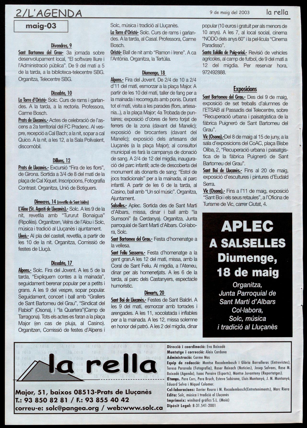 Salselles.· Aplec. Sortida des de Sant Martí d'Albars, missa, dinar i ball amb "la Sumsoni" �a Cerdanya). Organitza, Junta parroquial de Sant Martí d'Albars. Col·labora, Solc.