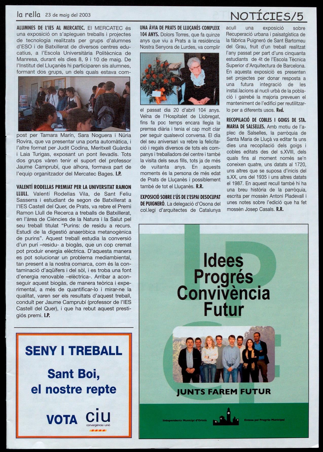 El grup municipal de CiU de Prats de Lluçanès va repartir un nou butlletí on s'informa de la instal.lació de noves empreses a la localitat, es fa un repàs a les millares que es creu que aportaran les noves comunicacions al Lluçanès, entre aquestes la futura ronda de Prats. També es referma el compromís del grup amb el reconeixement de la comarca demanant que Prats en sigui la capital es publica una carta de Jordi Pujol dirigida als militants simpatitzants del partit. R.R.