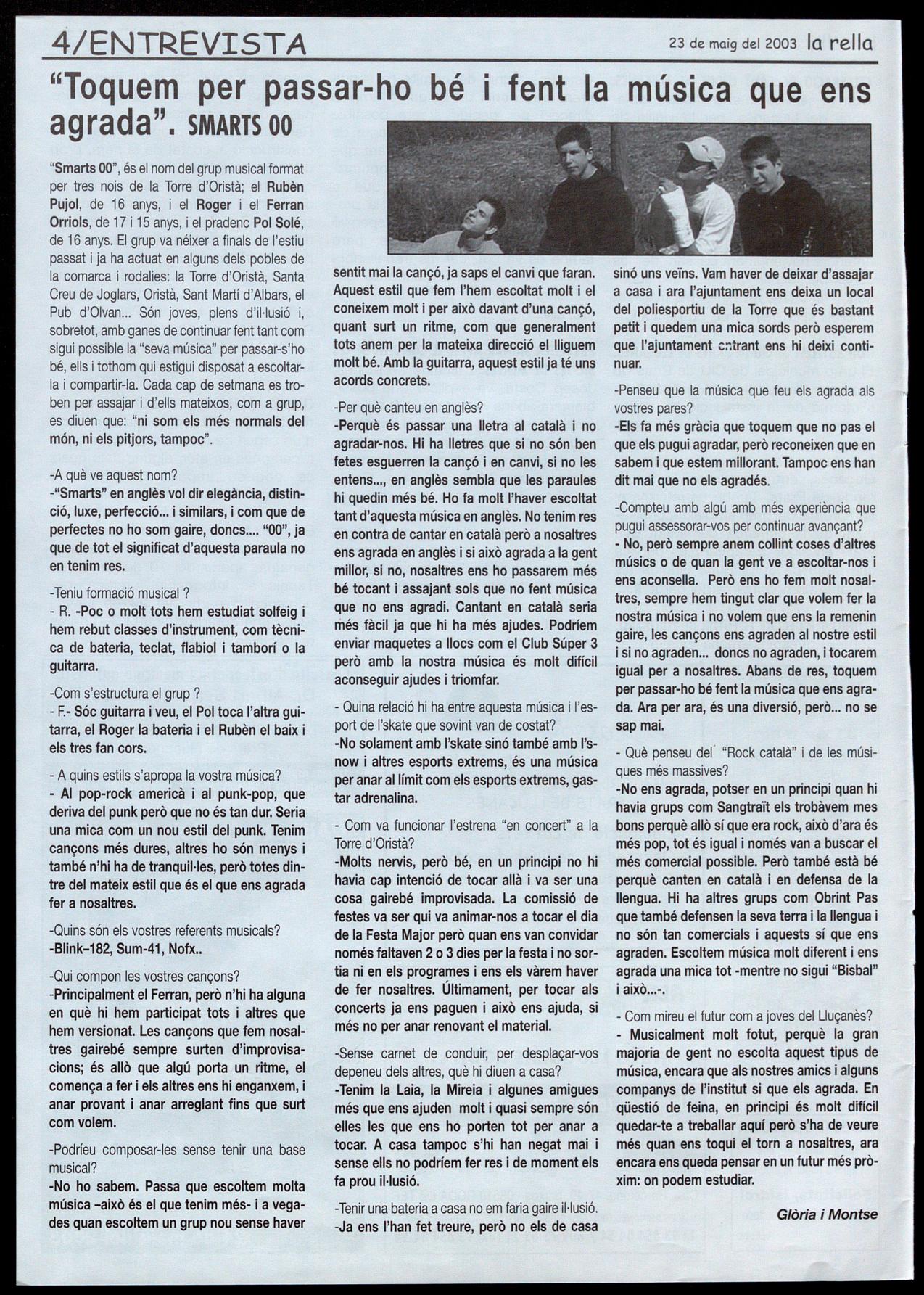 "Smarts 00", és el nom del grup musical format per tres nois de la Torre d'Oristà; el Rubèn Pujol, de 16 anys, el Roger el Ferran Orriols, de 17 15 anys, el pradenc Pol Solé, de 16 anys. El grup va néixer a finals de l'estiu passat ja ha actuat en alguns dels pobles de la comarca rodalies: la Torre d'Oristà, Santa Creu de Joglars, Oristà, Sant Martí d'Albars, el Pub d'Olvan... Són joves, plens c'il-lusió i, sobretot, amb ganes de continuar fent tant com sigui possible la "seva música" per passar-s'ho bé, ells tothom qui estigui disposat a escoltarIa compartir-la. Cada cap de setmana es troben per assajar d'ells mateixos, com a grup, es diuen que: "ni som els més normals del món, ni els pitjors, tampoc".
