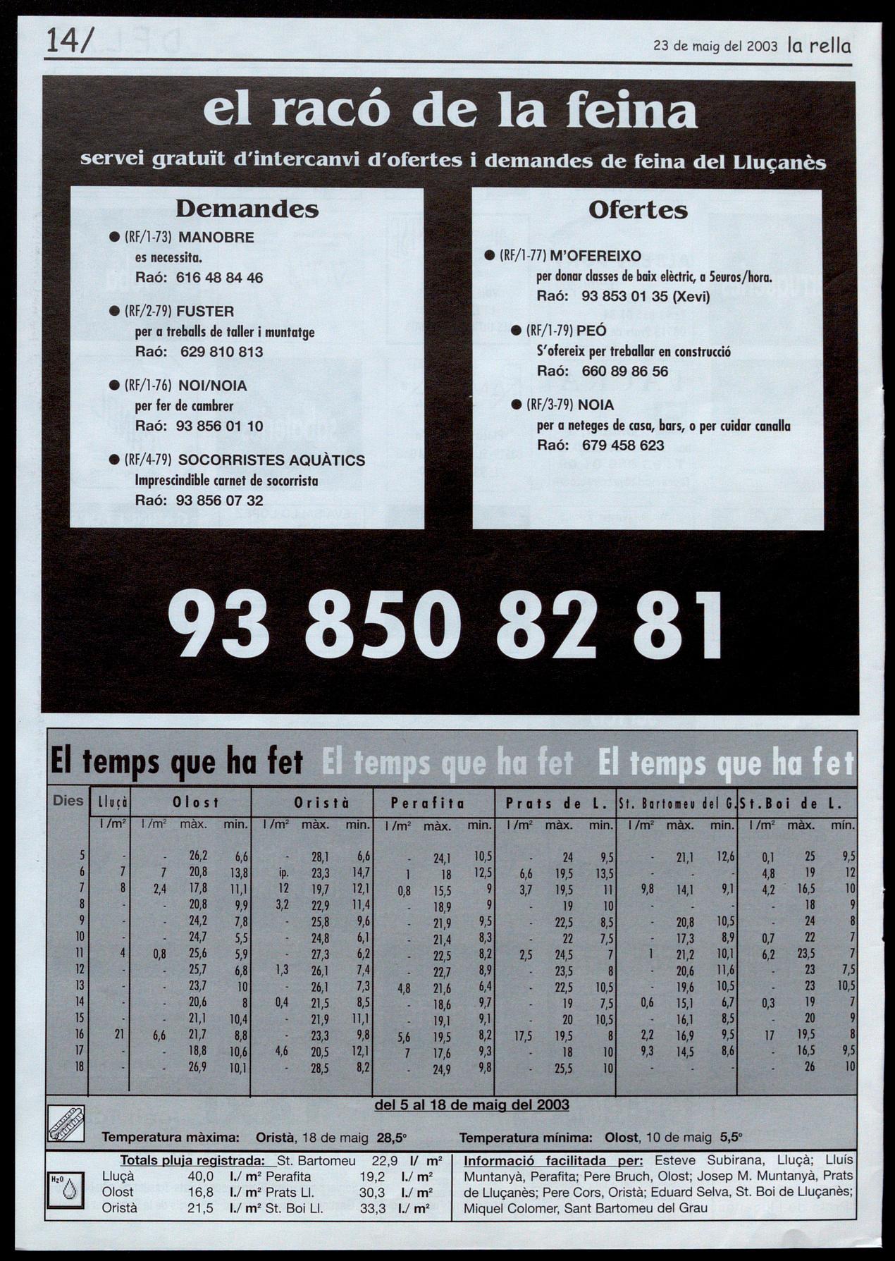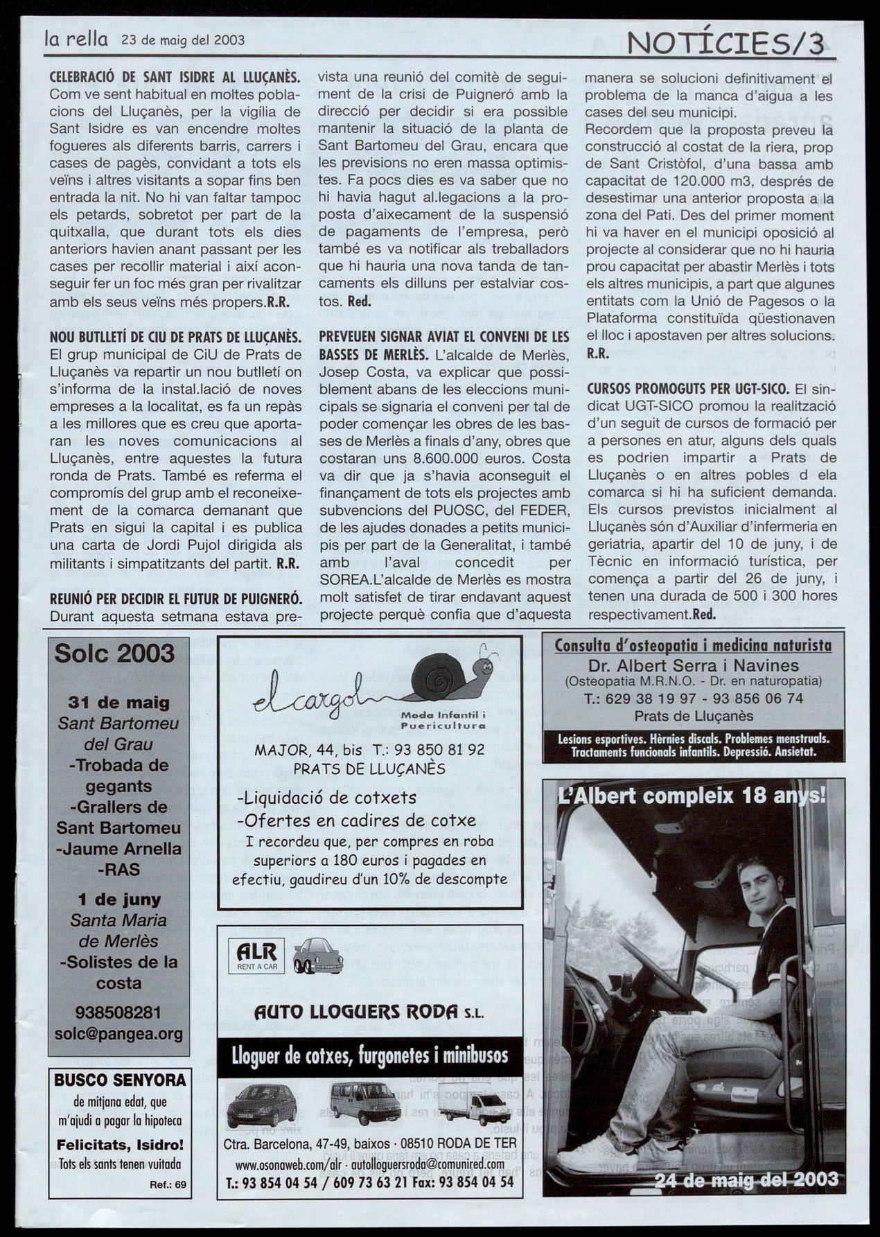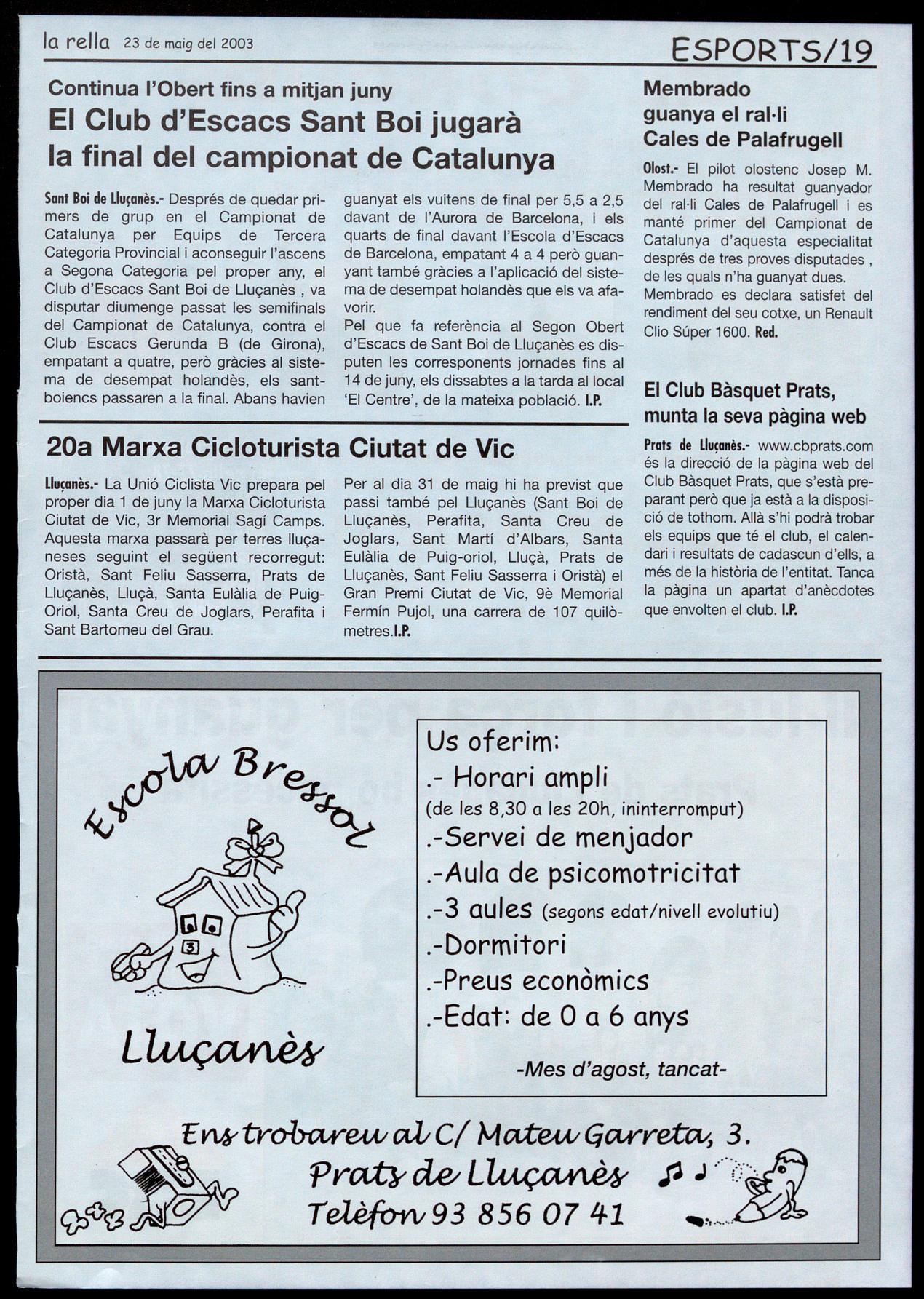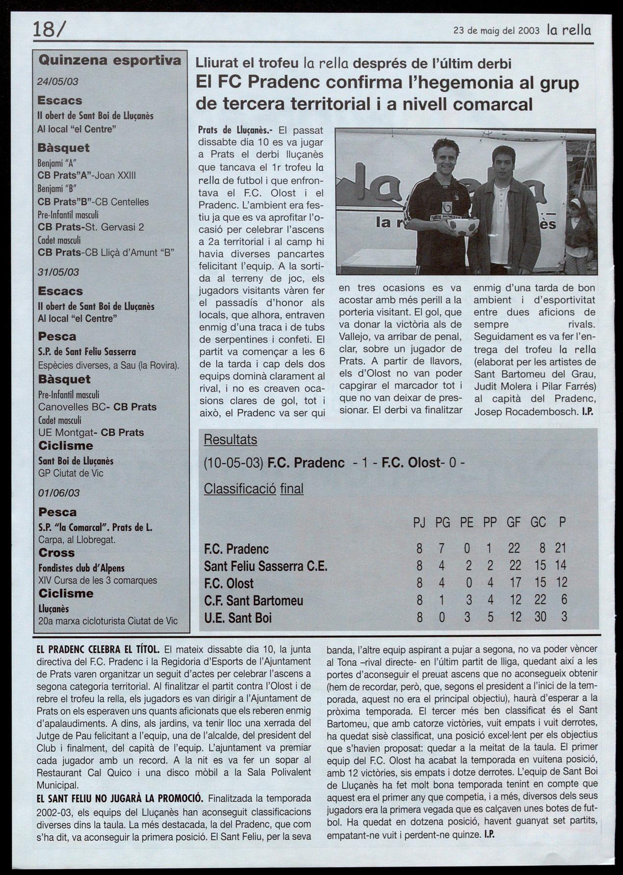 EL SANT FELIU NO JUGARÀ LA PROMOCiÓ. Finalitzada la temporada 2002-03, els equips del Lluçanès han aconseguit classificacions diverses dins la taula. La més destacada, la del Pradenc, que com s'ha dit, va aconseguir la primera posició. El Sant Feliu, per la seva