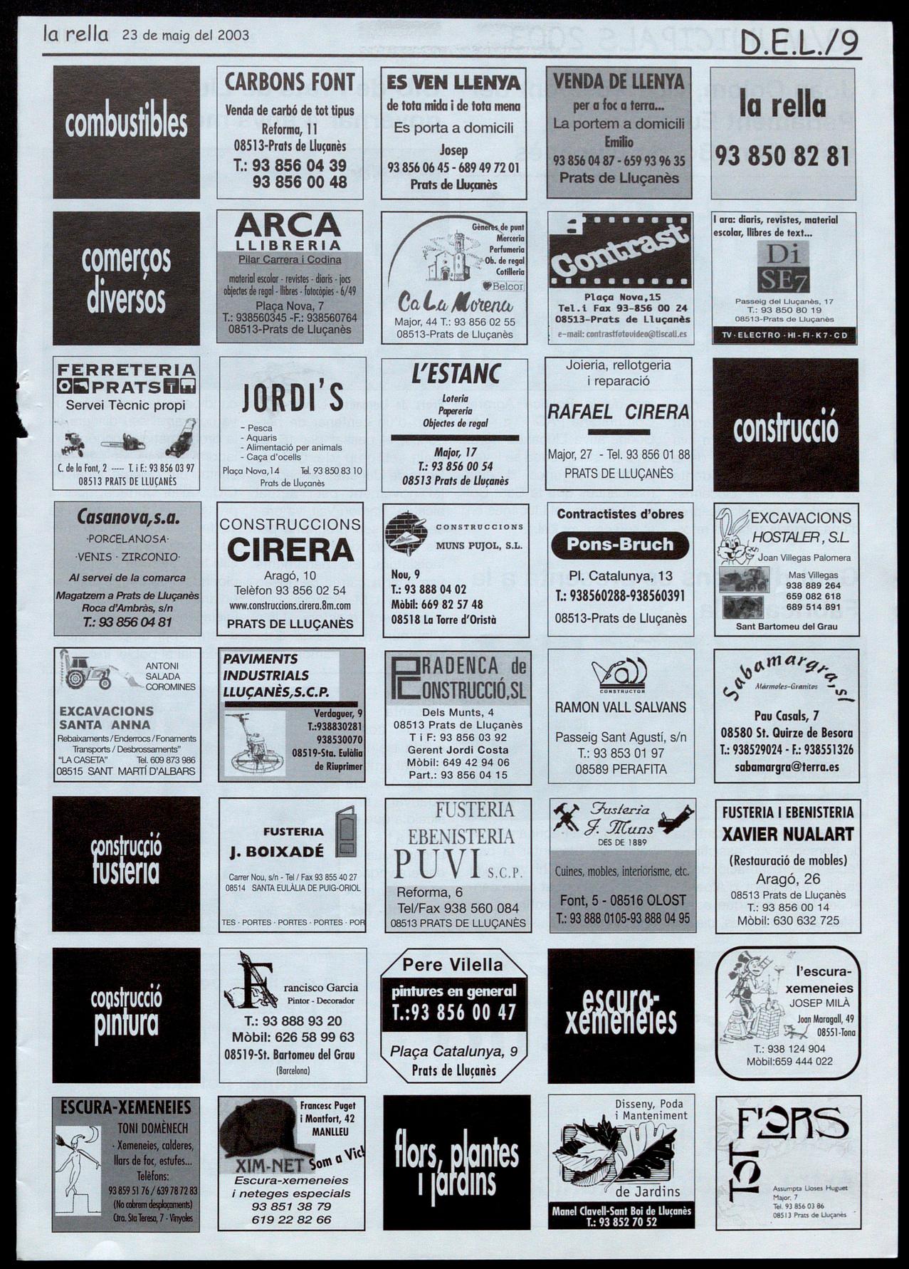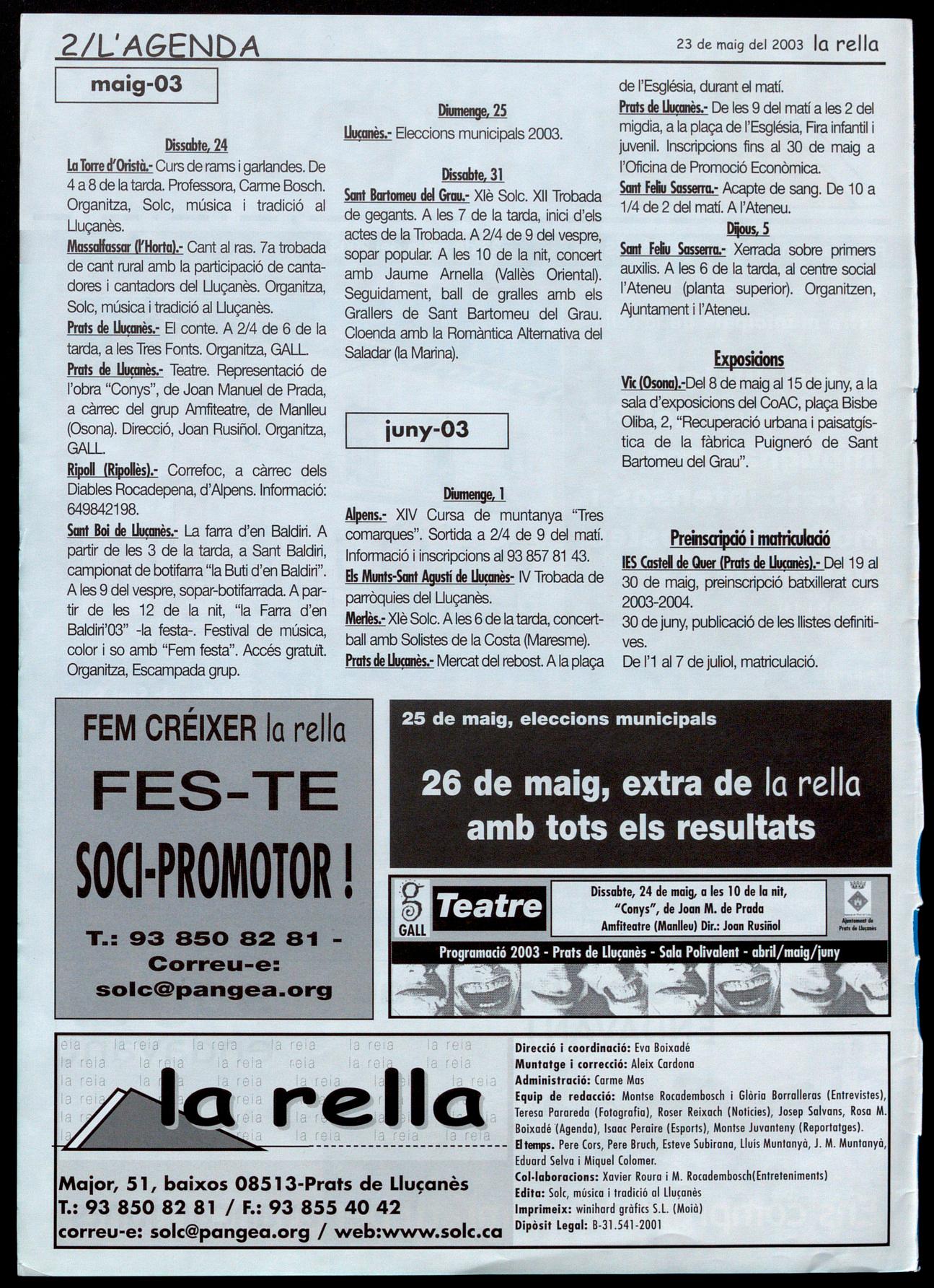 Prats de Uuamès.- El conte. A 2/4 de 6 de la tarda, a les Tres Fonts. Organitza, GALL. Prats de Uucanès.- Teatre. Representació de l'obra "Conys", de Joan Manuel de Prada, a càrrec del grup Amfiteatre, de Manlleu (Osona). Direcció, Joan Rusiñol. Organitza, GALL.