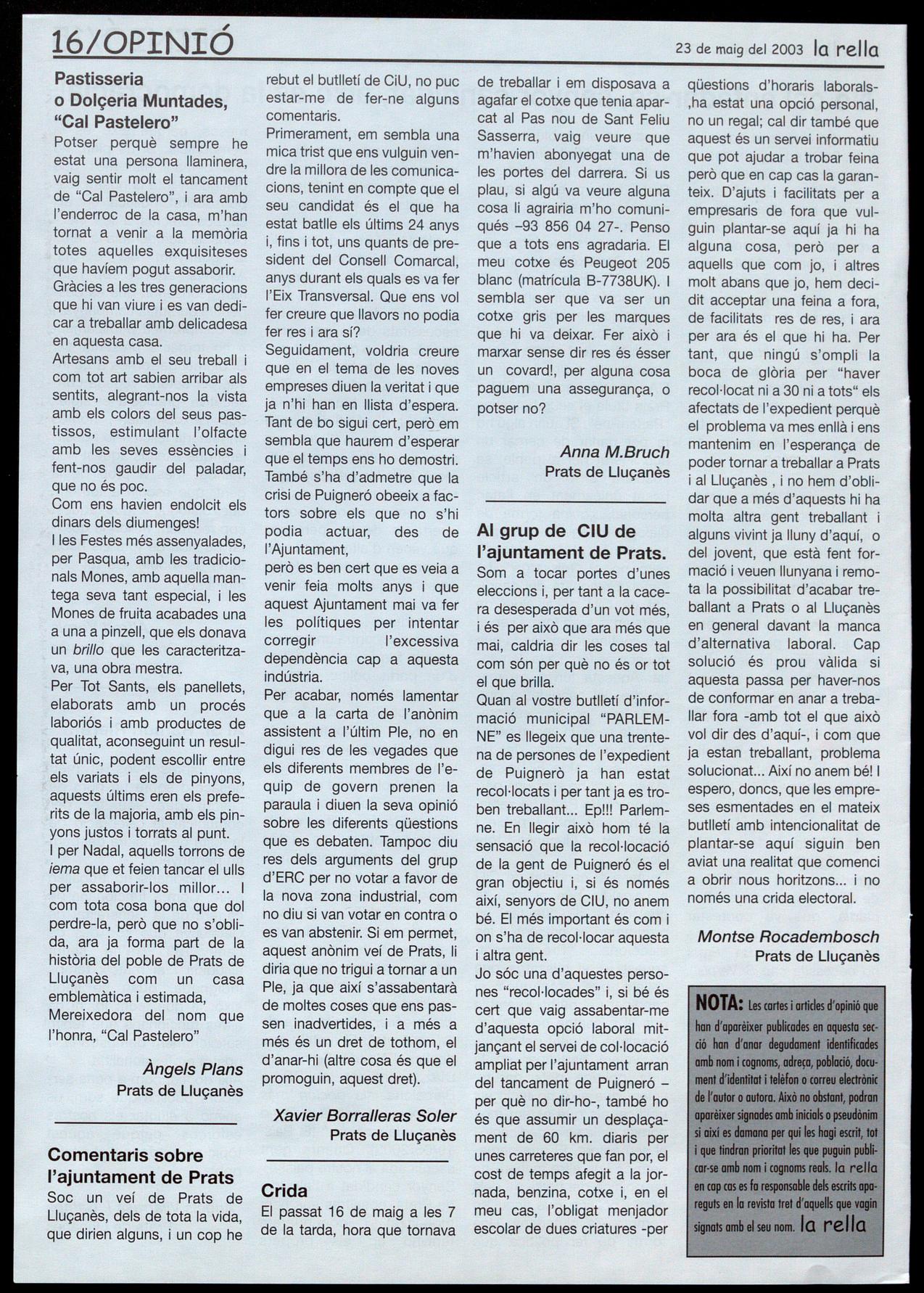 NOTA: Les cortes i articles d'opinió que han d'aparèixer publicades en aquesta secció han d'anar degudamenl identificades amb nom i cognoms, adreço, població, documeni d'identilot telèfon o correu electrònic de I'autor o autora. Això no obstonl, podran aparèixersignades amb inicials o pseudònim si oild es domono per qui les hagiescrit, lot i que tindran prioritotles que puguin publicar-se amb nom i cognoms reals. la rella en cop cos es fa responsable delsescrits apareguts en la revisto Irel d'aquells que yogin signats amb el seu nom. la rella