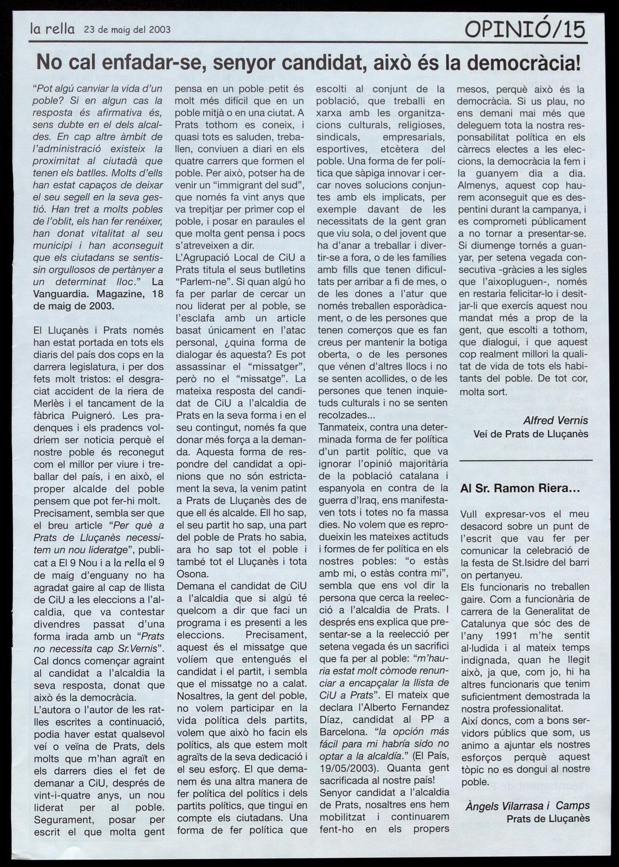 mesos, perquè això és la democràcia. Si us plau, no ens demani mai més que deleguem tota la nostra responsabilitat política en els càrrecs electes a les eleccions, la democràcia la fem i la guanyem dia a dia. Almenys, aquest cop haurem aconseguit que es despentini durant la campanya, es comprometi públicament a no tornar a presentar-se. Si diumenge tornés a guanyar, per setena vegada consecutiva -gràcies a les sigles que I'aixopluguen-, només en restaria felicitar-lo i desitjar-li que exercís aquest nou mandat més a prop de la gent, que escolti a tothom, que dialogui, i que aquest cop realment millori la qualitat de vida de tots els habitants del poble. De tot cor, molta sort.