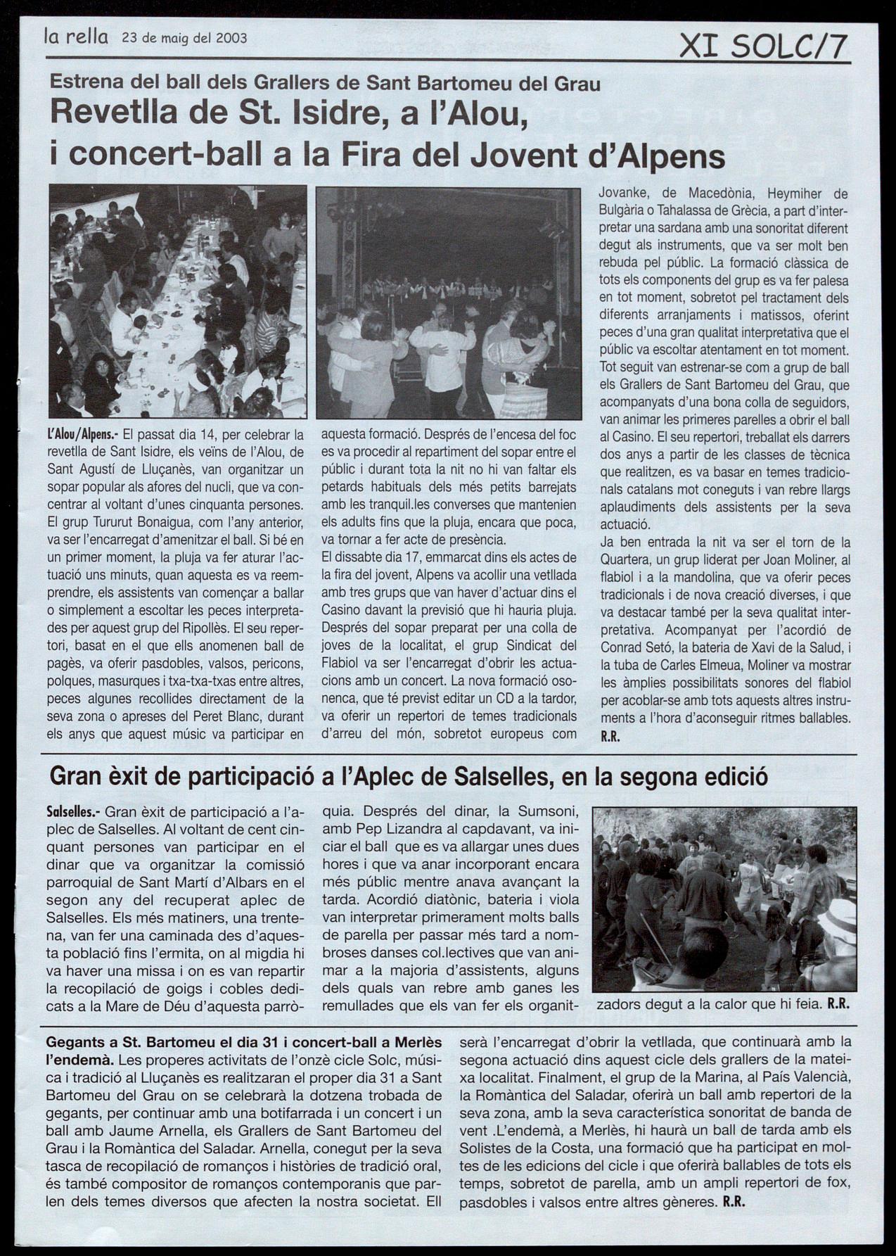 Sant Bca10meu del Grau. - Xlè Solc. XII Trobada de gegants. A les 7 de la tarda, inici d'els actes de la Trobada. A 2/4 de 9 del vespre, sopar popular. A les 1 O de la nit, concert amb Jaume Arnella (Vallès Oriental). Seguidament, ball de gralles amb els Grallers de Sant Bartomeu del Grau. Cloenda amb la Romàntica Altemativa del Saladar Oa Marina).