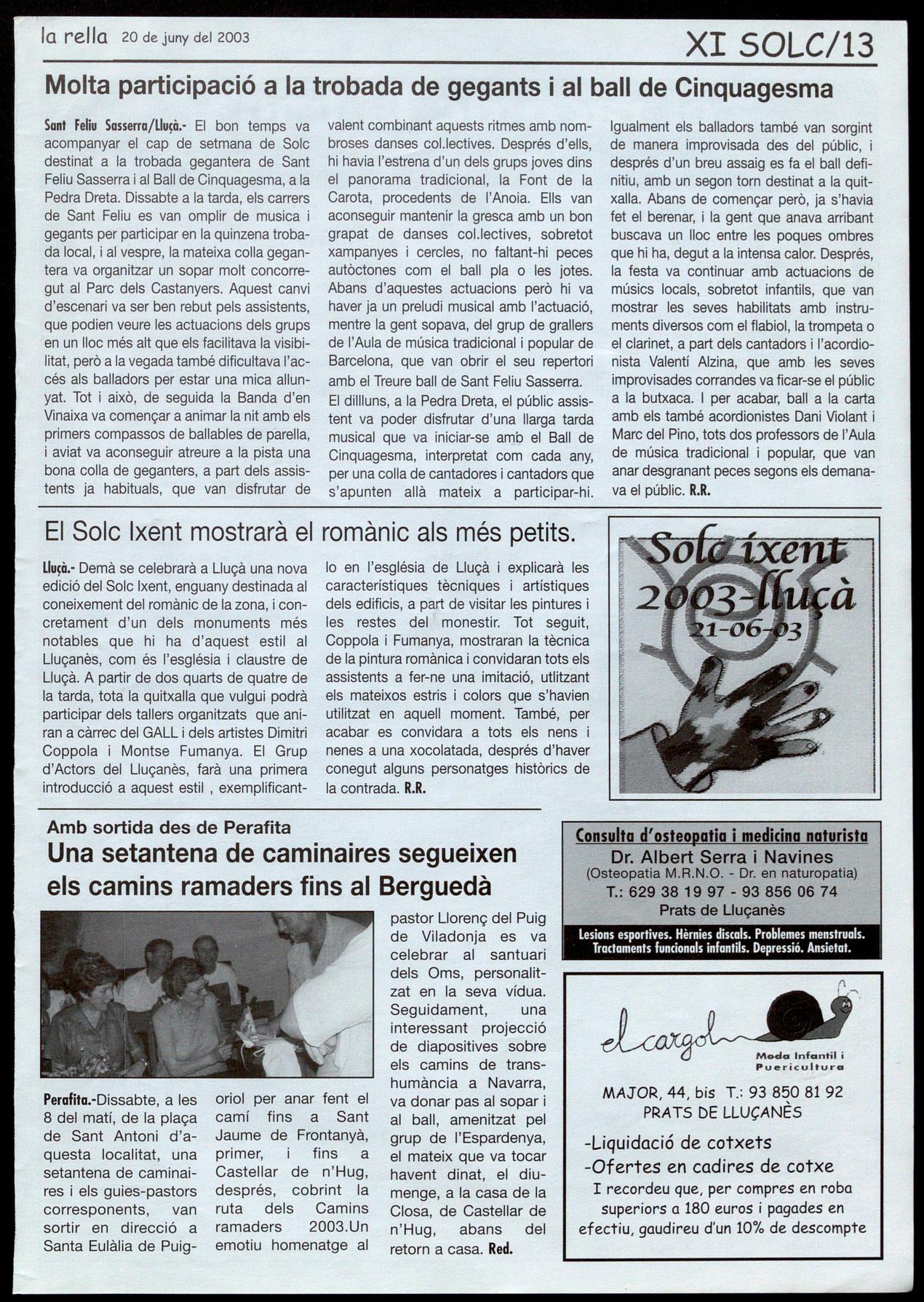 LIuàJ.. Solc 2003. A partir de 2/4 de 4 de la tarda, Solc ixent, per als mésjoves. Enguany, "El romànic a l'abast de la mà". Tallers, visites, gresca i berenar. Organitza, Solc, música tradició al Lluçanès.