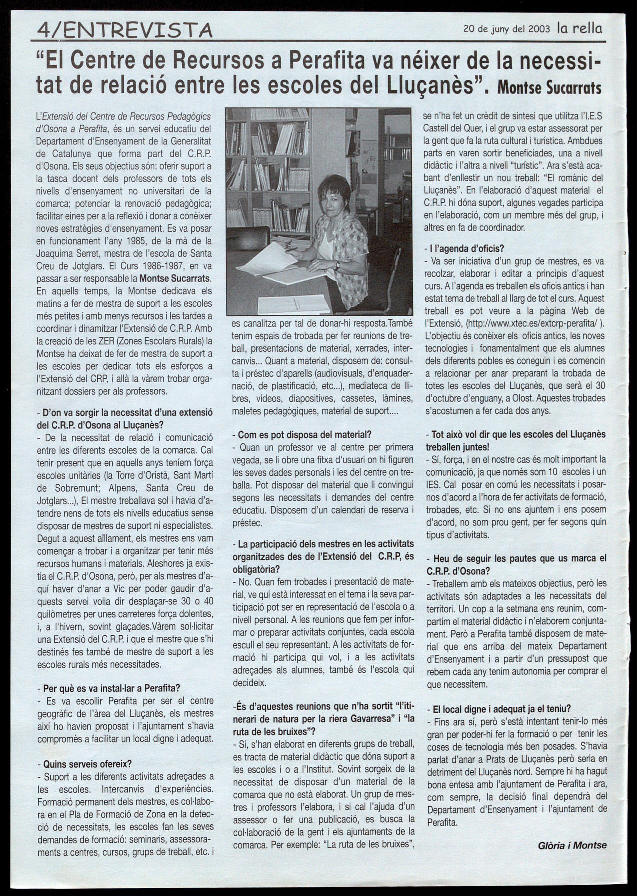 "El Centre de Recursos a Perafita va néixer de la necessitat de relació entre les escoles del Lluçanès". Montse Sucarrats