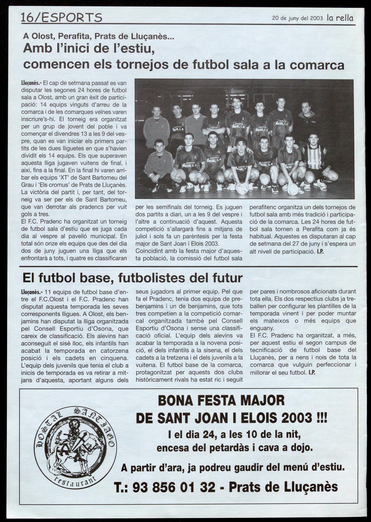 per les semifinals del torneig. Es juguen dos partits a diari, un a les 9 del vespre l'altre a continuació d'aquest. Aquesta competició s'allargarà fins a mitjans de juliol sols fa un parèntesis per la festa major de Sant Joan Elois 2003. Coincidint amb la festa major d'aquesta població, la comissió del futbol sala