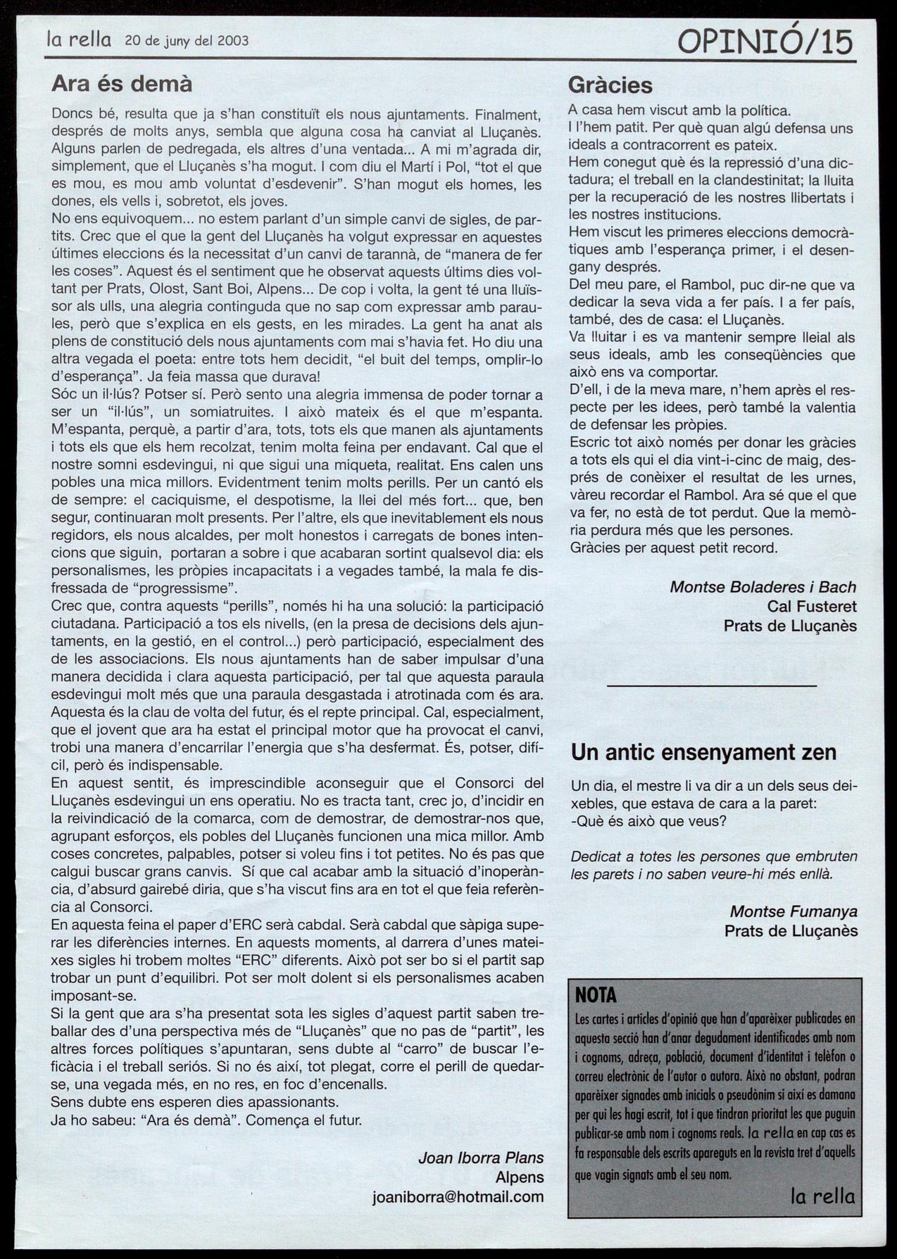 Doncs bé, resulta que ja s'han constituït els nous ajuntaments. Finalment, després de molts anys, sembla que alguna cosa ha canviat al Lluçanès. Alguns parlen de pedregada, els altres d'una ventada A mi m'agrada dir, simplement, que el Lluçanès s'ha mogut. I com diu el Martí Pol, "tot el que es mou, es mou amb voluntat d'esdevenir". S'han mogut els homes, les dones, els vells i, sobretot, els joves. No ens equivoquem no estem parlant d'un simple canvi de sigles, de partits. Crec que el que la gent del Lluçanès ha volgut expressar en aquestes últimes eleccions és la necessitat d'un canvi de tarannà, de "manera de fer les coses". Aquest és el sentiment que he observat aquests últims dies voltant per Prats, Olost, Sant Boi, Alpens De cop i volta, la gent té una lluïssor als ulls, una alegria continguda que no sap com expressar amb paraules, però que s'explica en els gests, en les mirades. La gent ha anat als plens de constitució dels nous ajuntaments com mai s'havia fet. Ho diu una altra vegada el poeta: entre tots hem decidit, "el buit del temps, omplir-lo d'esperança". Ja feia massa que durava!