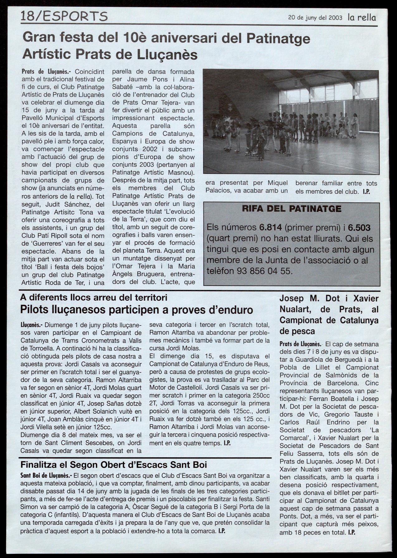 Prals de Lluçanès.- Coincidint amb el tradicional festival de fi de curs, el Club Patinatge Artístic de Prats de Lluçanès va celebrar el diumenge dia 15 de juny a la tarda al Pavelló Municipal d'Esports el 10è aniversari de l'entitat. A les sis de la tarda, amb el pavelló ple amb força calor, va començar l'espectacle amb l'actuació del grup de shaw del propi club que havia participat en diversos campionats de grups de show Ua anunciats en números anteriors de la rella). Tot seguit, Judit Sánchez, del Patinatge Artísitc Tona va oferir una coreografia a tots els assistents, un grup del Club Patí Ripoll sota el nom de 'Guerreres' van fer el seu espectacle. Abans de la mitja part van actuar sota el títol 'Ball i festa dels bojos' un grup del club Patinatge Artístic Roda de Ter, i una