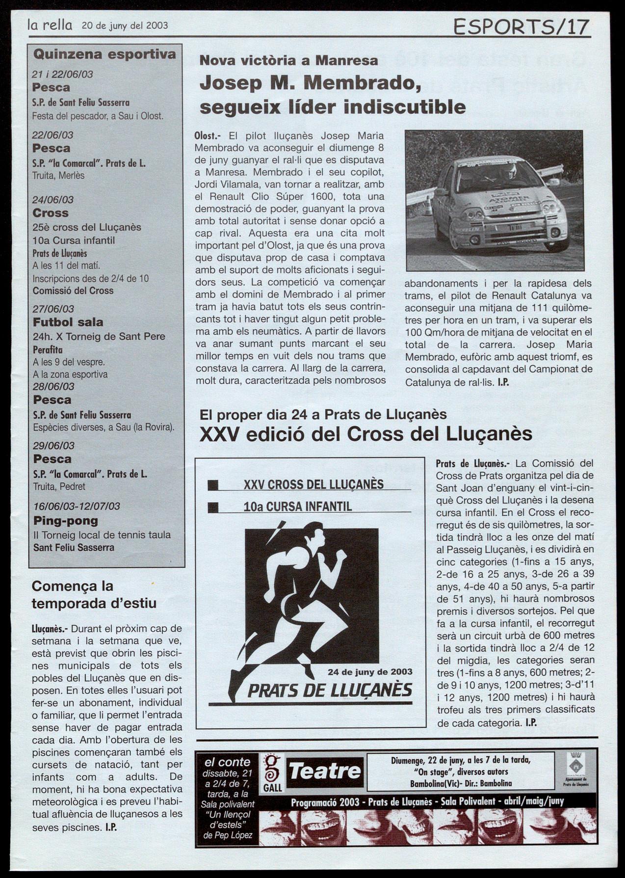 Olost.- El pilot lluçanès Josep Maria Membrado va aconseguir el diumenge 8 de juny guanyar el ral-f que es disputava a Manresa. Membrado i el seu copilot, Jordi Vilamala, van tornar a realitzar, amb el Renault Clio Súper 1600, tota una demostració de poder, guanyant la prova amb total autoritat sense donar opció a cap rival. Aquesta era una cita molt important pel d'Olost, ja que és una prova que disputava prop de casa i comptava amb el suport de molts aficionats i seguidors seus. La competició va començar amb el domini de Membrado i al primer tram ja havia batut tots els seus centrincants tot haver tingut algun petit problema amb els neumàtics. A partir de llavors va anar sumant punts marcant el seu millor temps en vuit dels nou trams que constava la carrera. AI llarg de la carrera, molt dura, caracteritzada pels nombrosos