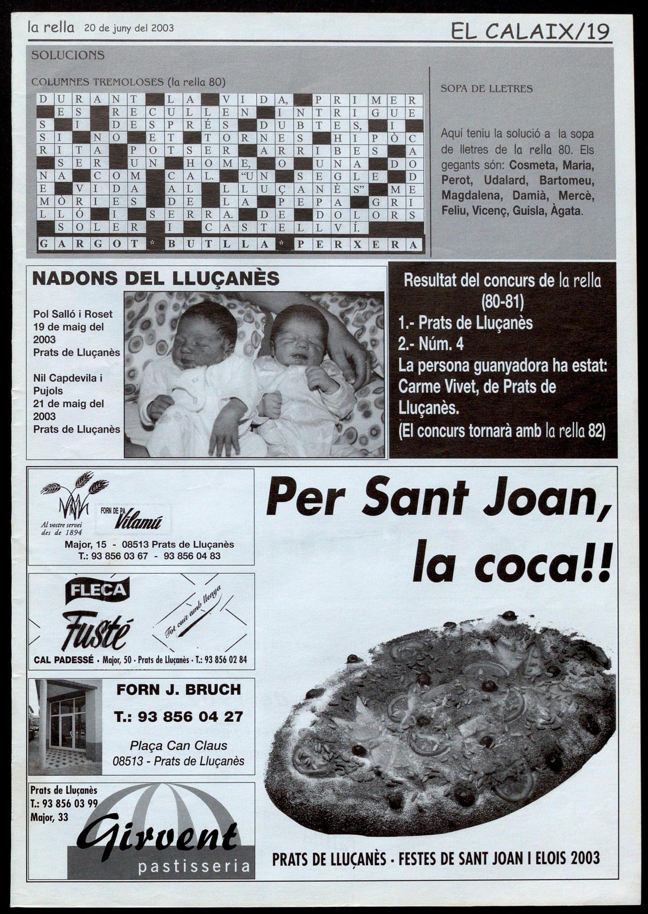 Aquí teniu la solució a la sopa de lletres de la rella 80. Els gegants són: Cosmeta, Maria, Perot, Udalard, Bartomeu, Magdalena, Damià, Mercè, Feliu, Vicenç, Guisla, Àgata. SOPA DE LLETRES