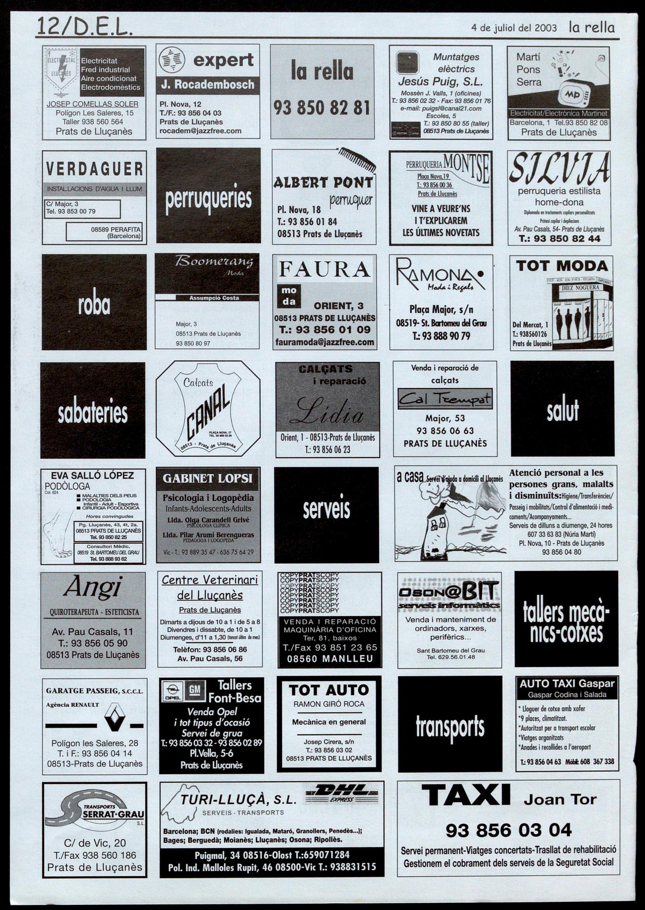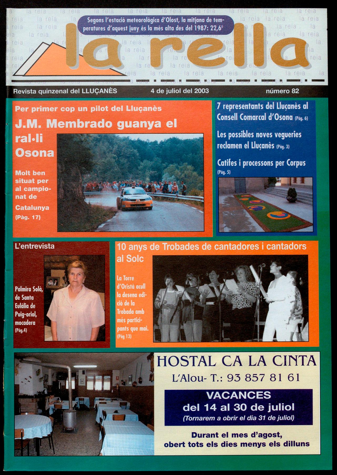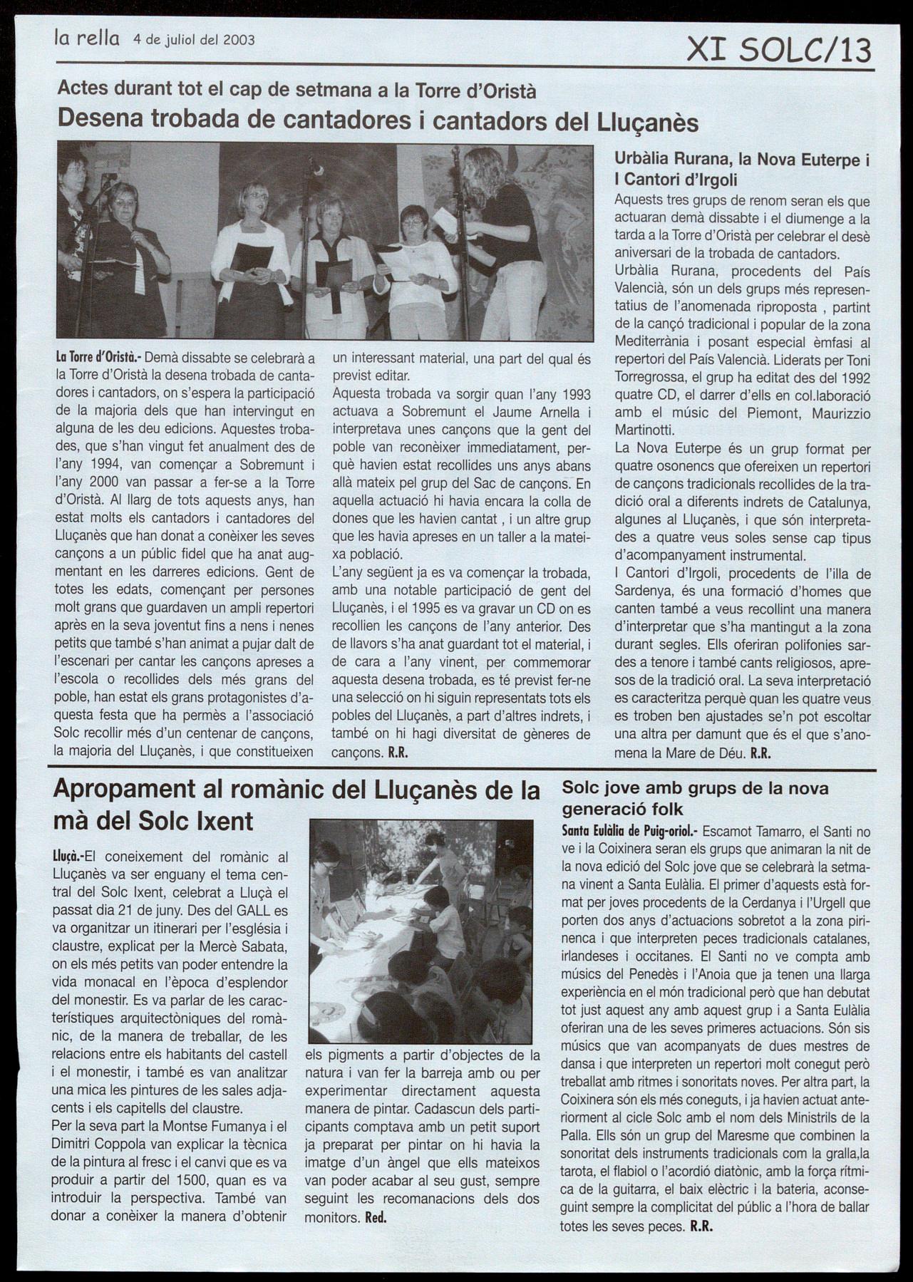 La Torre d'Oristà. - Solc 2003. X Trobada de Cantadores Cantadors del Uuçanès. A les 9 del vespre, sopar popular a la plaça. Reserves, Cal Toni: 93 888 03 02 1 Solc: 93850 82 81. A les 10 de la nit, actuació de cantadores cantadors del Uuçanès d'atres comarques. Seguidament, concert-ball amb Urbàlia Rurana (l'Horta)
