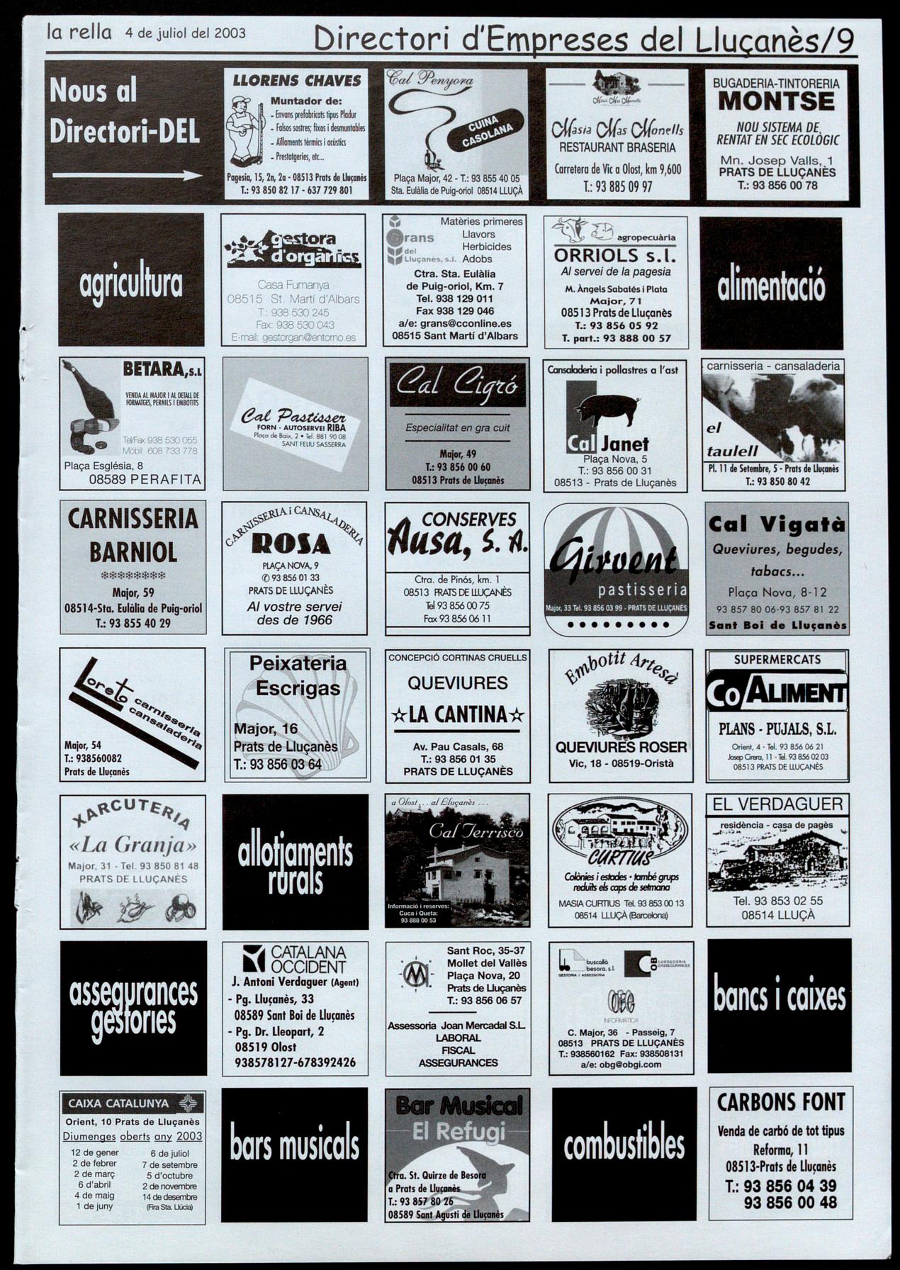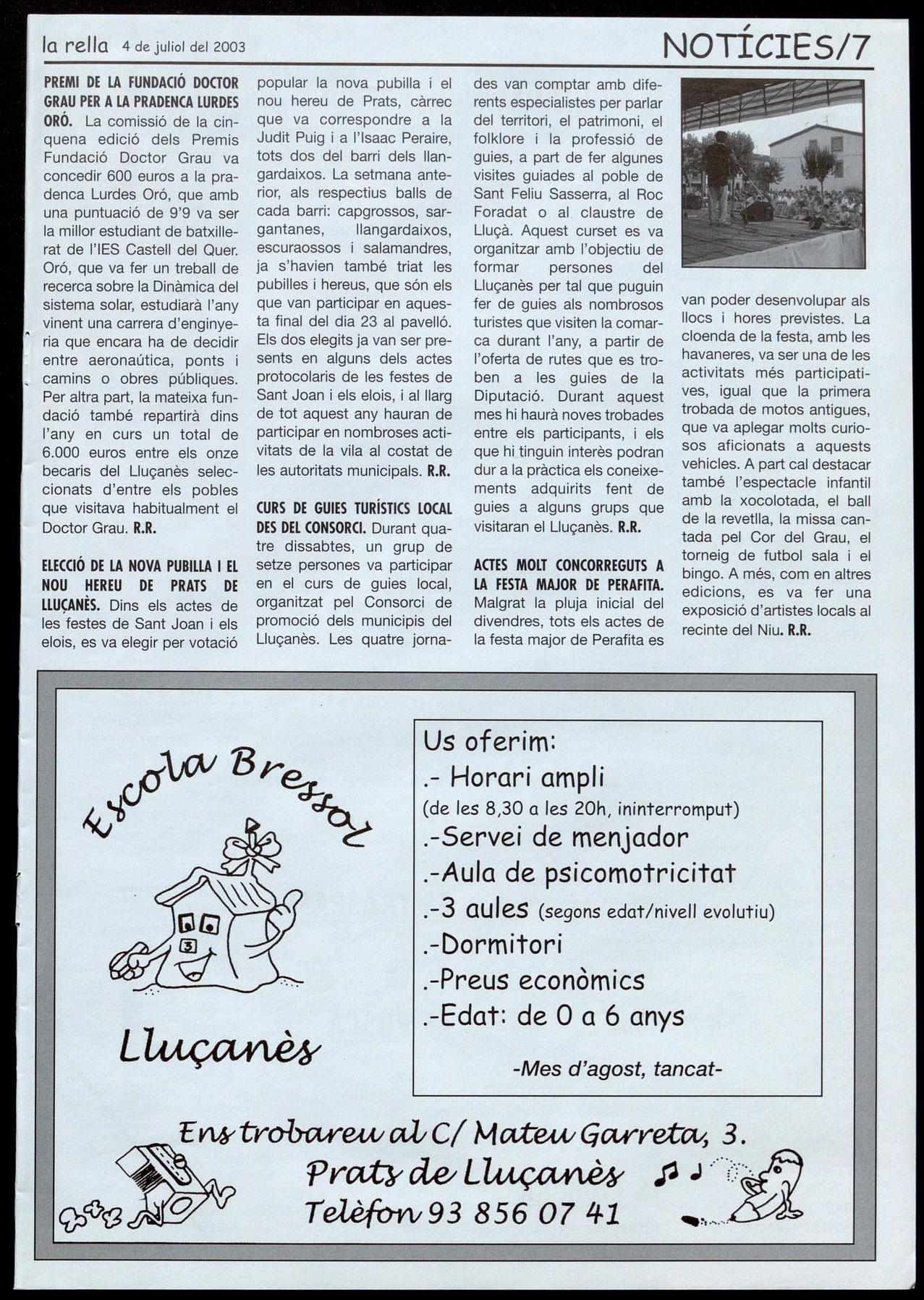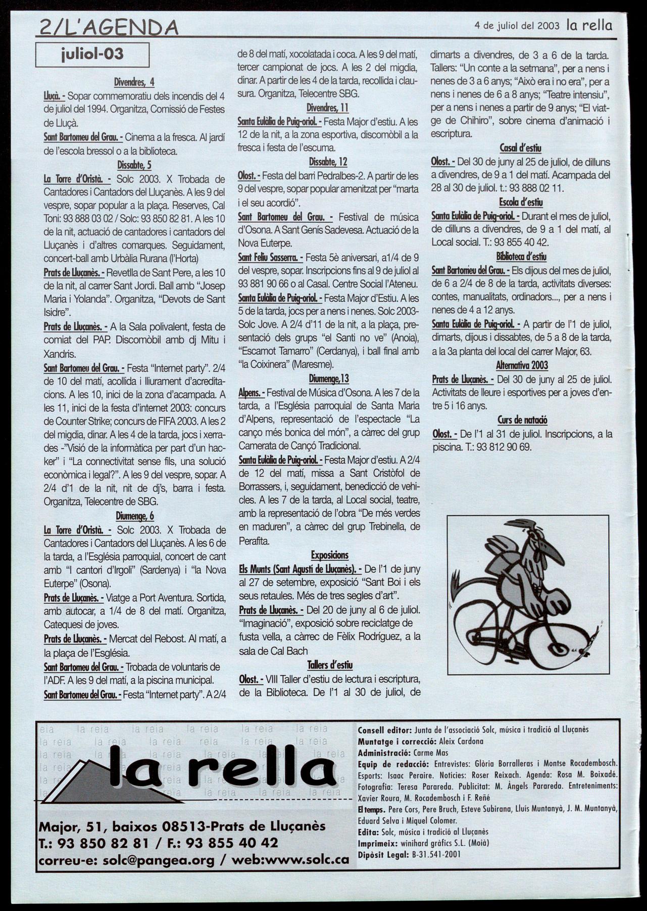 Smta EuIà&a de Puig-orio!. - Durant el mes dejuliol, de dilluns a divendres, de 9 a 1 del matí, al Local social. T.: 93 855 40 42.