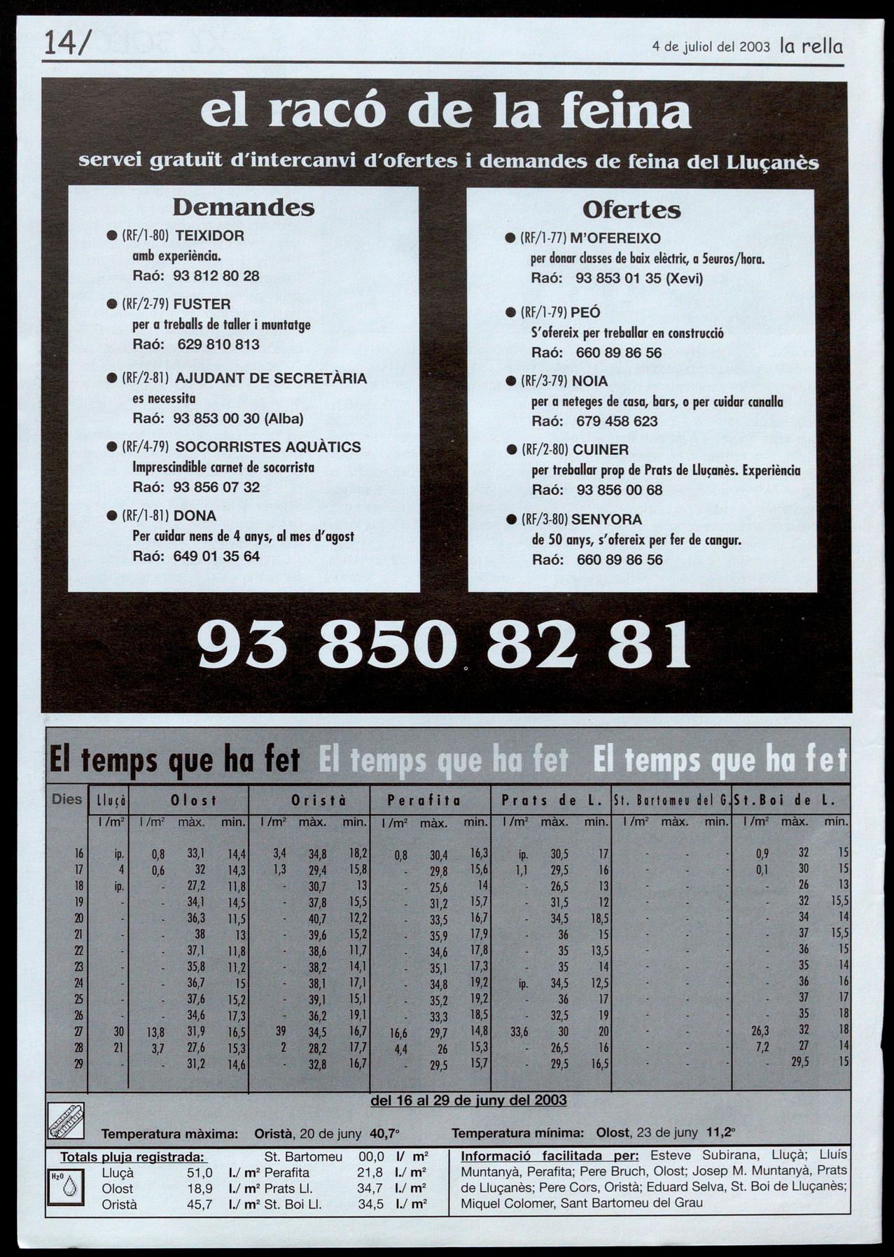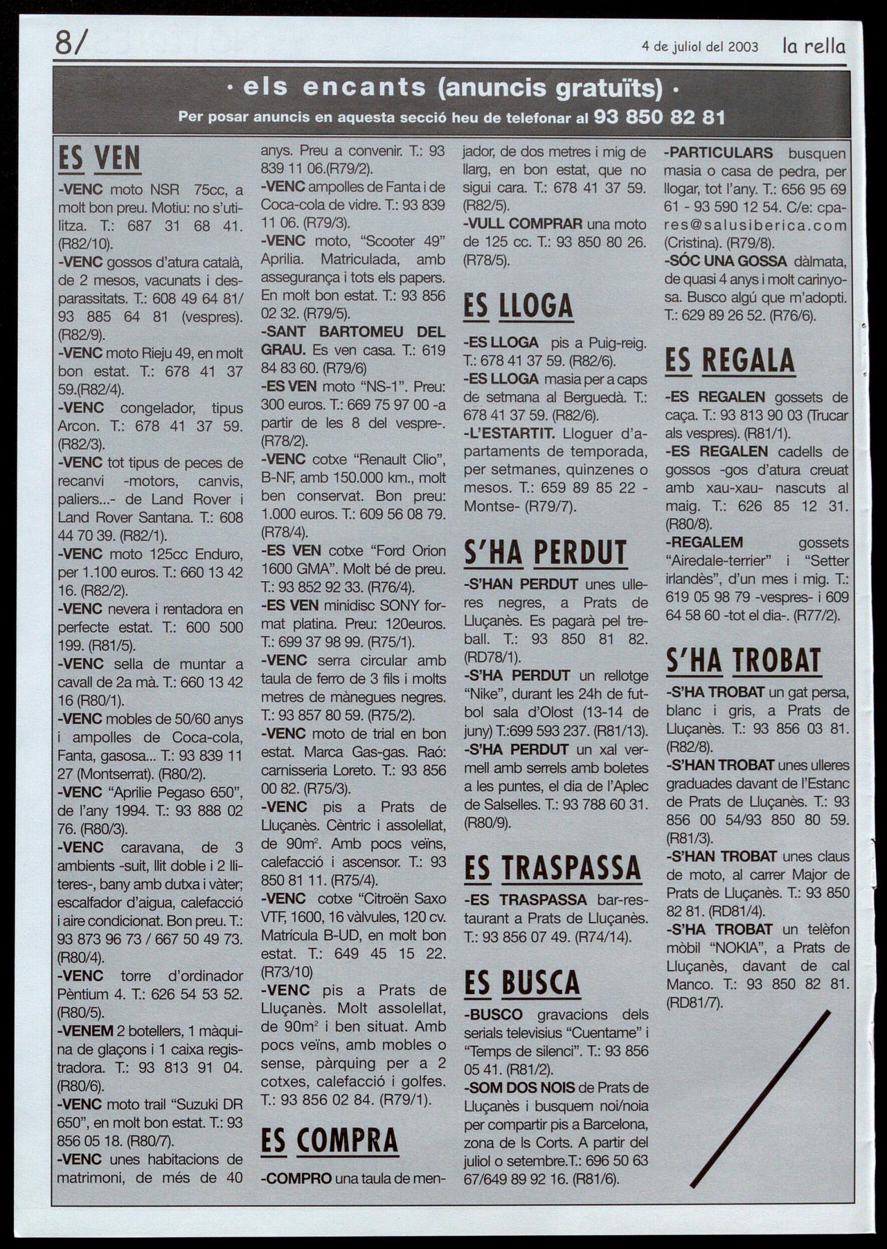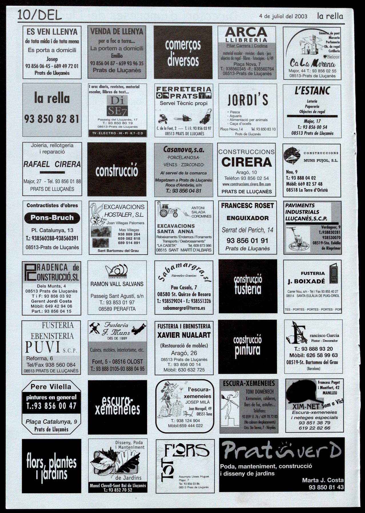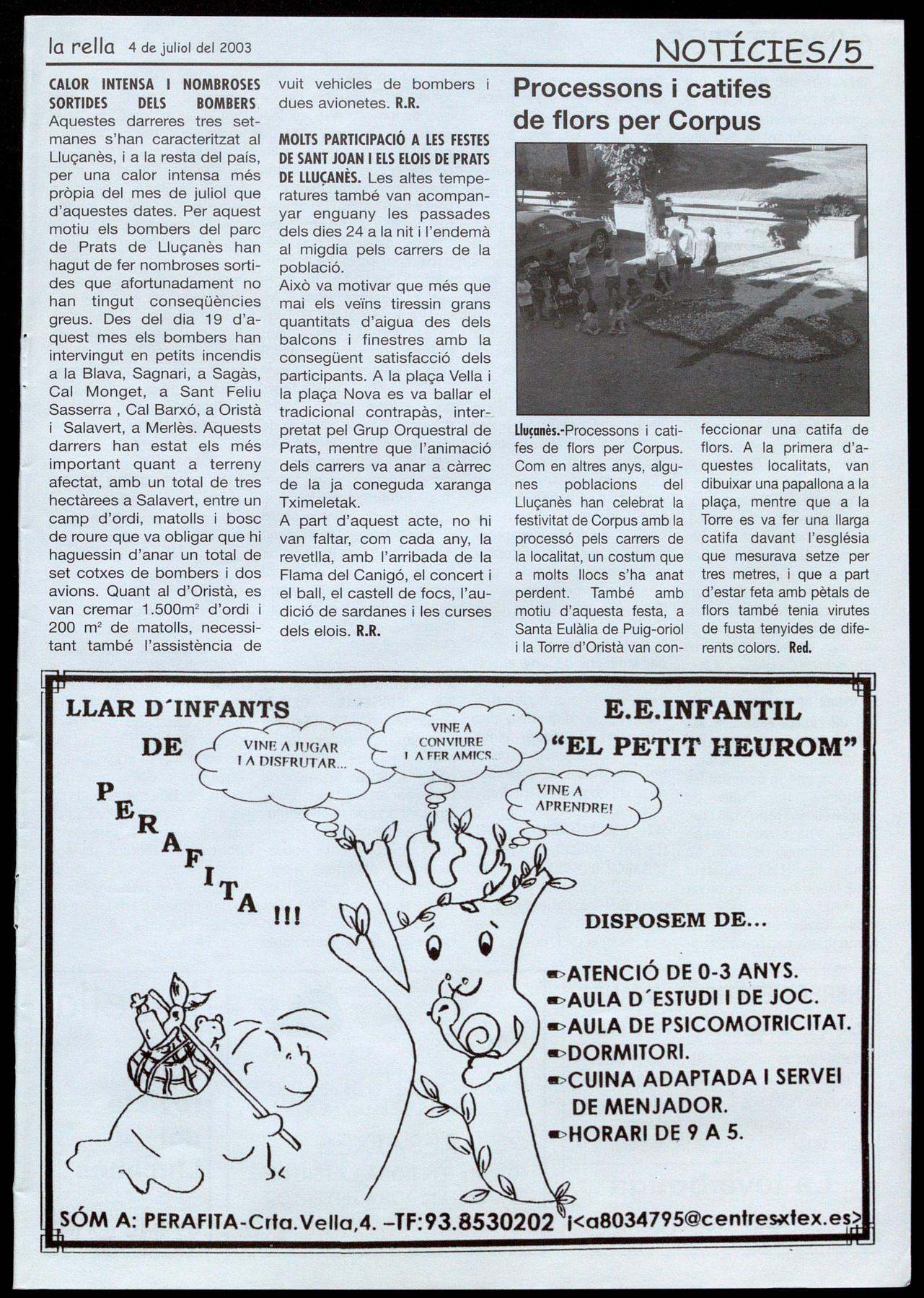 Smta EuIà&a de Puig-orio!. - Durant el mes dejuliol, de dilluns a divendres, de 9 a 1 del matí, al Local social. T.: 93 855 40 42.