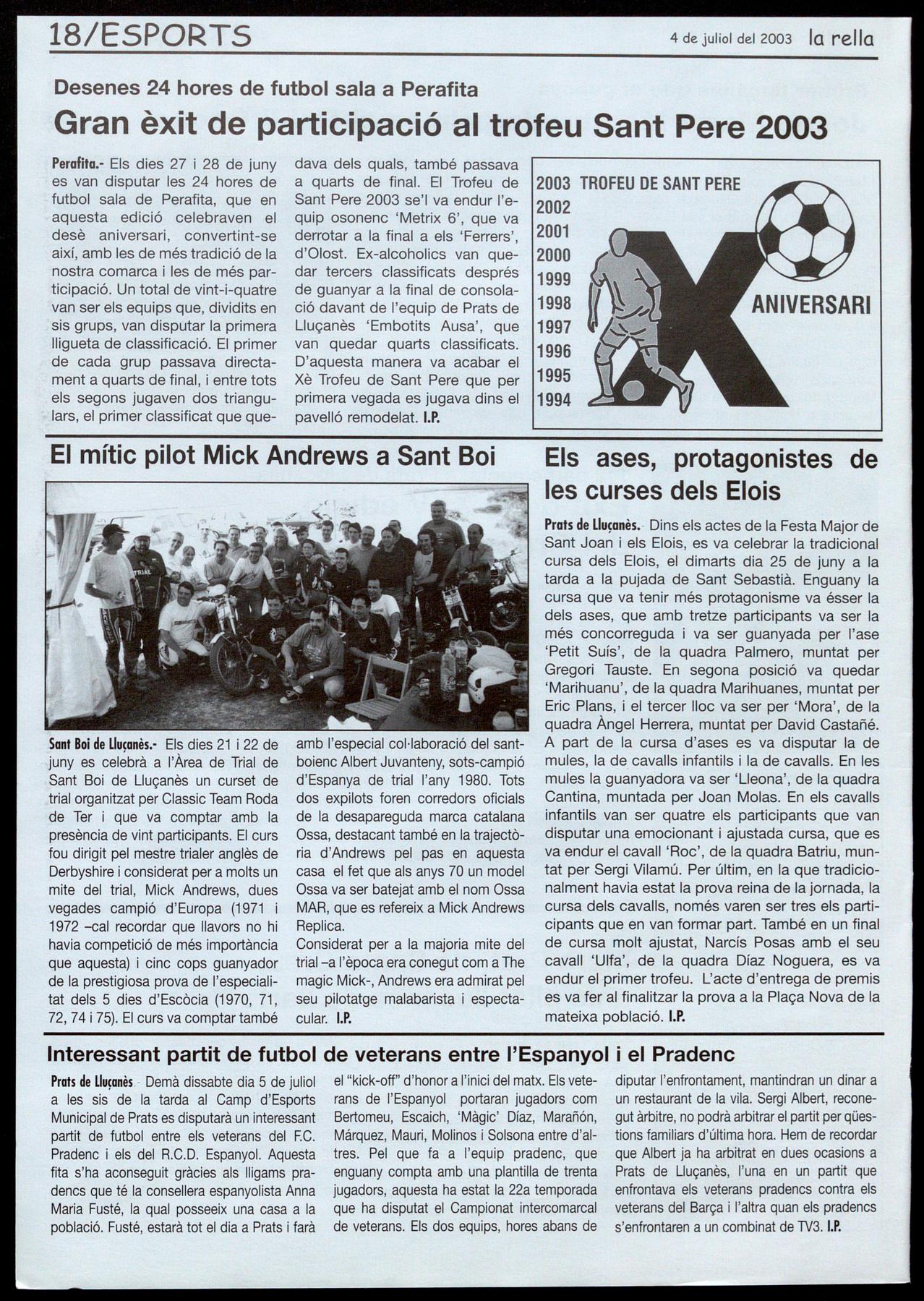 amb l'especial col-laboració del santboienc Albert Juvanteny, sots-campió d'Espanya de trial l'any 1980. Tots dos expilats foren corredors oficials de la desapareguda marca catalana Ossa, destacant també en la trajectòria d'Andrews pel pas en aquesta casa el fet que als anys 70 un model Ossa va ser batejat amb el nom Ossa MAR, que es refereix a Mick Andrews Replica. Considerat per a la majoria mite del trial-a l'època era conegut com a The magic Mick-, Andrews era admirat pel seu pilotatge malabarista espectacular. I.P. 2003 TROFEU DE SANT PERE