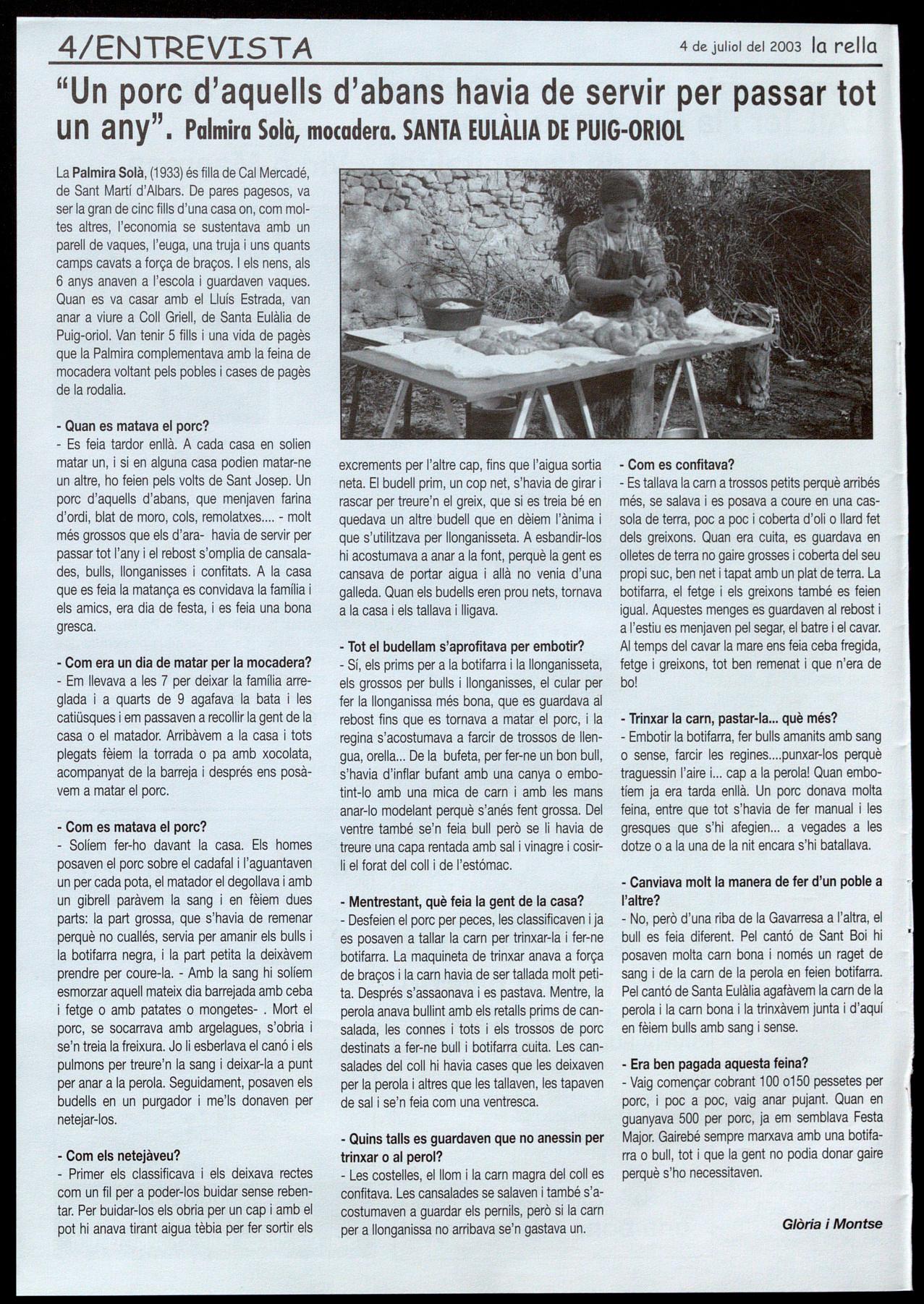 "Un porc d'aquells d'abans havia de servir per passar tot u n any". Palmira Solà, mocadera. SANTA