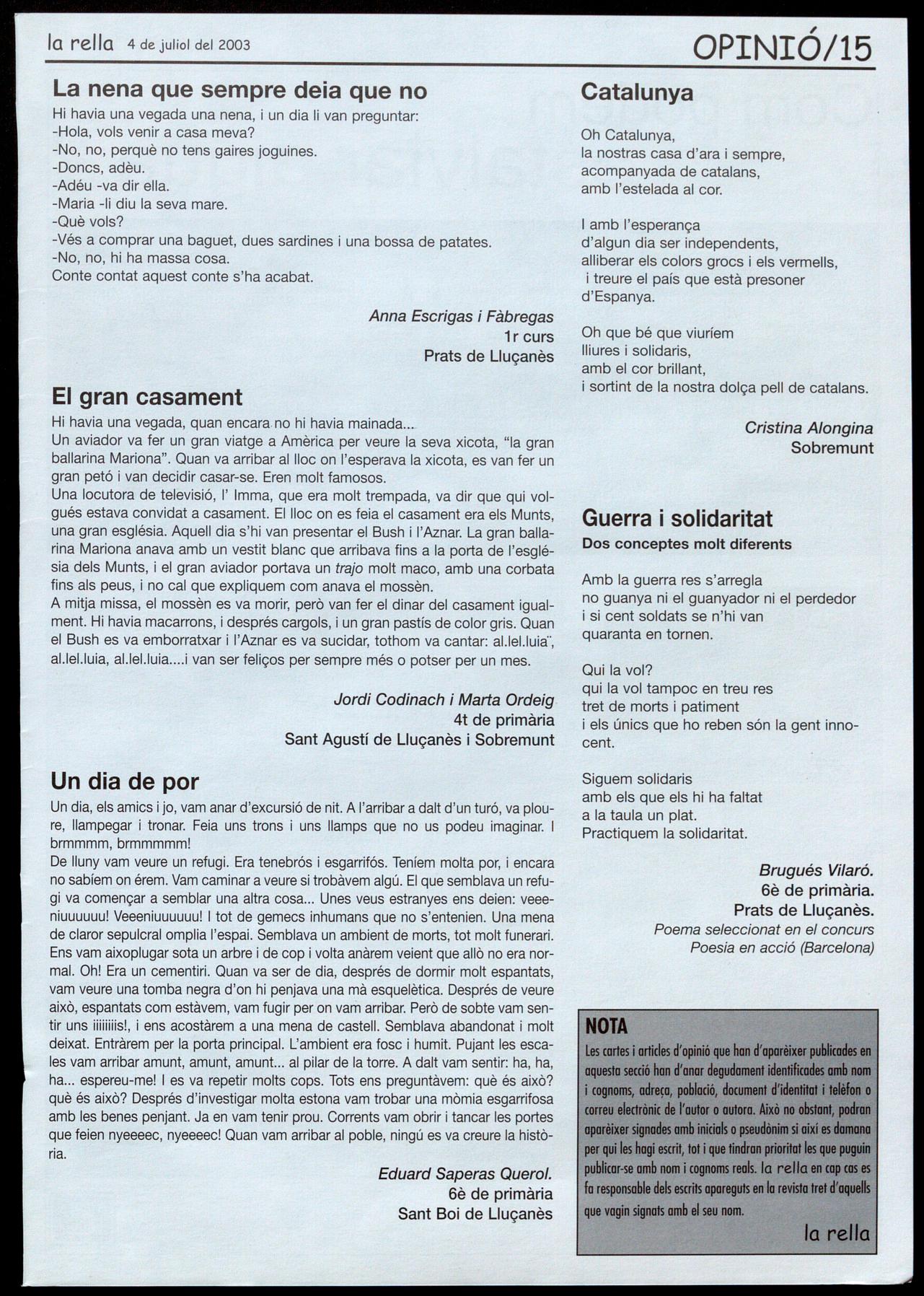 les cortes i articlesd'opinió que han d'aparèixer publi(odes en aquesta secció han d'anar degudament identificades amb nom i cognoms, adreço, població, document d'identitat i telèfon o correu electrònic de I'oufor o autora. Això no obstant, podran aparèixer signades amb inicials o pseudònim si així es domono per qui les hagiescrit, tot i que tindran prioritat les que puguin publicar-se amb nom i cognoms reals. la rella en cop cos es fa responsable dels escrits apareguts en la revisto fret d'oquelk que vagin signats amb el seu nom. la rella