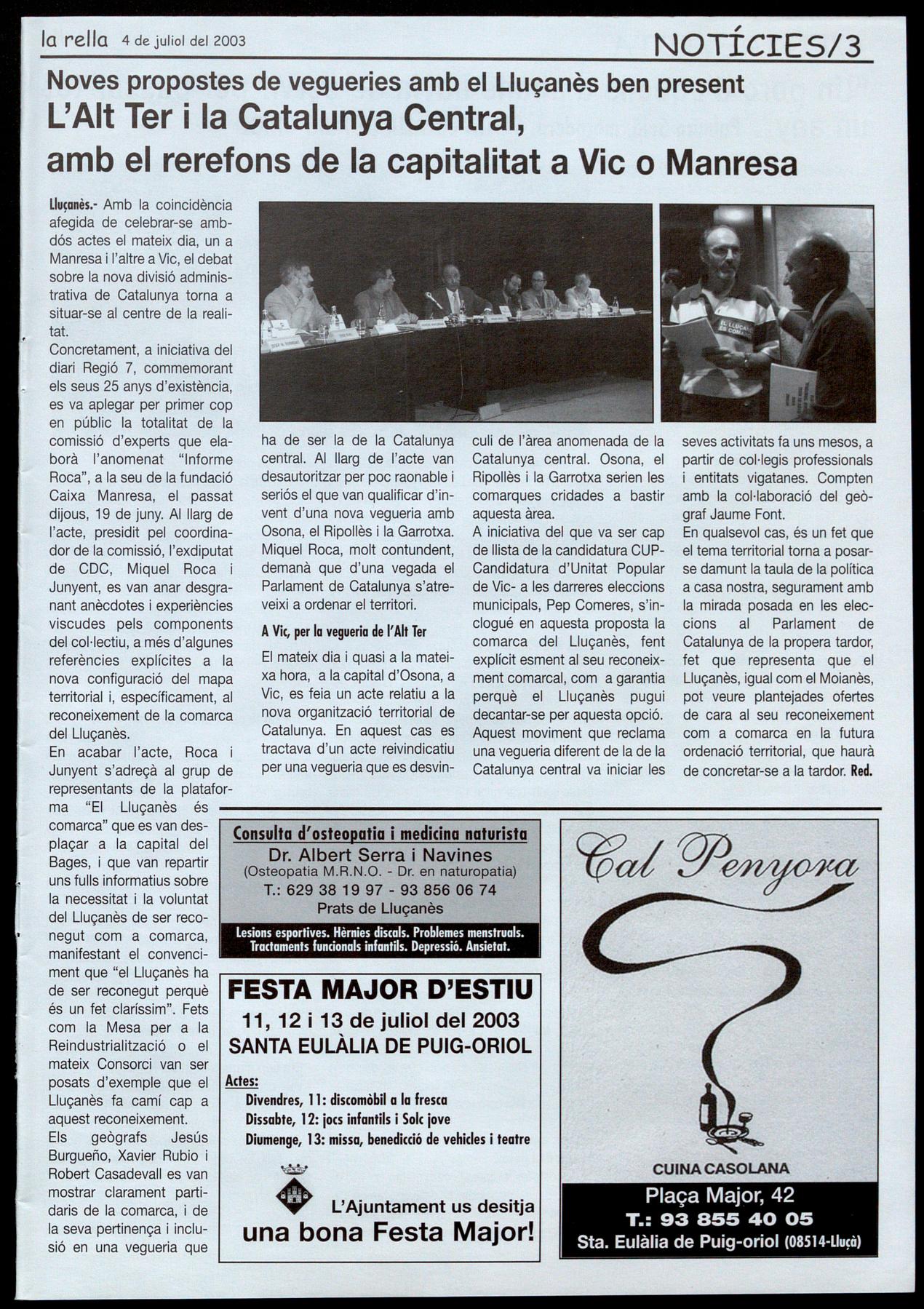 En qualsevol cas, és un fet que el tema territorial torna a posarse damunt la taula de la política a casa nostra, segurament amb la mirada posada en les eleccions al Parlament de Catalunya de la propera tardor, fet que representa que el Lluçanès, igual com el Moianès, pot veure plantejades ofertes de cara al seu reconeixement com a comarca en la futura ordenació territorial, que haurà de concretar-se a la tardor. Red.