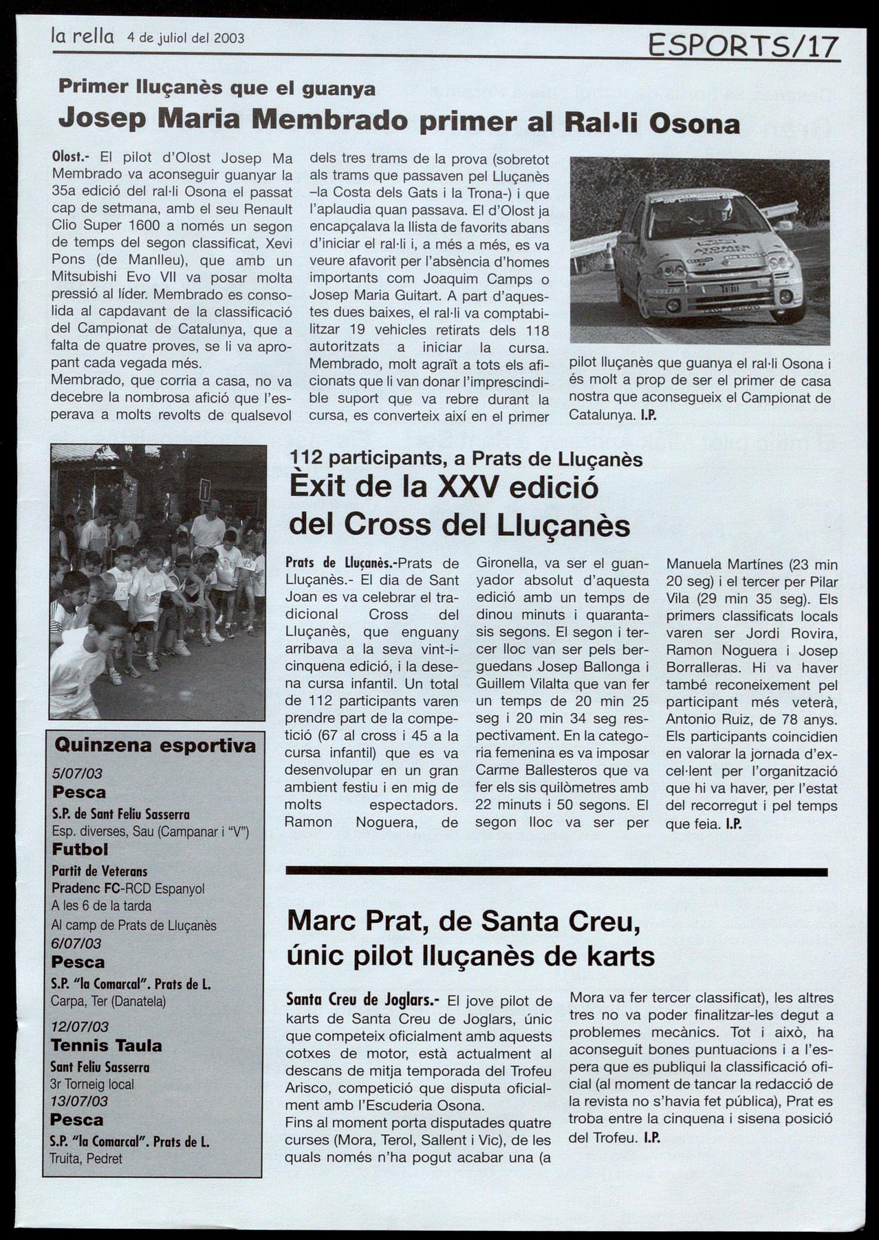 Santa Creu de Joglars.- El jove pilot de karts de Santa Creu de Joglars, únic que competeix oficialment amb aquests cotxes de motor, està actualment al descans de mitja temporada del Trofeu Arisco, competició que disputa oficialment amb l'Escuderia Osona. Fins al moment porta disputades quatre curses (Mora, Terol, Sallent i Vic), de les quals només n'ha poqut acabar una (a