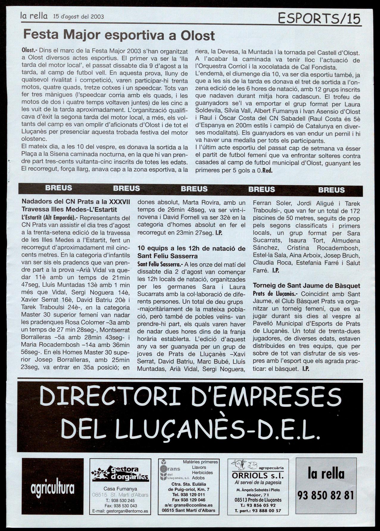 Olost.- Dins el marc de la Festa Major 2003 s'han organitzat a Olost diversos actes esportius. El primer va ser la 'lla tarda del motor local', el passat dissabte dia 9 d'agost a la tarda, al camp de futbol vell. En aquesta prova, lluny de qualsevol rivalitat i competició, varen participar-hi trenta motos, quatre quads, tretze cotxes un speedcar, Tots van fer tres mànigues (I'speedcar corria amb els quads, i les motos de dos i quatre temps voltaven juntes) de les cinc a les vuit de la tarda aproximadament. L'organització qualificava d'èxit la segona tarda del motor local, a més, els voltants del camp es van omplir d'aficionats d'Olost i de tot el Lluçanès per presenciar aquesta trobada festiva del motor olostenc.