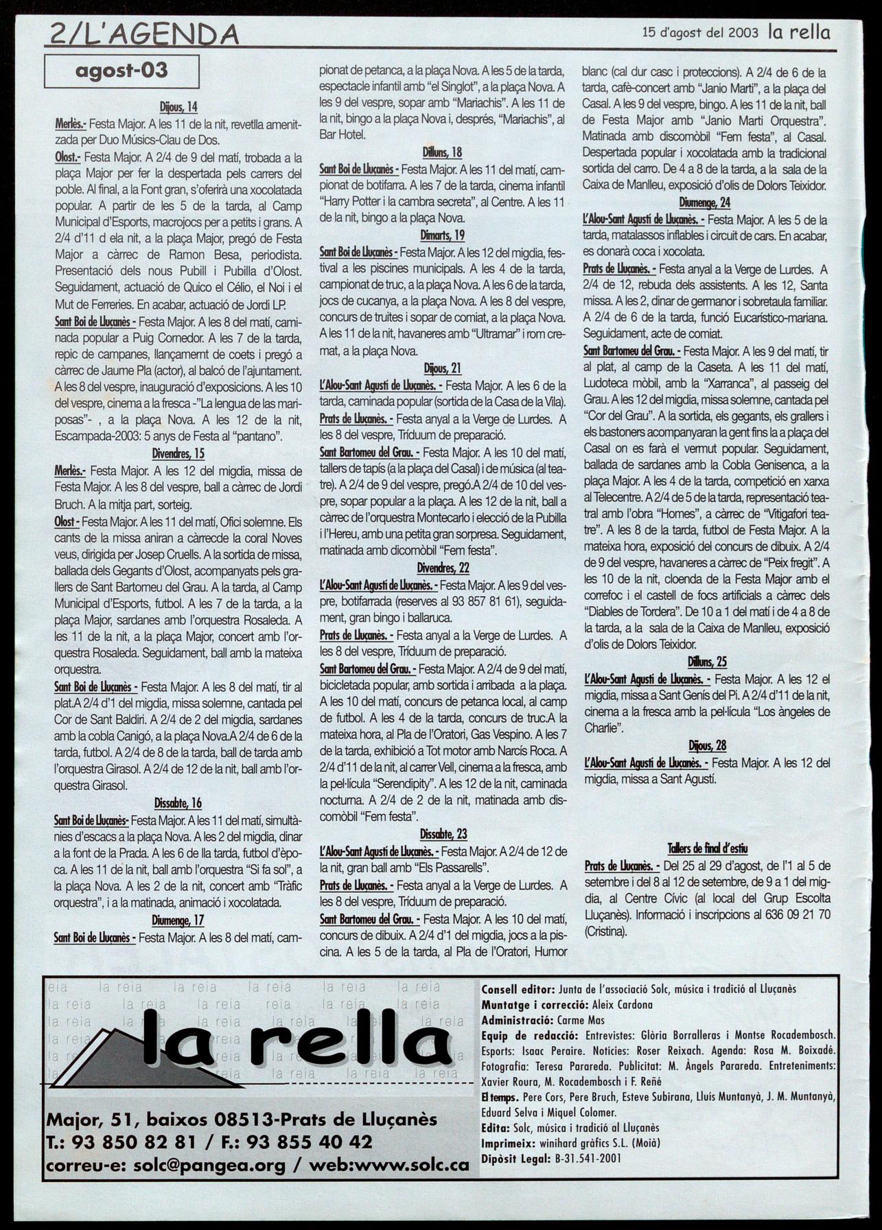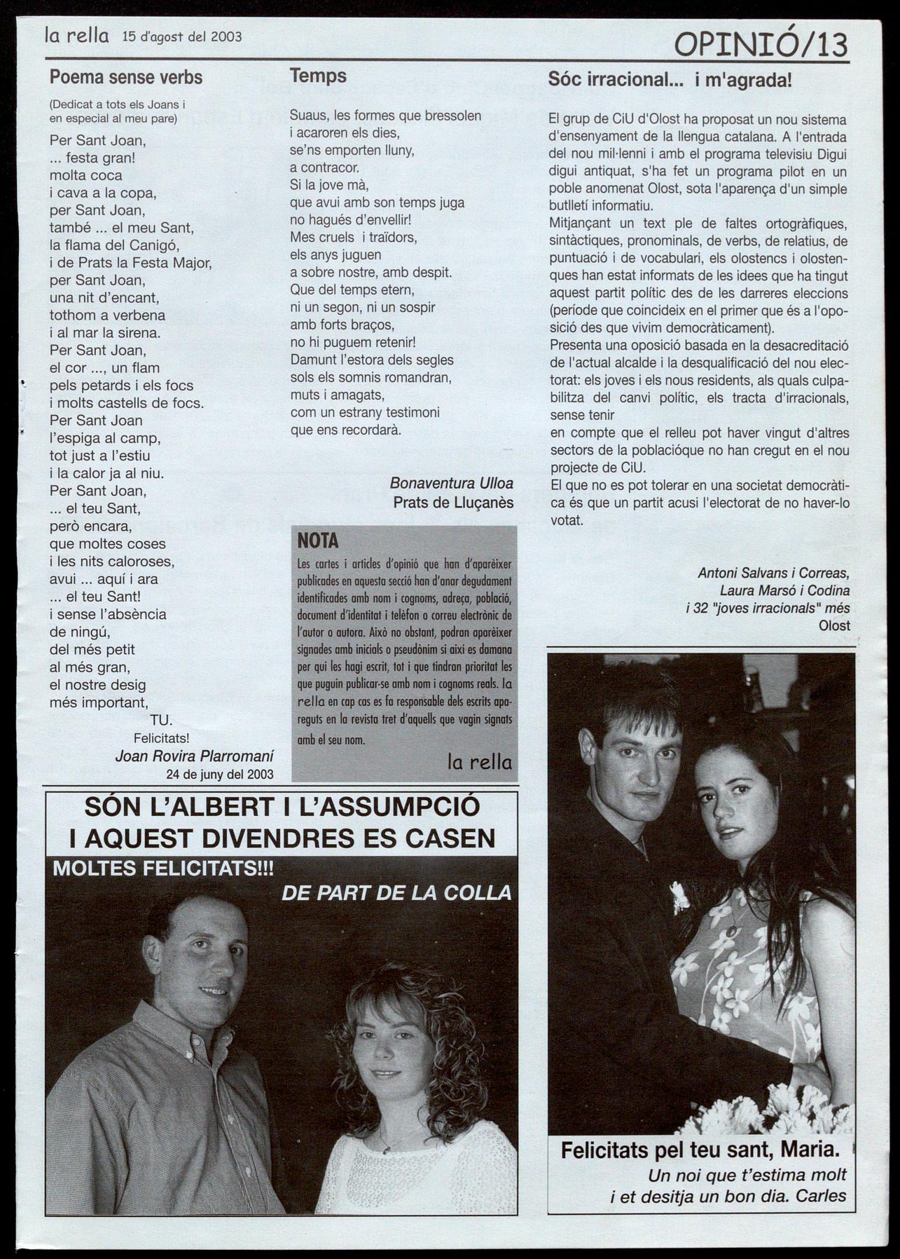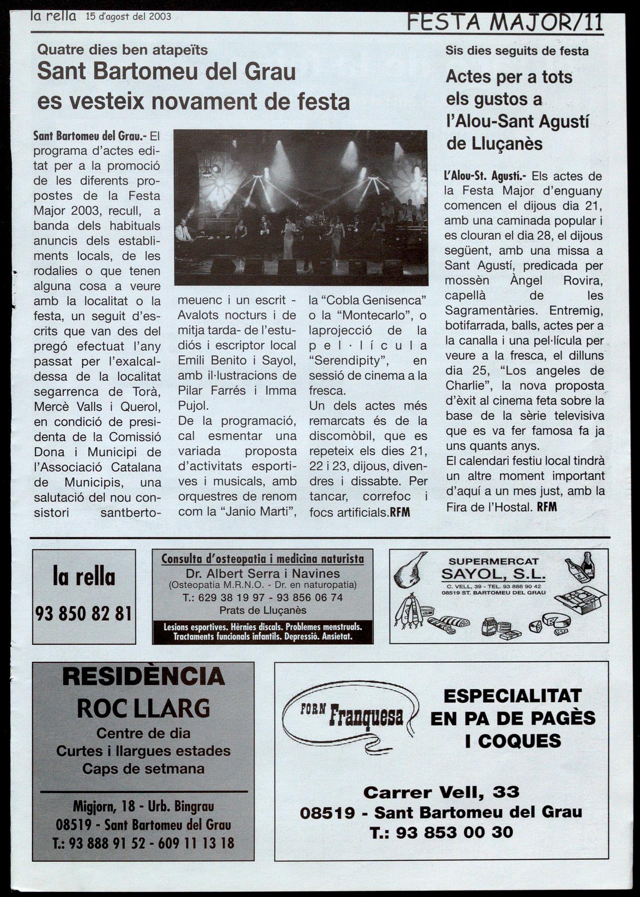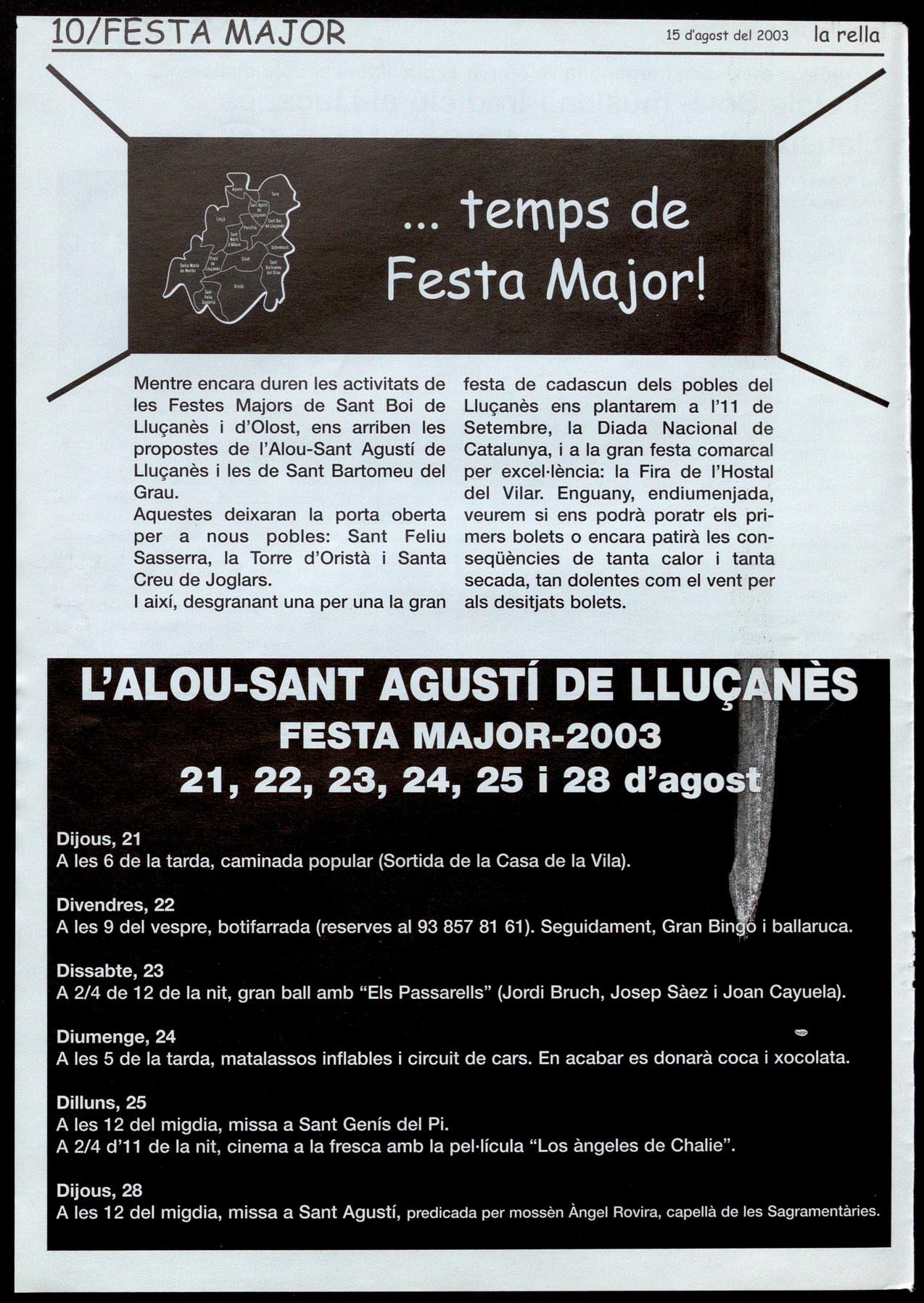 Olost Festa Major. A 2/4 de 9 del matí, trobada a la plaça Major per fer la despertada pels carrers del poble. AI final, a la Font gran, s'oferirà una xocolatada popular. A partir de les 5 de la tarda, al Camp Municipal d'Esports, macrojocs per a petts grans. A 2/4 d'11 d ela nIT, a la plaça Major, pregó de Festa Major a càrrec de Ramon Besa, periodista. Presentació dels nous Pubill Pubilla d'Olost. Seguidament, actuació de Quico el Célio, el Noi i el Mut de Ferreries. En acabar, actuació de Jordi LP. Sant Boi de Uuconès Festa Major. A les 8 del matí, caminada popular a Puig Comedor. A les 7 de la tarda, repic de campanes, IIançamernt de coets pregó a càrrec de Jaume Pla (actor), al balcó de l'ajuntament. A les 8del vespre, inauguraciód'exposicions. Ales 10 del vespre, cinema a lafresca -"La lengua de las mariposas"- a la plaça Nova. A les 12 de la nIT, Escampada-2003: 5 anys de Festa al "pantano".
