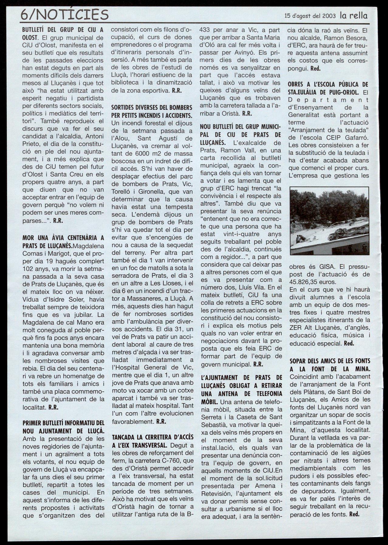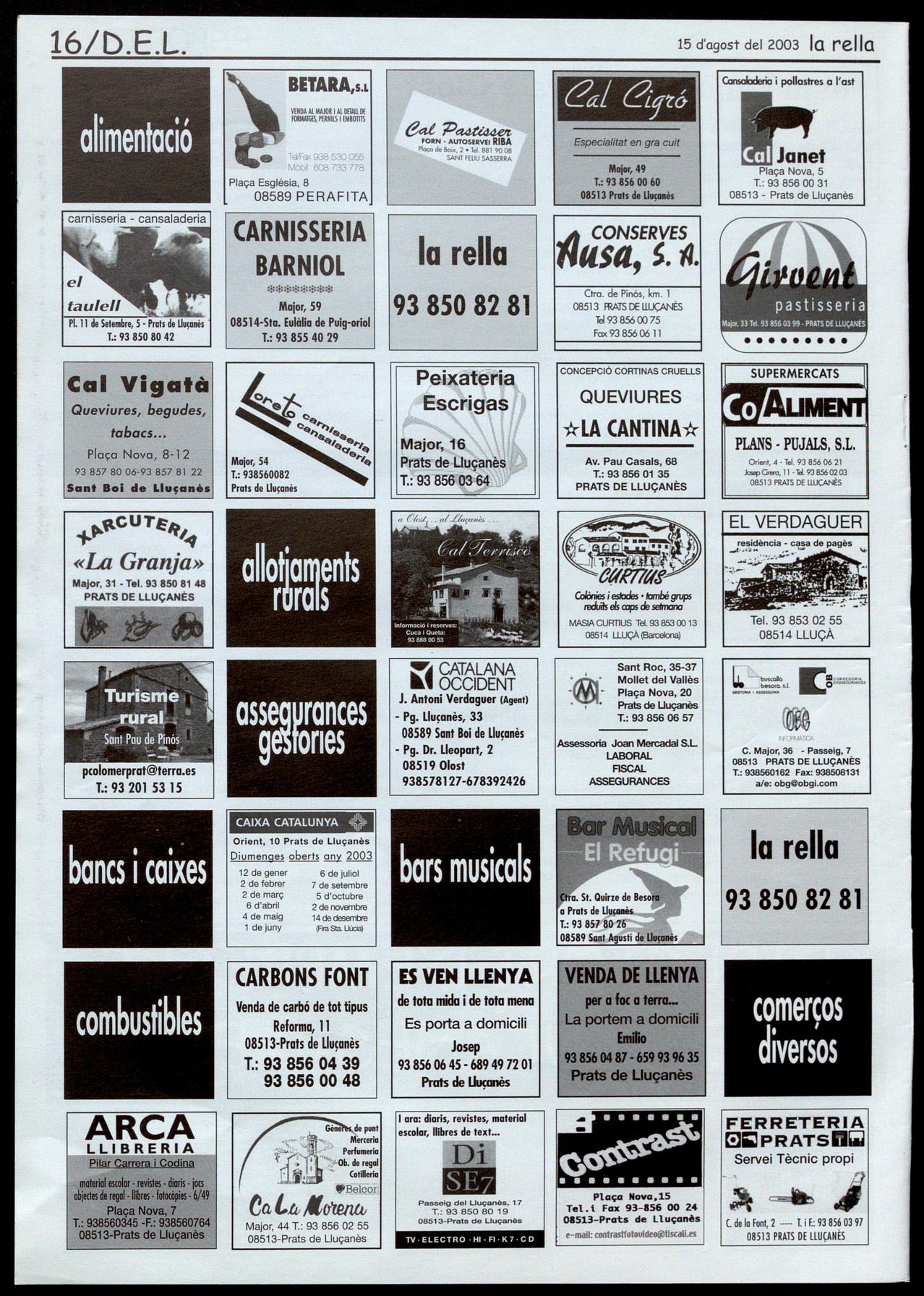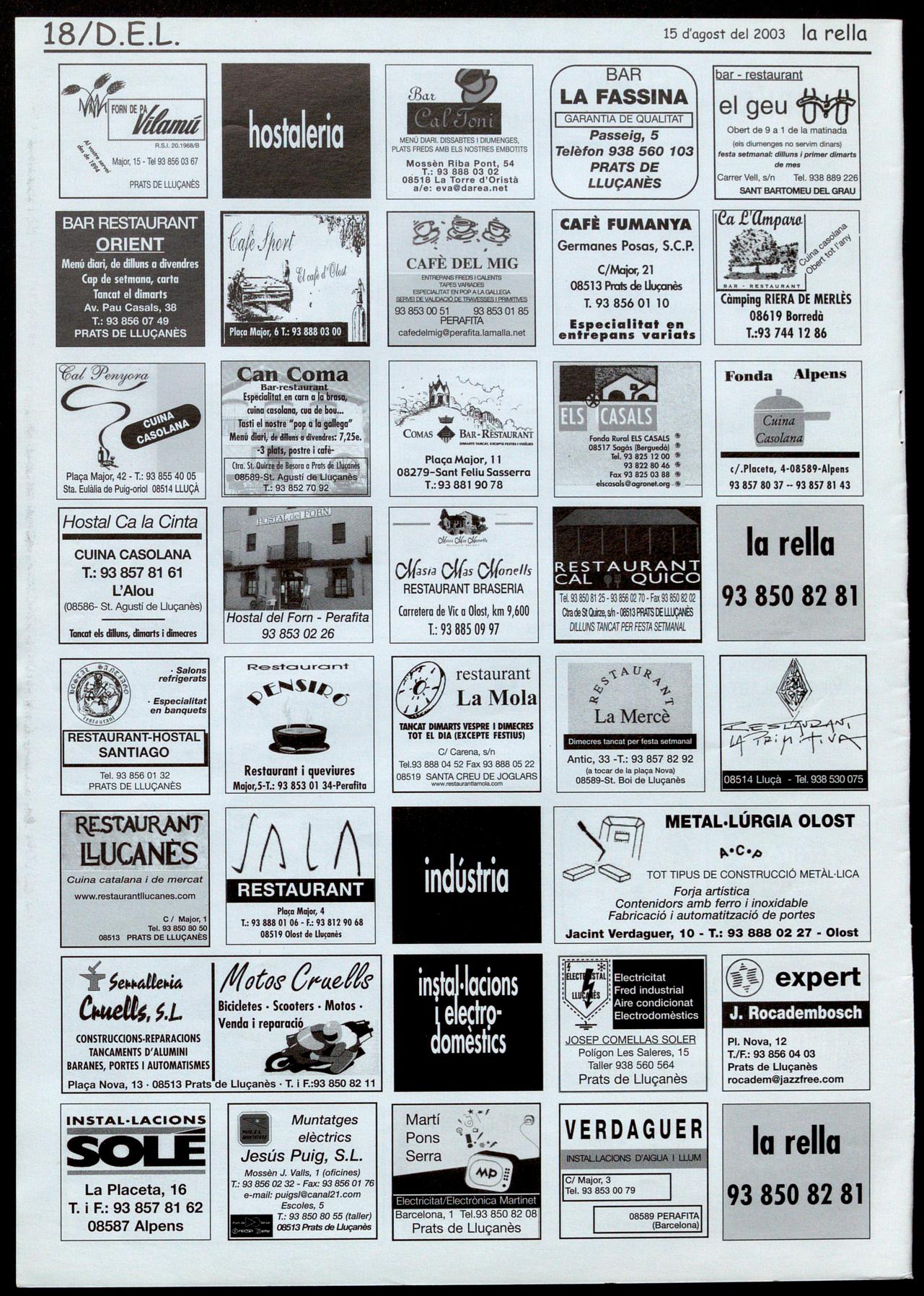 Olost Festa Major. A 2/4 de 9 del matí, trobada a la plaça Major per fer la despertada pels carrers del poble. AI final, a la Font gran, s'oferirà una xocolatada popular. A partir de les 5 de la tarda, al Camp Municipal d'Esports, macrojocs per a petts grans. A 2/4 d'11 d ela nIT, a la plaça Major, pregó de Festa Major a càrrec de Ramon Besa, periodista. Presentació dels nous Pubill Pubilla d'Olost. Seguidament, actuació de Quico el Célio, el Noi i el Mut de Ferreries. En acabar, actuació de Jordi LP. Sant Boi de Uuconès Festa Major. A les 8 del matí, caminada popular a Puig Comedor. A les 7 de la tarda, repic de campanes, IIançamernt de coets pregó a càrrec de Jaume Pla (actor), al balcó de l'ajuntament. A les 8del vespre, inauguraciód'exposicions. Ales 10 del vespre, cinema a lafresca -"La lengua de las mariposas"- a la plaça Nova. A les 12 de la nIT, Escampada-2003: 5 anys de Festa al "pantano".