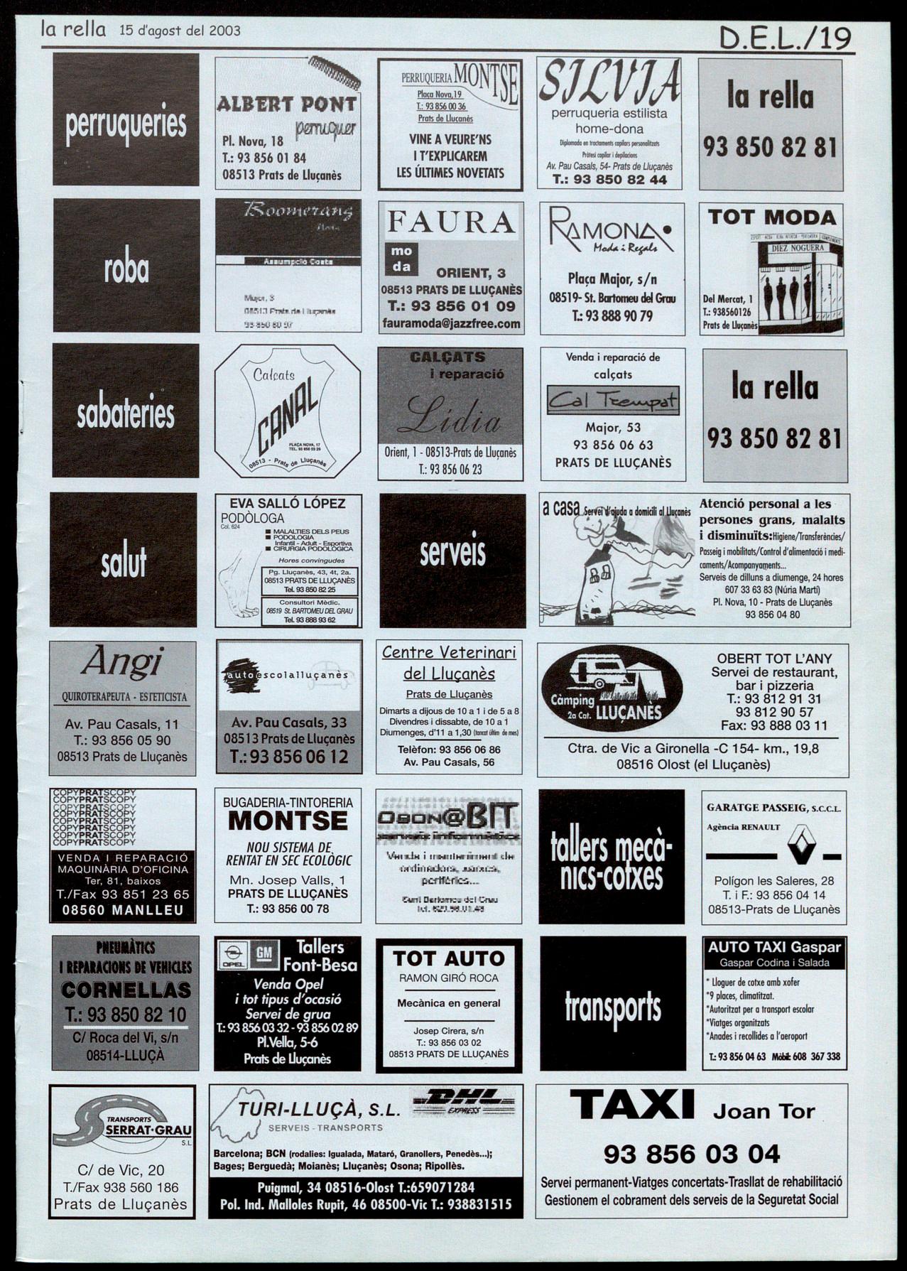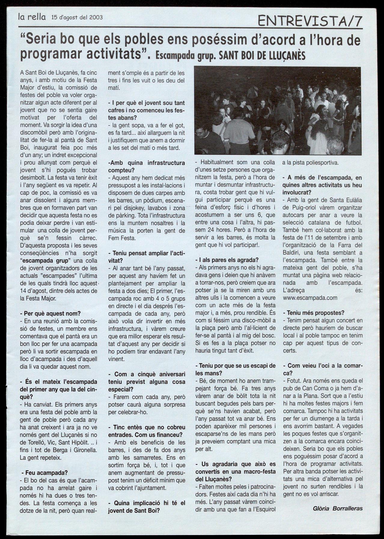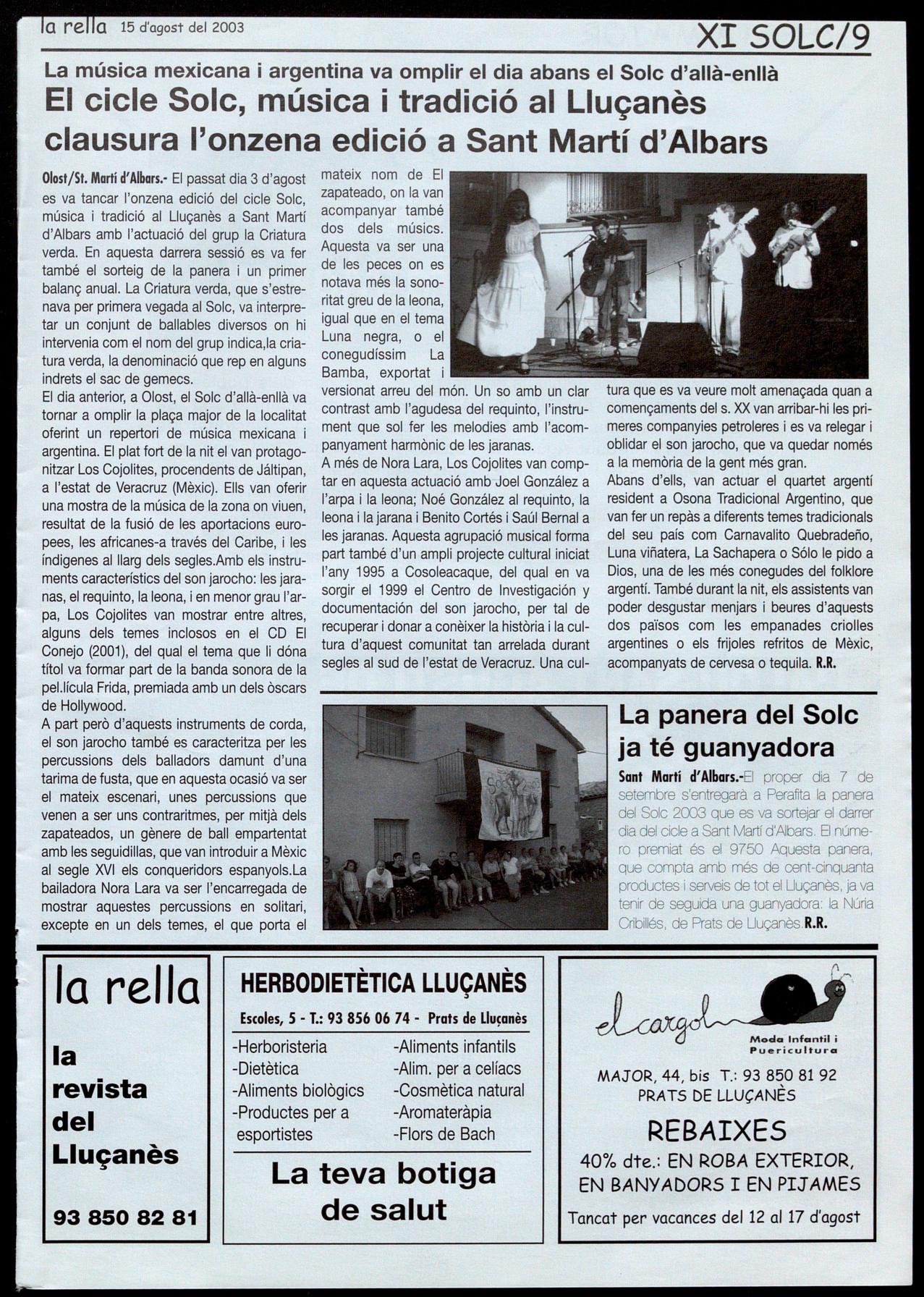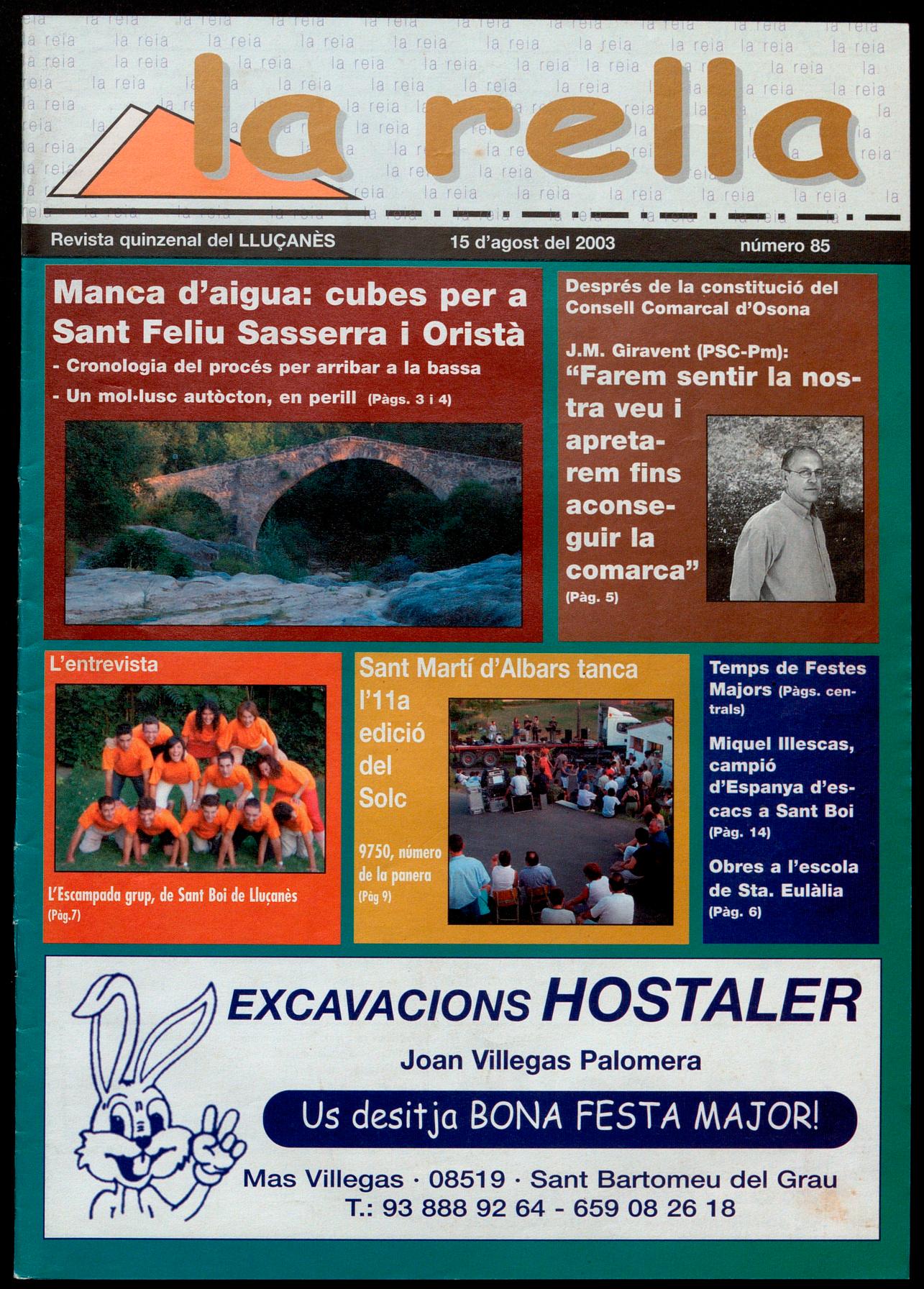 Olost Festa Major. A 2/4 de 9 del matí, trobada a la plaça Major per fer la despertada pels carrers del poble. AI final, a la Font gran, s'oferirà una xocolatada popular. A partir de les 5 de la tarda, al Camp Municipal d'Esports, macrojocs per a petts grans. A 2/4 d'11 d ela nIT, a la plaça Major, pregó de Festa Major a càrrec de Ramon Besa, periodista. Presentació dels nous Pubill Pubilla d'Olost. Seguidament, actuació de Quico el Célio, el Noi i el Mut de Ferreries. En acabar, actuació de Jordi LP. Sant Boi de Uuconès Festa Major. A les 8 del matí, caminada popular a Puig Comedor. A les 7 de la tarda, repic de campanes, IIançamernt de coets pregó a càrrec de Jaume Pla (actor), al balcó de l'ajuntament. A les 8del vespre, inauguraciód'exposicions. Ales 10 del vespre, cinema a lafresca -"La lengua de las mariposas"- a la plaça Nova. A les 12 de la nIT, Escampada-2003: 5 anys de Festa al "pantano".