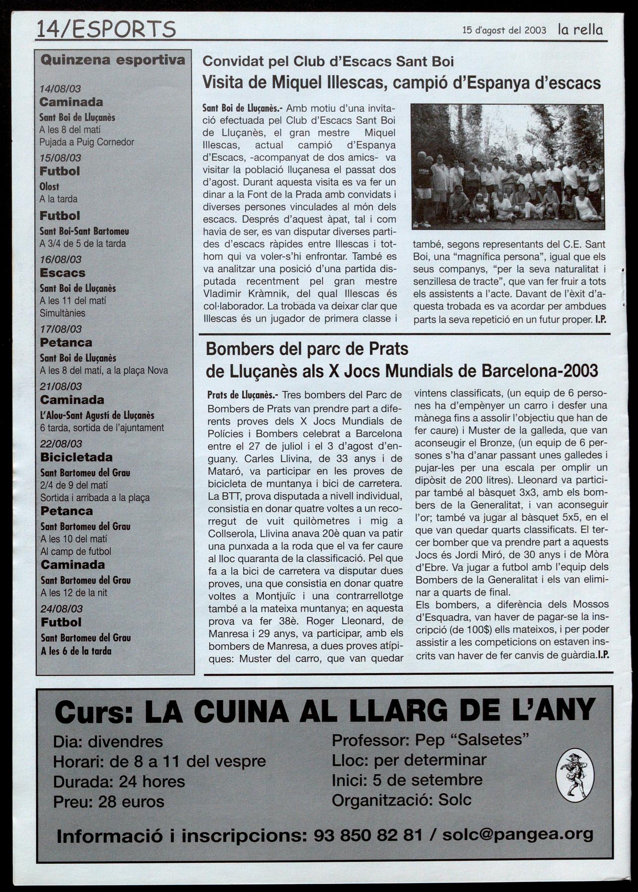 Sani Boi de Lluçanès.- Amb motiu d'una invitació efectuada pel Club d'Escacs Sant Boi de Lluçanès, el gran mestre Miquel Illescas, actual campió d'Espanya d'Escacs, -acompanyat de dos amics- va visitar la població lluçanesa el passat dos d'agost. Durant aquesta visita es va fer un dinar a la Font de la Prada amb convidats i diverses persones vinculades al món dels escacs. Després d'aquest àpat, tal i com havia de ser, es van disputar diverses partides d'escacs ràpides entre Iliescas tothom qui va voler-s'hi enfrontar. També es va analitzar una posició d'una partida disputada recentment pel gran mestre Vladimir Kràmnik, del qual Iliescas és col·laborador. La trobada va deixar clar que Iliescas és un jugador de primera classe i