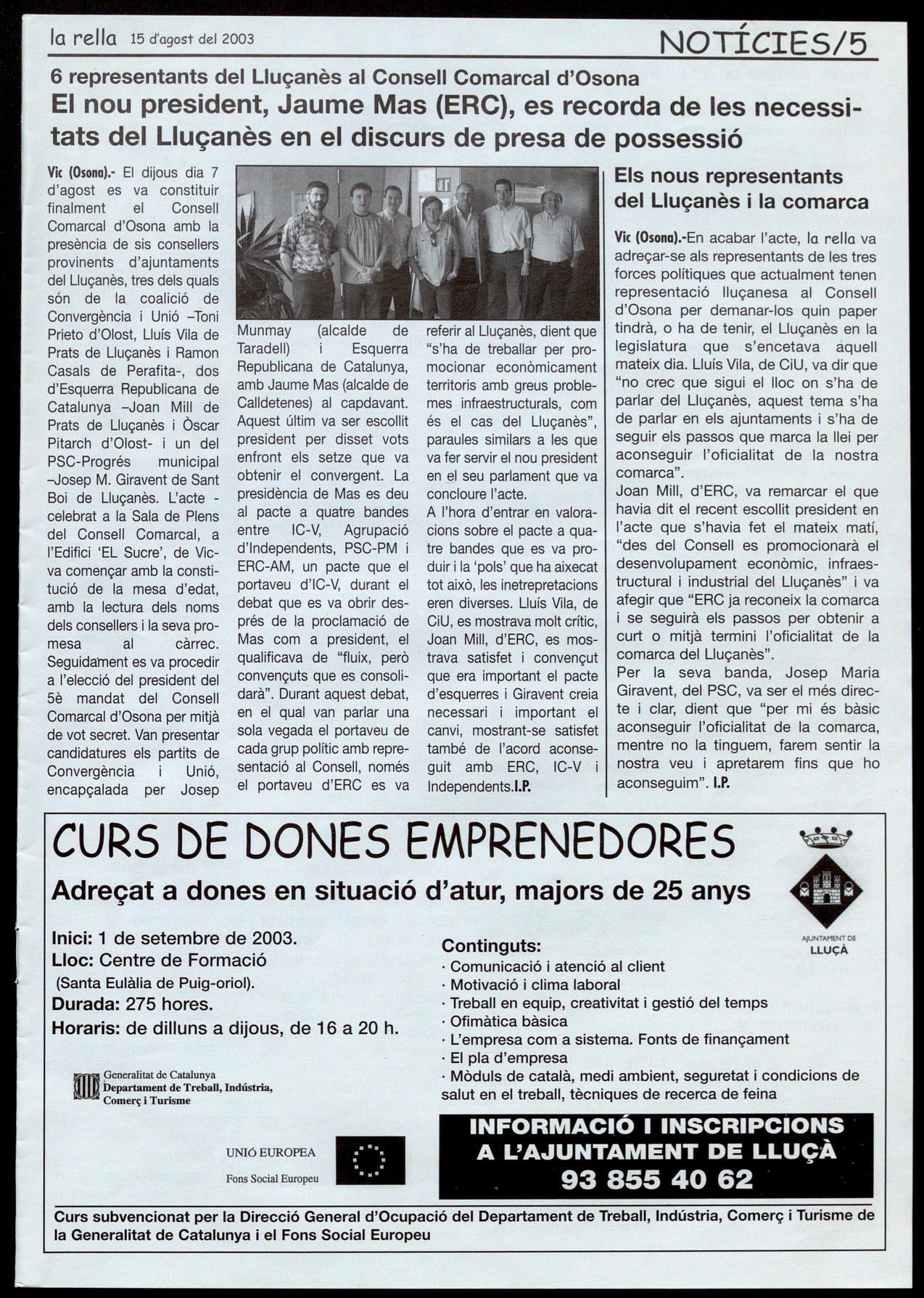 Vic (Osono)."En acabar l'acte, la rella va adreçar-se als representants de les tres forces polítiques que actualment tenen representació lluçanesa al Consell d'Osona per demanar-los quin paper tindrà, a ha de tenir, el Lluçanès en la legislatura que s'encetava àquell mateix dia. Lluís Vila, de CiU, va dir que "no crec que sigui el lloc on s'ha de parlar del Lluçanès, aquest tema s'ha de parlar en els ajuntaments s'ha de seguir els passos que marca la llei per aconseguir l'oficialitat de la nostra comarca".