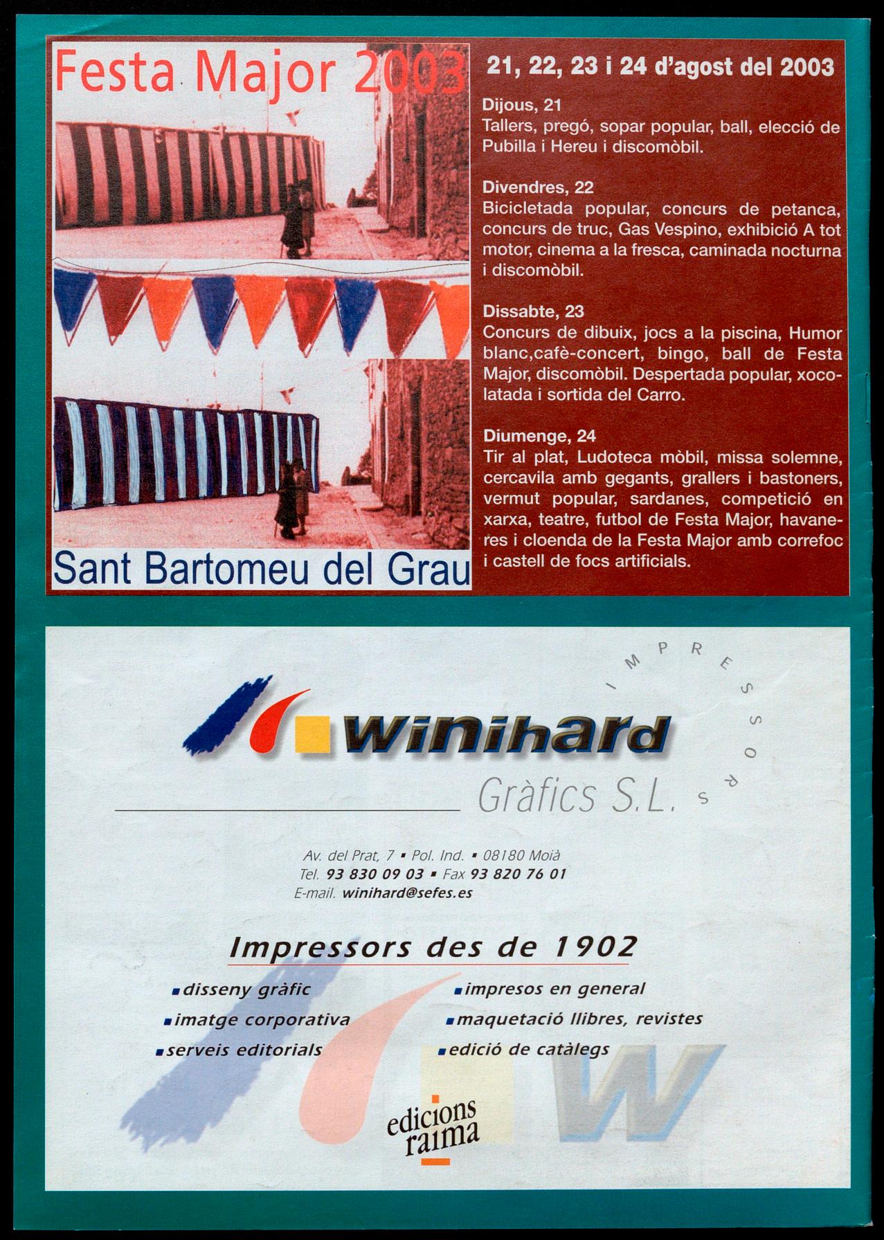 Smt Bcrtomeudel Grw." Festa Major. A 2/4 de 9 del matí, bicicletada popular, amb sortida arribada a la plaça. A les 10 del matí, concurs de petanca local, al camp de futbol. A les 4 de la tarda, concurs de trucA la mateixa hora, al Pla de l'Oratori, Gas Vespino. A les 7 de latarda, exhibició a Tot motor amb Narcís Roca. A 2/4d'11 de la nIT, al carrerVell, cinema a lafresca, amb la peJ.lícula"Serendipity". A les 12 de la nIT, caminada noctuma. A 2/4 de 2 de la nIT, matinada amb discomòbil "Fem festa".