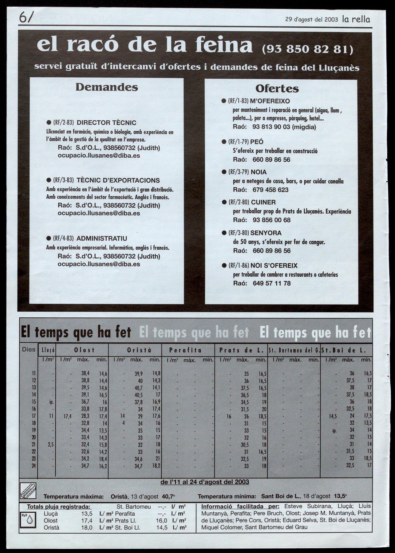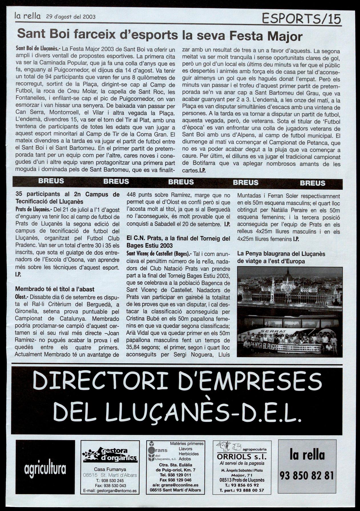 Sant Boi de Llu�anès.- La Festa Major 2003 de Sant Boi va oferir un ampli i divers ventall de propostes esportives. La primera cita va ser la Caminada Popular, que ja fa una colla d'anys que es fa, enguany al Puigcornedor, el dijous dia 14 d'agost. Va tenir un total de 94 participants que varen fer uns 8 quilòmetres de recorregut, sortint de la Plaça, dirigint-se cap al Camp de Futbol, la roca de Creu Molar, la capella de Sant Roc, les Fontanelles, enfilant-se cap el pic de Puigcornedor, on van esmorzar i van hissar una senyera. De baixada van passar per Can Serra, Montorroell, el Vilar i altra vegada la Plaça. L'endemà, divendres 15, va ser el torn del Tir al Plat, amb una trentena de participants de totes les edats que van jugar a aquest esport minoritari al Camp de Tir de la Coma Gran. El mateix divendres a la tarda es va jugar el partit de futbol entre el Sant Boi el Sant Bartomeu. En el primer partit de pretemporada tant per un equip com per l'altre, cares noves i conegudes d'un altre equip varen protagonitzar una primera part moguda i dominada pels de Sant Bartomeu, que es va finalit-