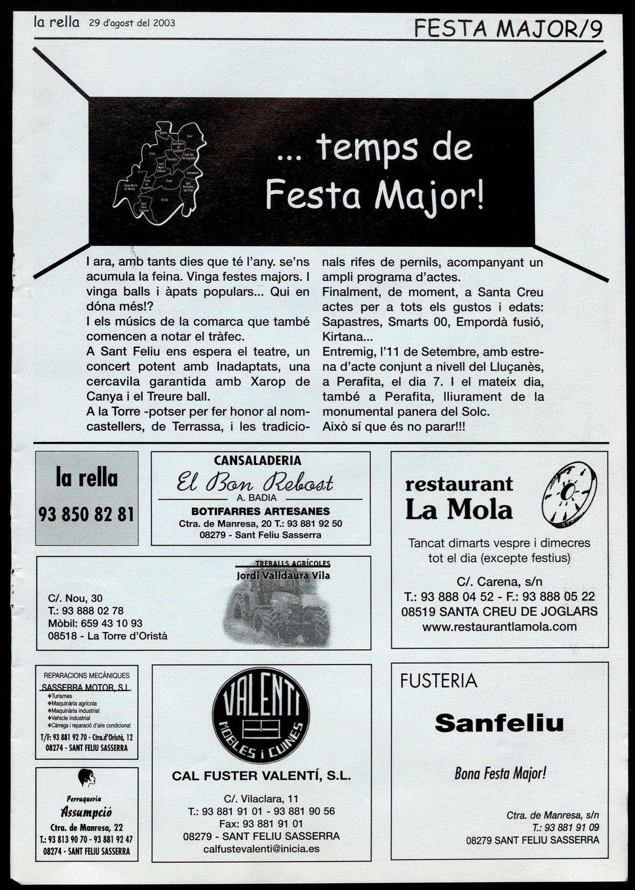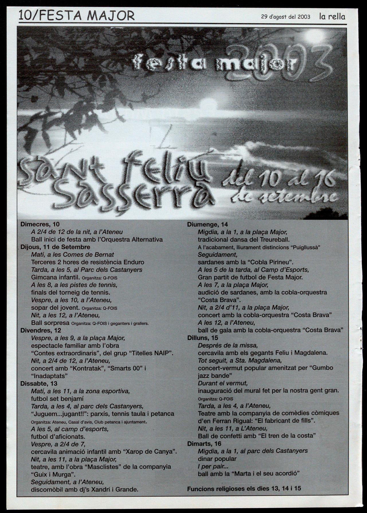 Smt Felu Sasserra.- Festa Major. A les 9 del vespre, a la plaça Major, espectacle familiar amb l'obra "Contes extraordinaris", a càrrec de titelles Naip. A 2/4 de 12 de la nit, a l'Ateneu, concert amb "Kontratak", "Smarts DO" "Inadaptats"
