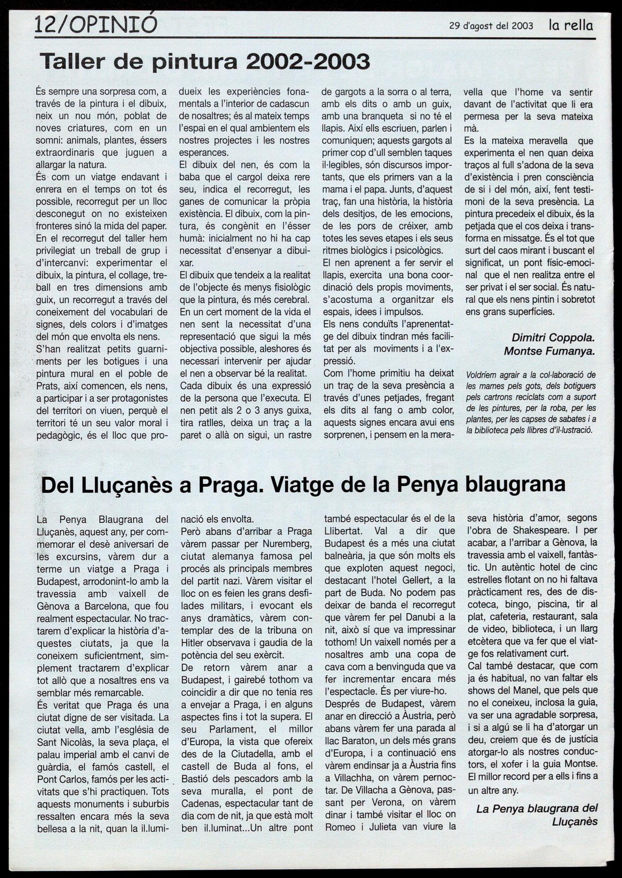 Sant Vicen� de Castellet (Bages).- Tal com anunciava el penúltim número de la rella, nadadors del Club Natació Prats van prendre part a la final del Torneig Bages Estiu 2003, que se celebrava a la població Bagenca de Sant Vicenç de Castellet. Nadadors de Prats. van participar en gairebé la totalitat de les proves que es van disputar, cal destacar la classificació aconseguida per Cristina Bubé en els 50m papallona femenins en que va quedar segona classificada; Arià Vidal que va quedar primer en els 50m papallona masculins fent un temps de 35,84 segons; el primer, segon quart lloc aconseguits per Sergi Noguera, Lluís