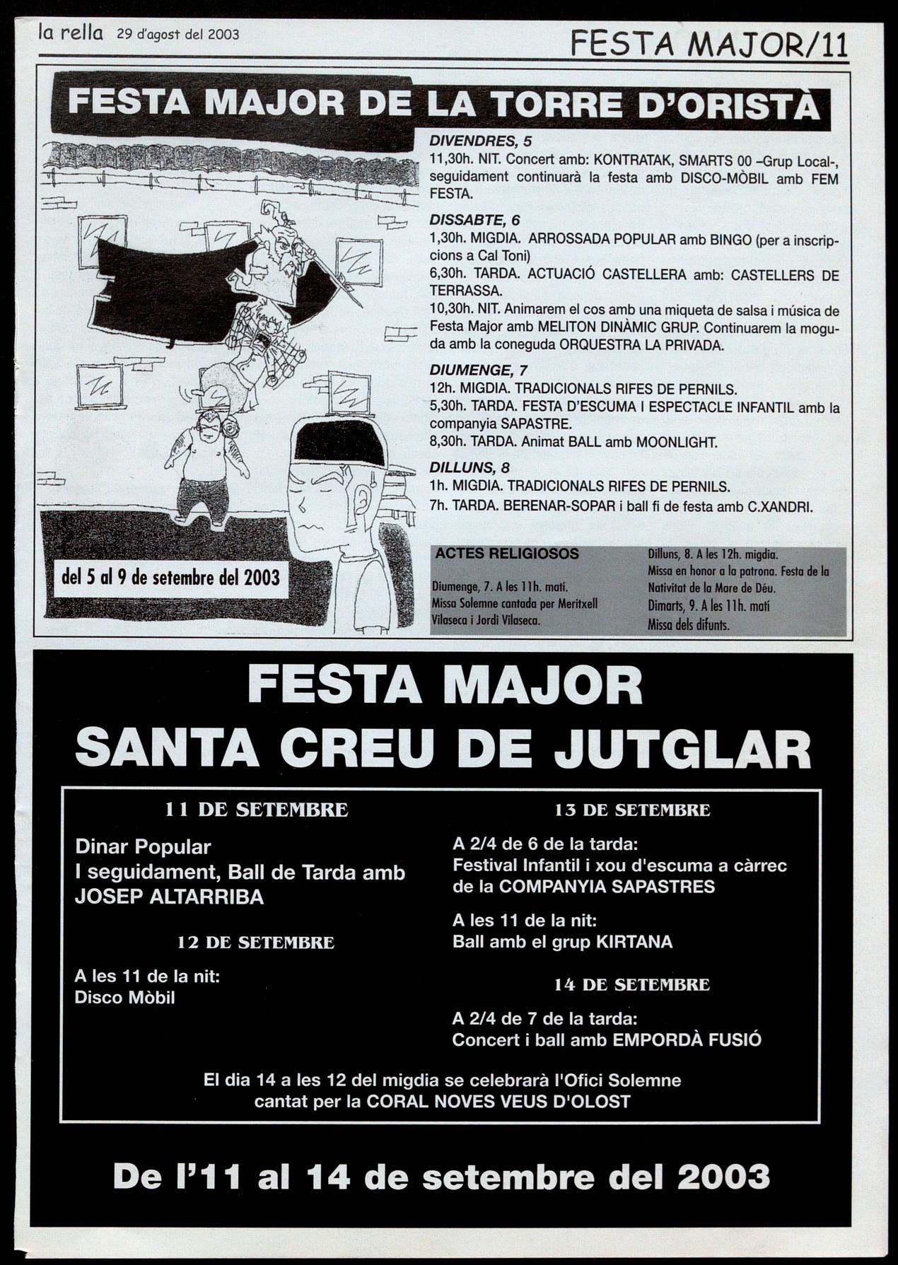 La Torre d'Oristà.- Festa Major. A 2/4 de 12 de la nit, concert amb "Kontratak" "Smarts 00". Seguidament, discomòbil amb "Fem festa".