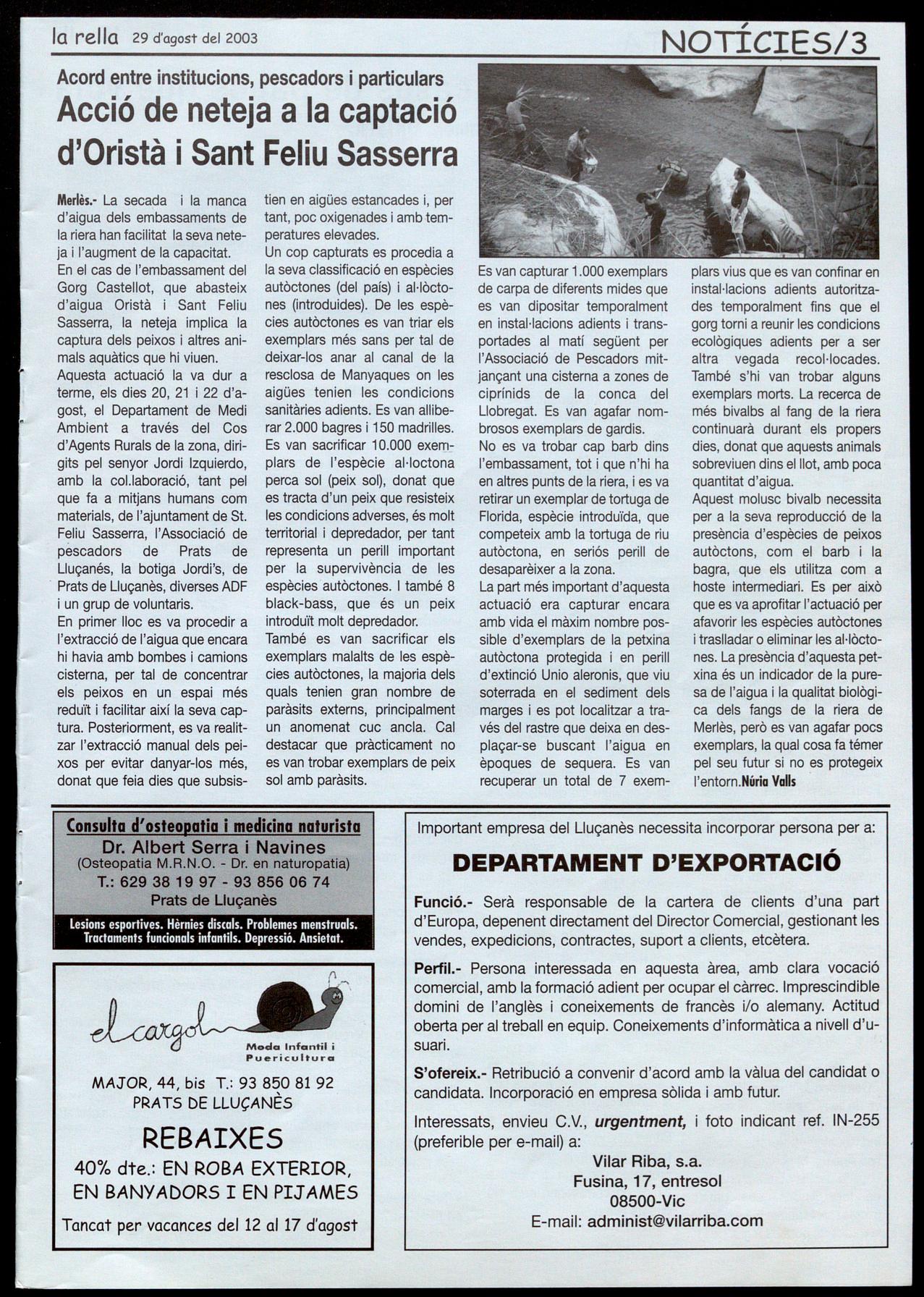 Merlès.- La secada i la manca d'aigua dels embassaments de la riera han facilitat la seva neteja l'augment de la capacitat. En el cas de l'embassament del Gorg Castellot, que abasteix d'aigua Oristà Sant Feliu Sasserra, la neteja implica la captura dels peixos altres animals aquàtics que hi viuen.