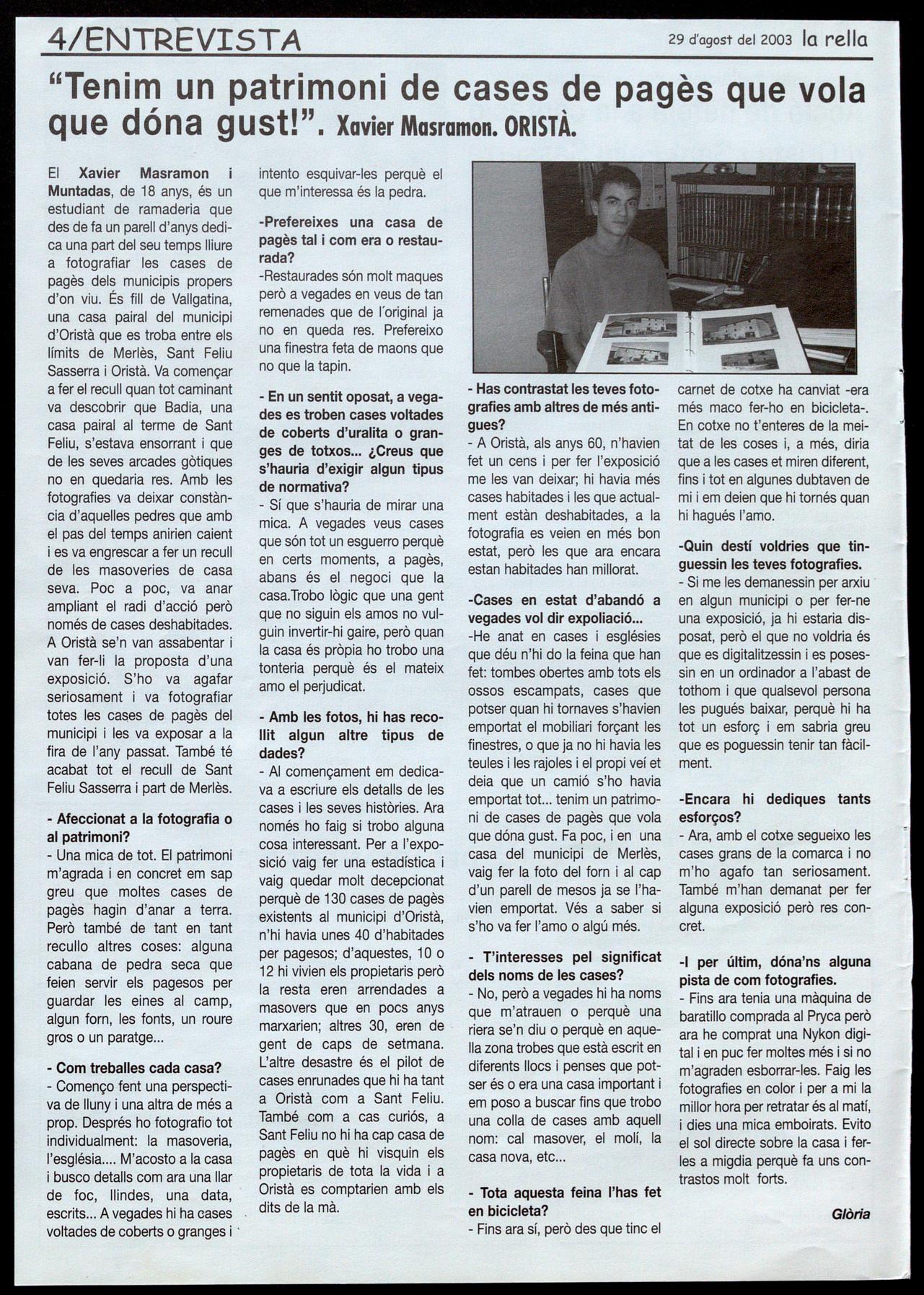El Xavier Masramon i Muntadas, de 18 anys, és un estudiant de ramaderia que des de fa un parell d'anys dedica una part del seu temps lliure a fotografiar les cases de pagès dels municipis propers d'on viu. És fill de Vallgatina, una casa pairal del municipi d'Oristà que es troba entre els límits de Merlès, Sant Feliu Sasserra Oristà. Va començar a fer el recull quan tot caminant va descobrir que Badia, una casa pairal al terme de Sant Feliu, s'estava ensorrant i que de les seves arcades gòtiques no en quedaria res. Amb les fotografies va deixar constància d'aquelles pedres que amb el pas del temps anirien caient i es va engrescar a fer un recull de les masoveries de casa seva. Poc a poc, va anar ampliant el radi d'acció però només de cases deshabitades. A Oristà se'n van assabentar van fer-li la proposta d'una exposició. S'ho va agafar seriosament i va fotografiar totes les cases de pagès del municipi les va exposar a la fira de l'any passat. També té acabat tot el recull de Sant Feliu Sasserra part de Merlès.