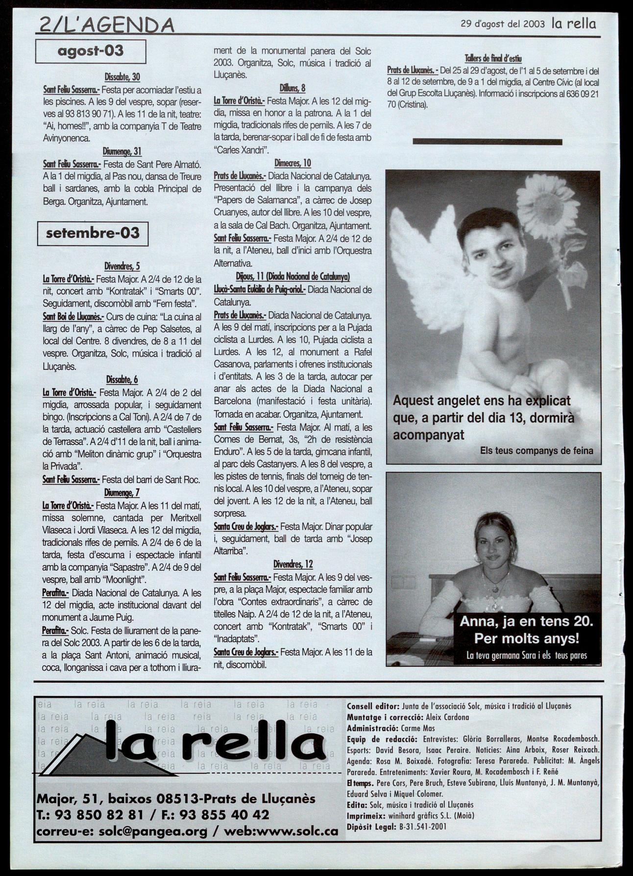 Peralita.- Solc. Festa de lliurament de la panera del Solc 2003. A partir de les 6 de la tarda, a la plaça Sant Antoni, animació musical, coca, llonganissa cava per a tothom lIiura-
