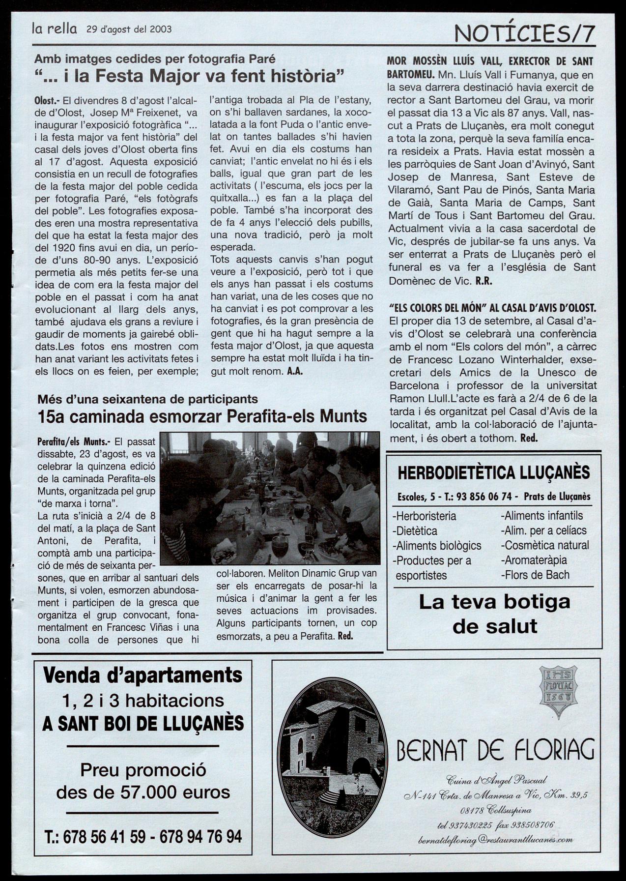 la caminada nocturna. El centenar llarg de participants que es van animar a fer la caminada van recórrer uns 4 km, pels voltants de St.Bartomeu. Ja el diumenge, a primera hora del matí, es va disputar el Tir al plat, al camp de la Caseta. La participació també va ser alta. I a la tarda, va arribar el plat fort: el partit de futbol de Festa Major. Van ser molts els seguidors que es van aplegar a partir de les 6 de la tarda al municipal de St.Bartomeu per veure el partit, que enfrontava l'equip local, el St.Bartomeu el Vic. Aviat va arribar la primera alegria, ja que el St.Bartomeu es va avançar en el marcador, però un Vic més rodat, físicament més fort, va remuntar i es va endur el partit per un clar, i excessiu, 1 a 4. Cal dir que el St.Bartomeu milita a tercera regional, mentre que el Vic ho fa a segona regional. D.B.