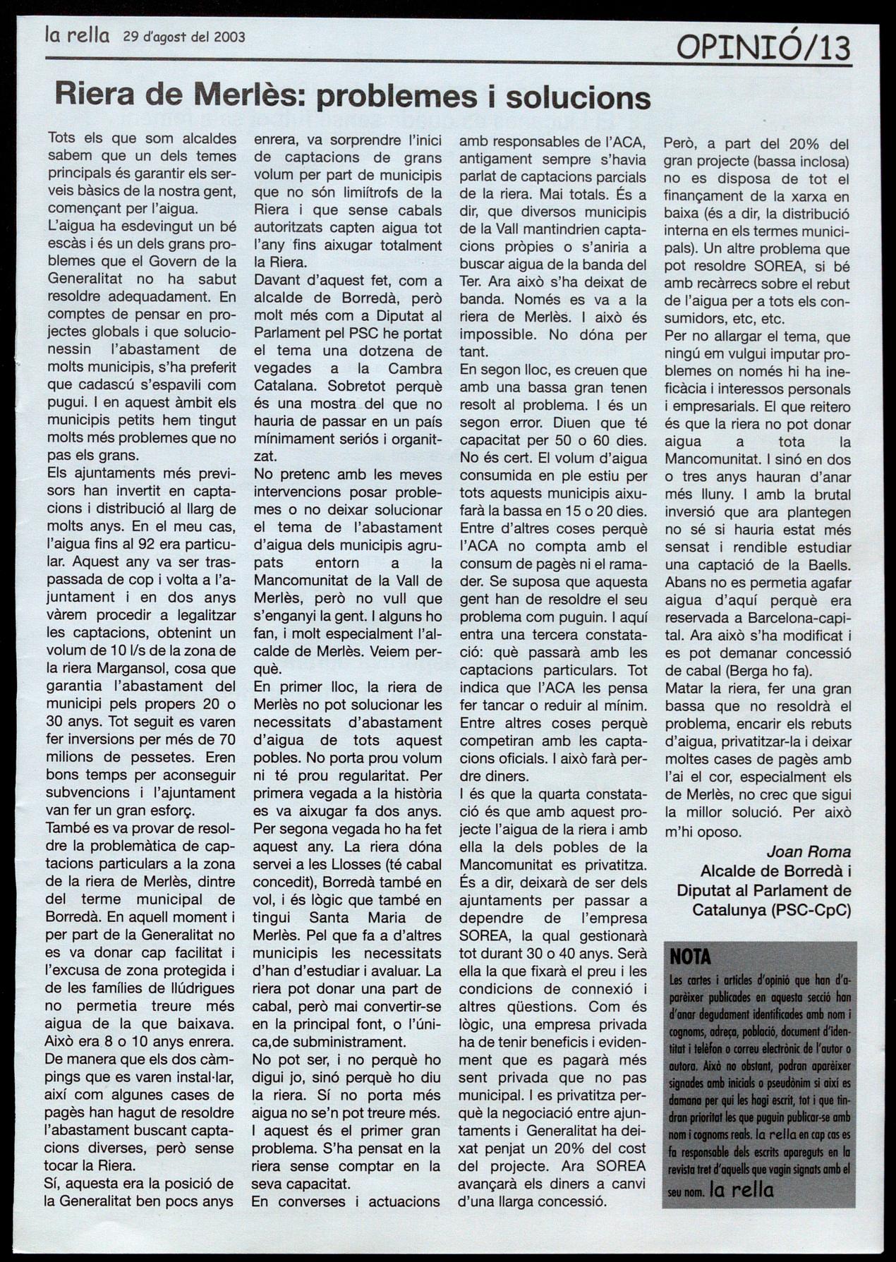 plars vius que es van confinar en instal·lacions adients autoritzades temporalment fins que el gorg torni a reunir les condicions ecològiques adients per a ser altra vegada recol·locades. També s'hi van trobar alguns exemplars morts. La recerca de més bivalbs al fang de la riera continuarà durant els propers dies, donat que aquests animals sobreviuen dins elliot, amb poca quantitat d'aigua. Aquest molusc bivalb necessita per a la seva reproducció de la presència d'espècies de peixos autòctons, com el barb la bagra, que els utilitza com a hoste intermediari. Es per això que es va aprofitar l'actuació per afavorir les espècies autòctones i traslladar o eliminar les al·lòctones. La presència d'aquesta petxina és un indicador de la puresa de l'aigua i la qualitat biològica dels fangs de la riera de Merlès, però es van agafar pocs exemplars, la qual cosa fa témer pel seu futur si no es protegeix l'entorn.Núria Valls