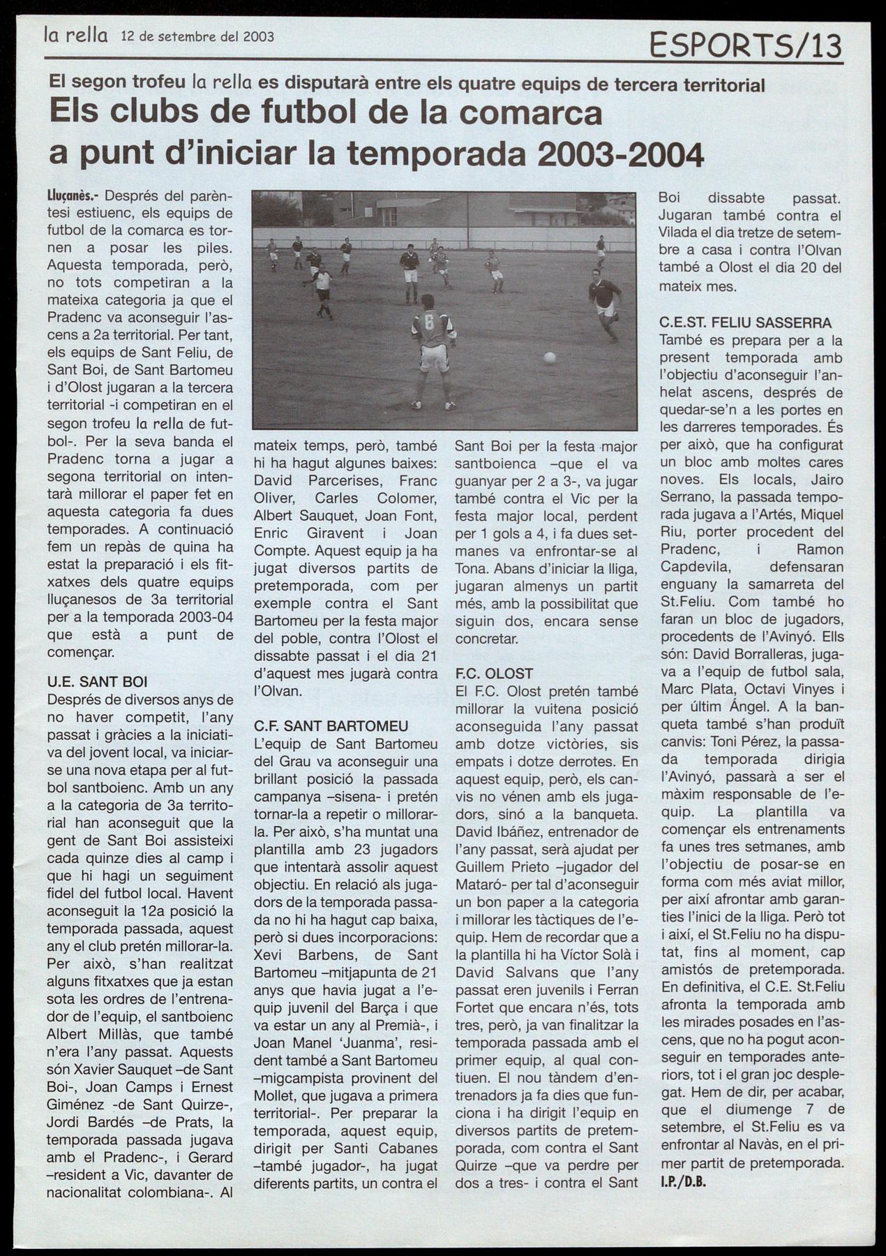L1uçanès.- Després del parèntesi estiuenc, els equips de futbol de la comarca es tornen a posar les piles. Aquesta temporada, però, no tots competiran a la mateixa categoria ja que el Pradenc va aconseguir l'ascens a 2a territorial. Per tant, els equips de Sant Feliu, de Sant Boi, de Sant Bartomeu i d'Olost jugaran a la tercera territorial -i competiran en el segon trofeu la rella de futbol-. Per la seva banda el Pradenc torna a jugar a segona territorial on intentarà millorar el paper fet en aquesta categoria fa dues temporades. A continuació fem un repàs de quina ha estat la preparació i els fitxatxes dels quatre equips lluçanesos de 3a territorial per a la temporada 2003-04 que està a punt de començar.