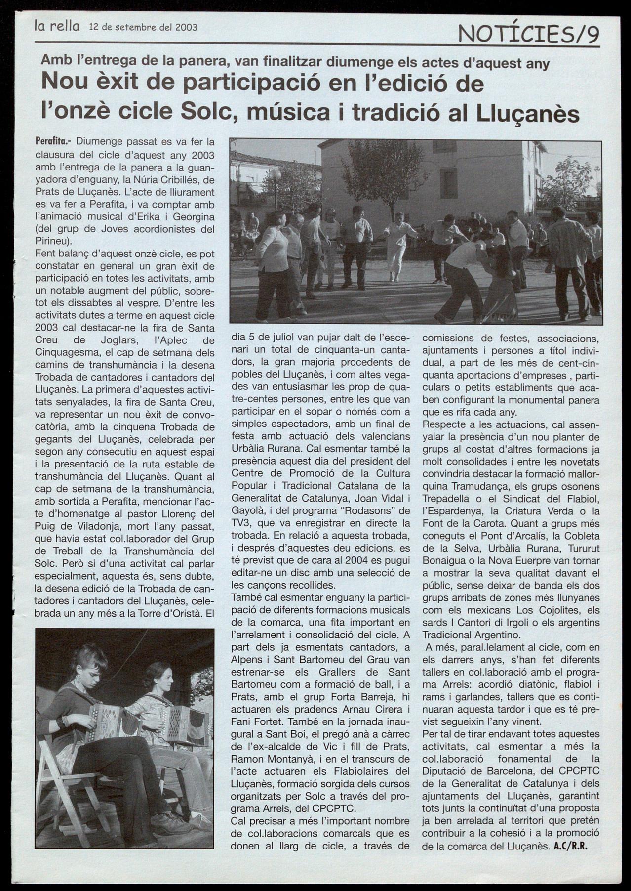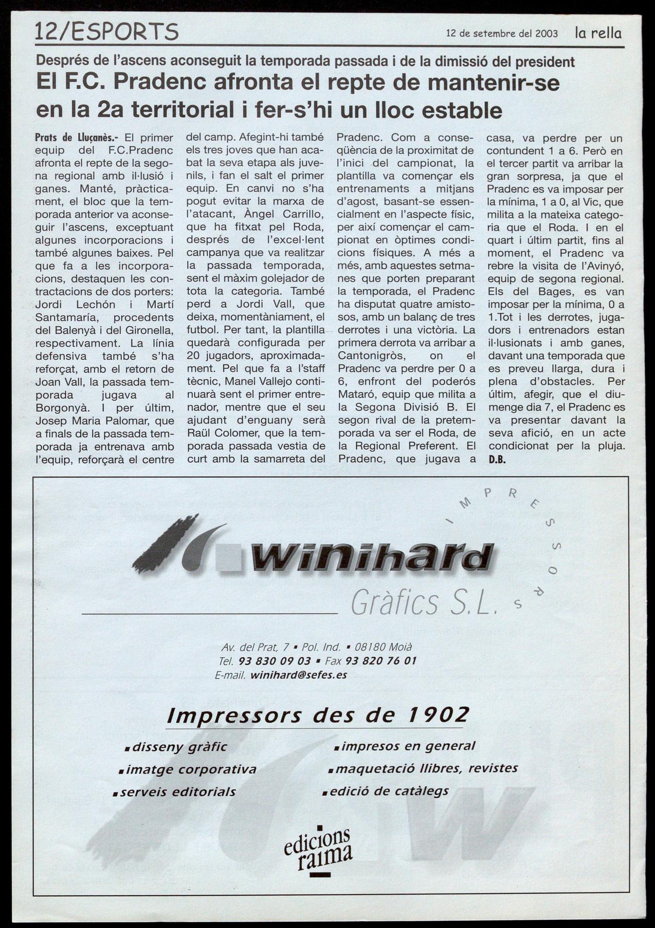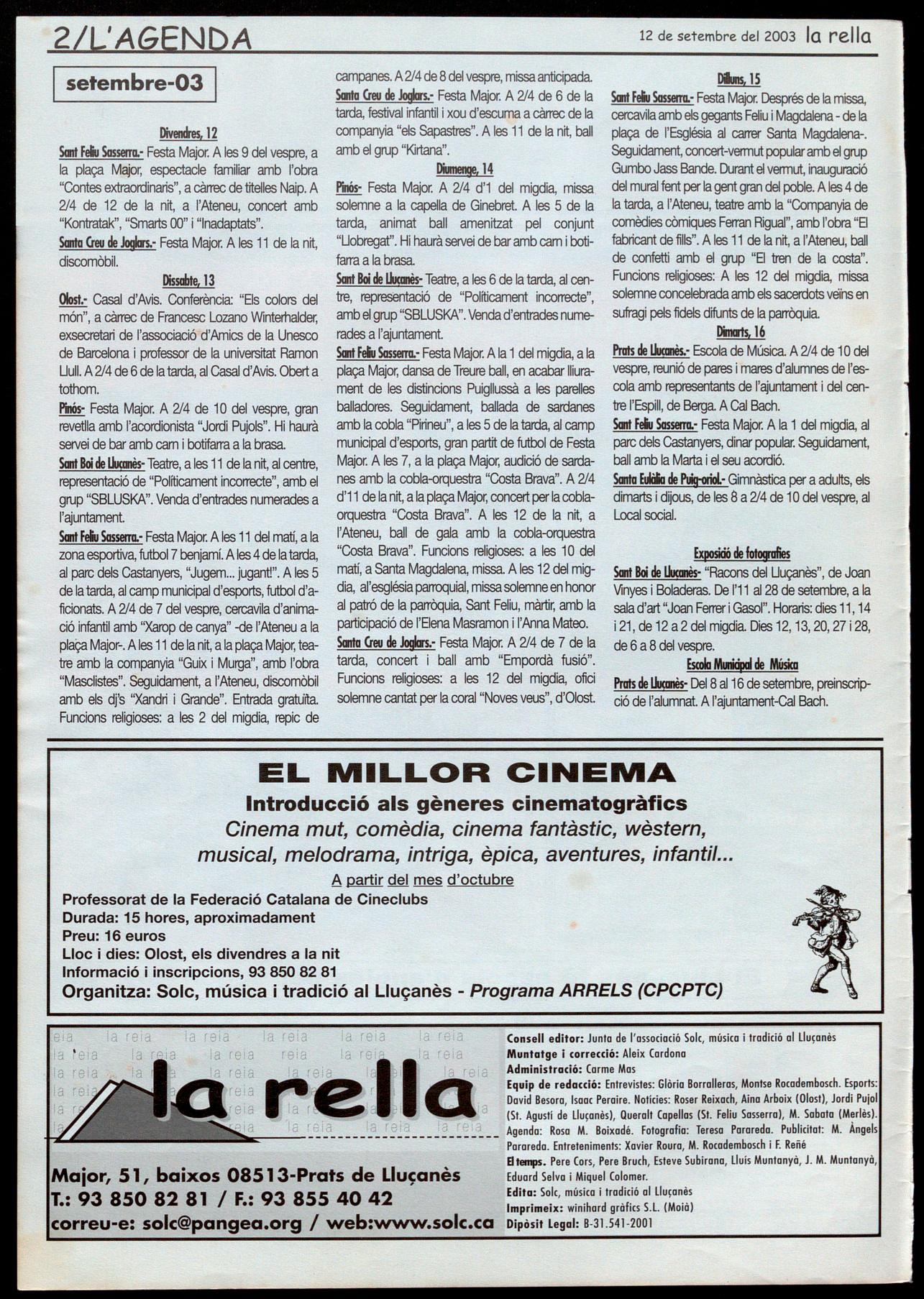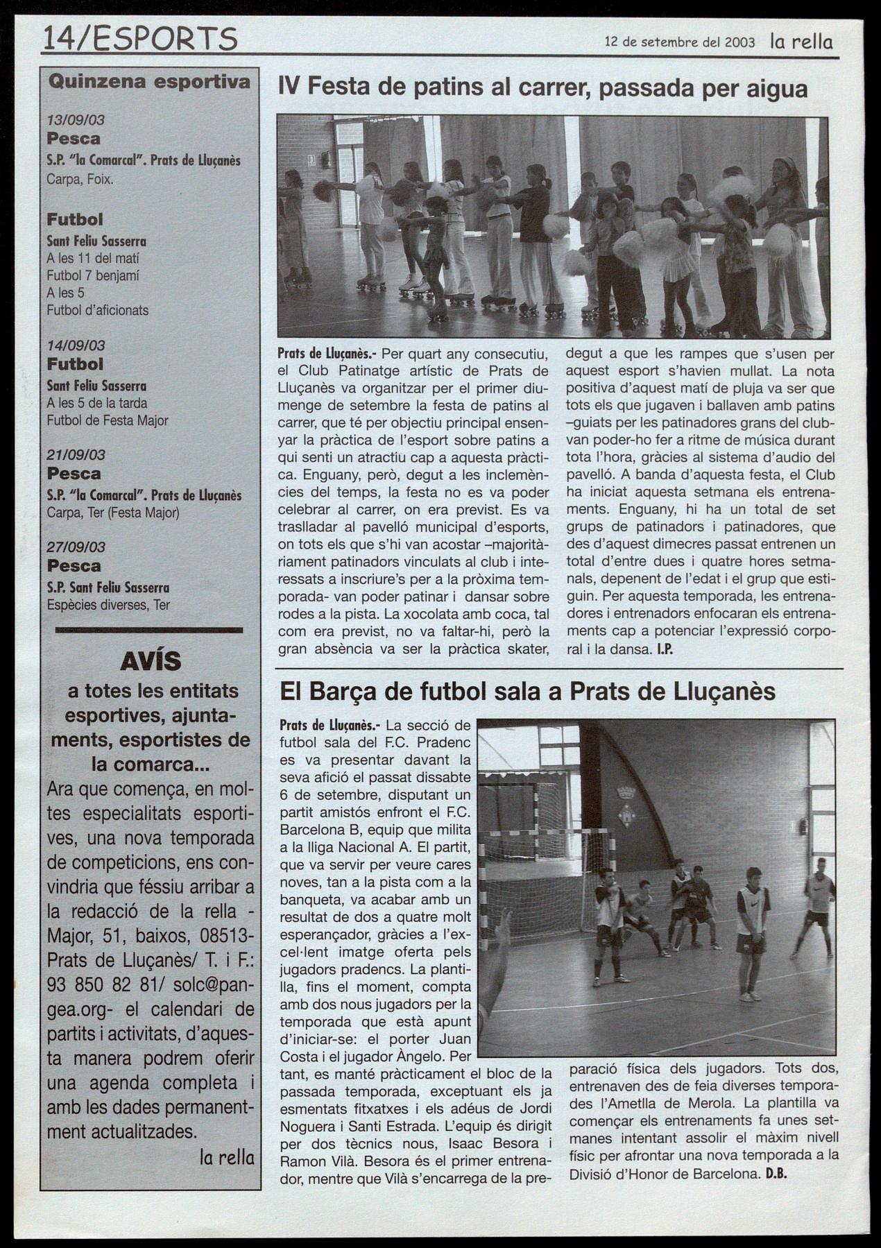 a totes les entitats esportives, ajunta-ments, esportistes de la comarca �ra que comença, en moltes especialitats esportives, una nova temporada de competicions, ens convindria que féssiu arribar a la redacció de la rellaMajor, 51, baixos, 08513Prats de L1uçanès/ T. i F.: 93 850 82 81/ solc@pangea.org- el calendari de partits activitats, d'aquesta manera podrem oferir una agenda completa i amb les dades permanentment actualitzades.