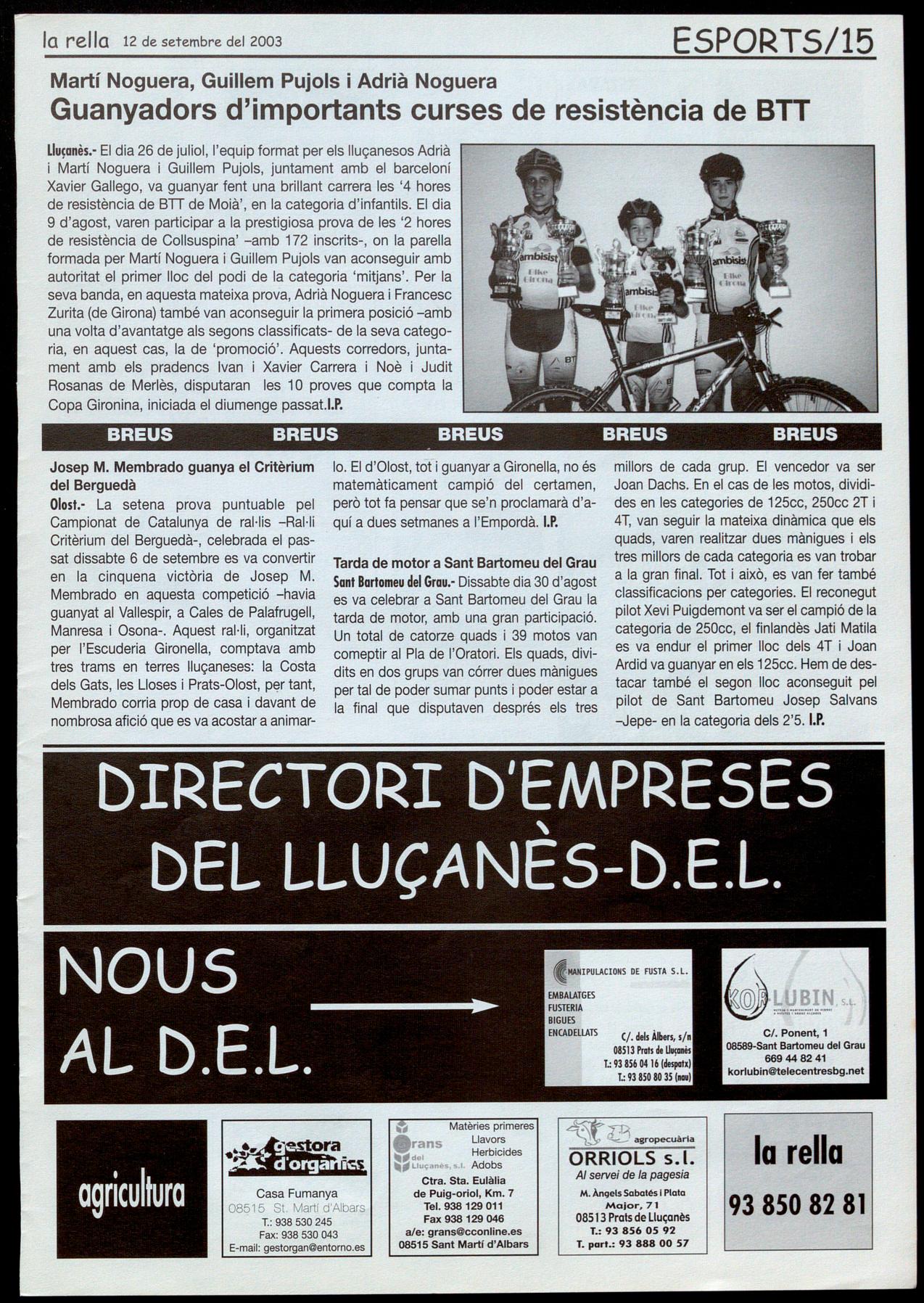 Llu�anès." El dia 26 de juliol, l'equip format per els lluçanesos Adrià Martí Noguera Guillem Pujols, juntament amb el barceloní Xavier Gallego, va guanyar fent una brillant carrera les '4 hores de resistència de BTf de Moià', en la categoria d'infantils. El dia 9 d'agost, varen participar a la prestigiosa prova de les '2 hores de resistència de Collsuspina' -amb 172 inscrits-, on la parella formada per Martí Noguera i Guillem Pujols van aconseguir amb autoritat el primer lloc del podi de la categoria 'mitjans'. Per la seva banda, en aquesta mateixa prova, Adrià Noguera i Francesc Zurita (de Girona) també van aconseguir la primera posició -amb una volta d'avantatge als segons classificats- de la seva categoria, en aquest cas, la de 'promoció'. Aquests corredors, juntament amb els pradencs Ivan Xavier Carrera i Noè Judit Rosanas de Merlès, disputaran les 10 proves que compta la Copa Gironina, iniciada el diumenge passaU.P.